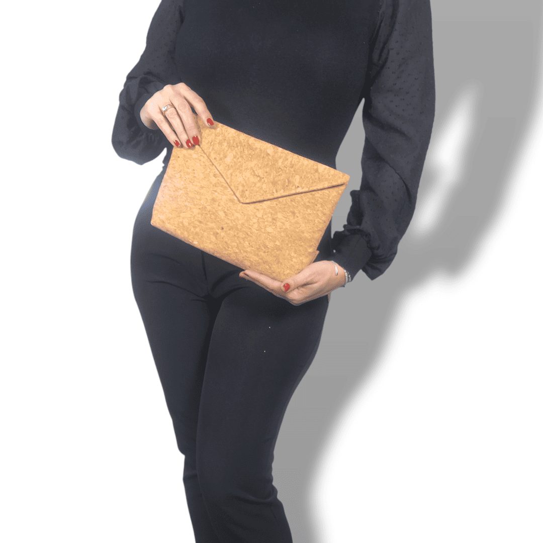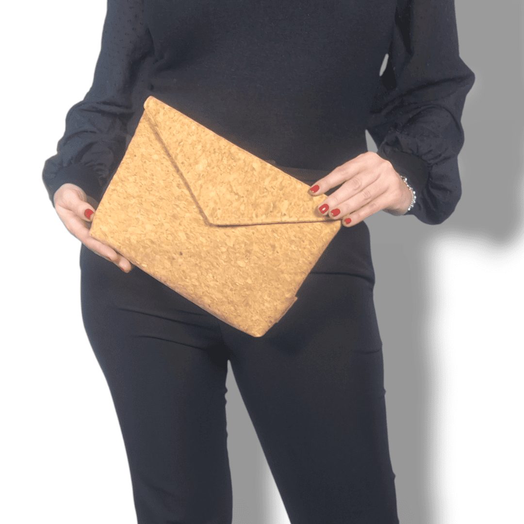 Handmade clutch with magnetic snap closure. Made from natural cork fabric. Spacious interior with a zippered pocket and an additional open pocket.