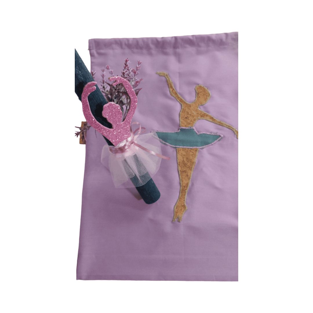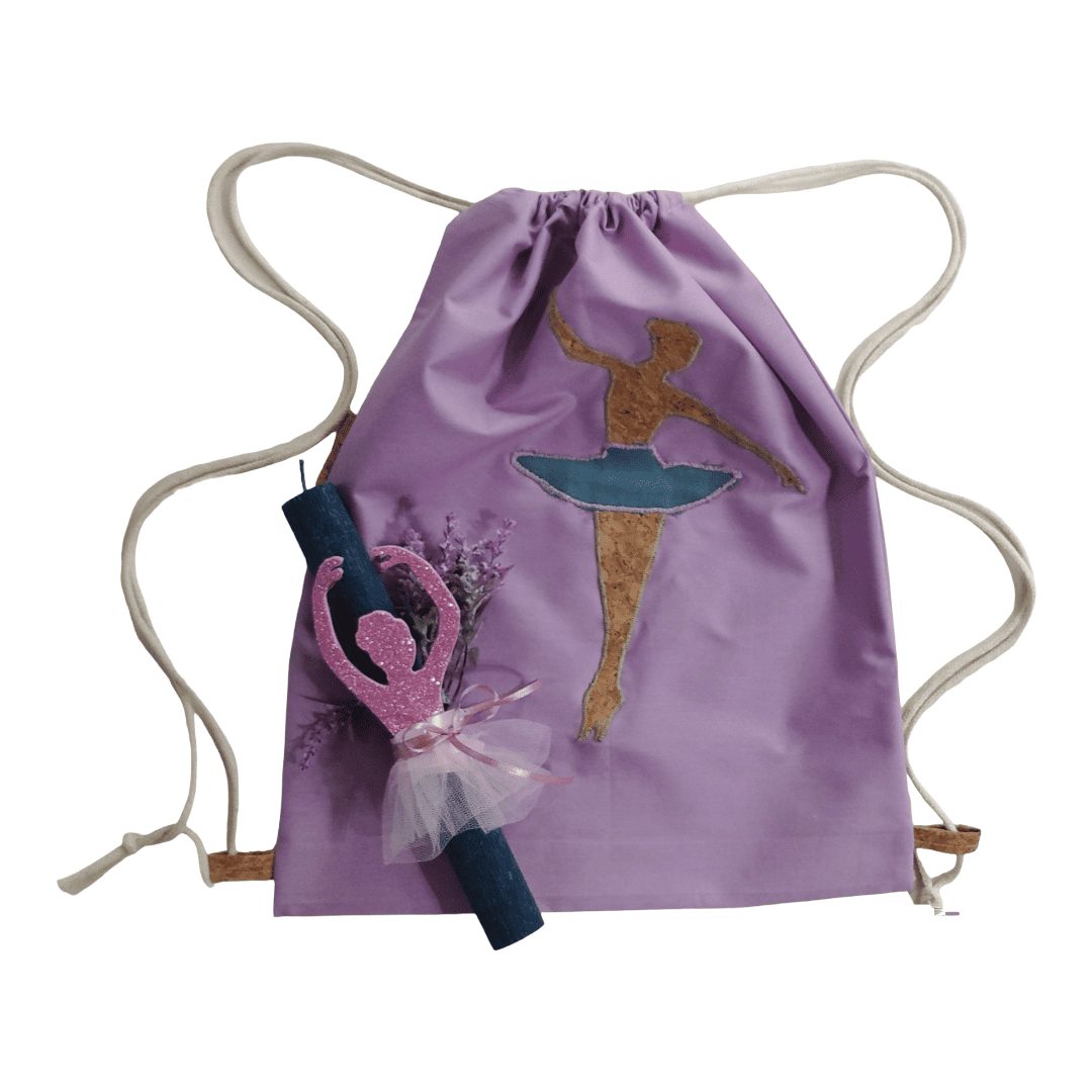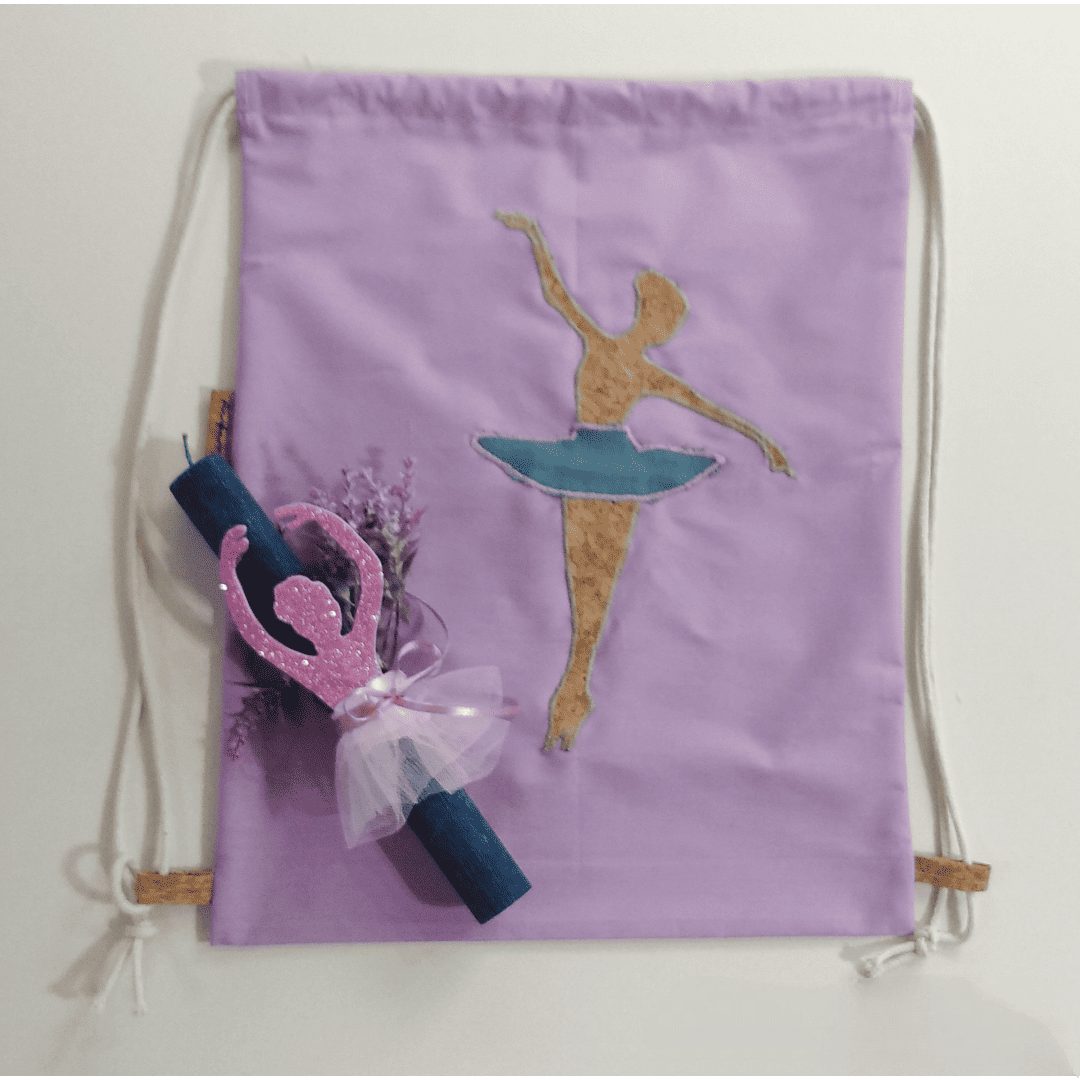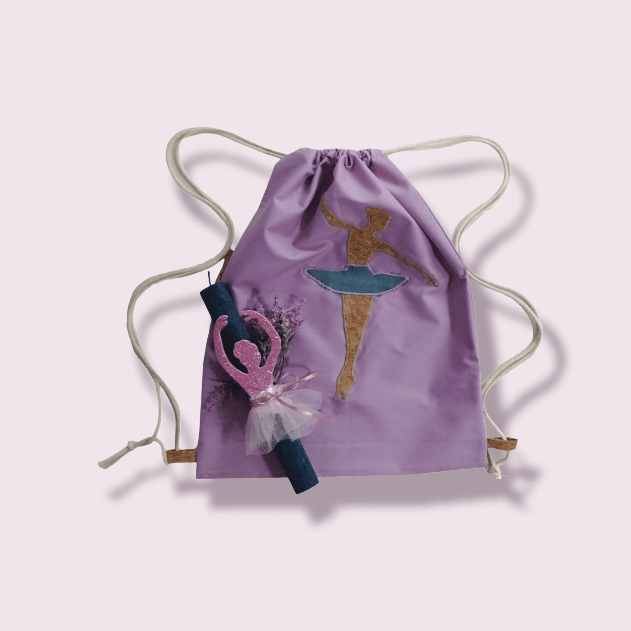 Handmade gift set. Includes a candle and a drawstring backpack. Features a unique ballerina design. The backpack is made of lilac cotton fabric and has drawstrings that close the bag and serve as shoulder straps for the child to wear on their back.