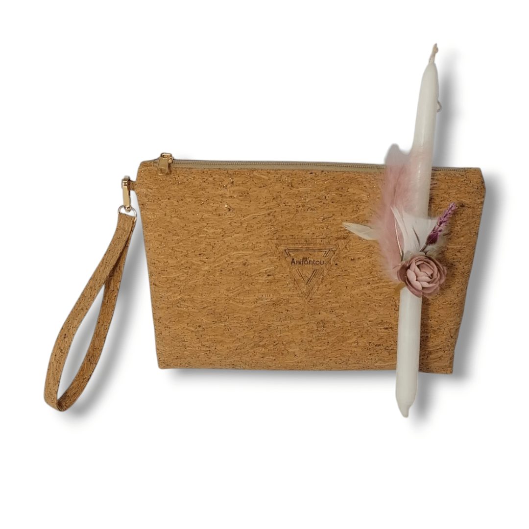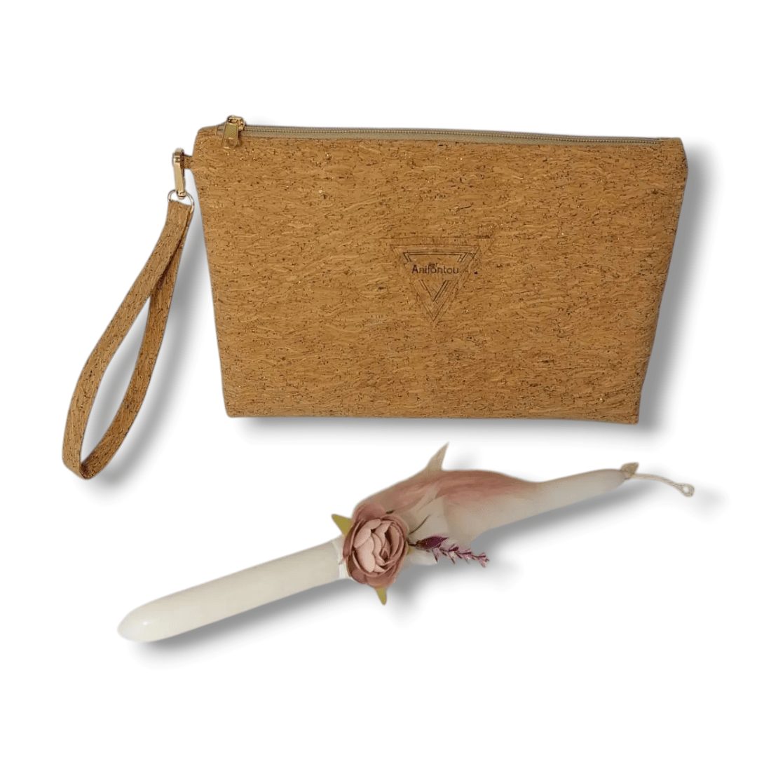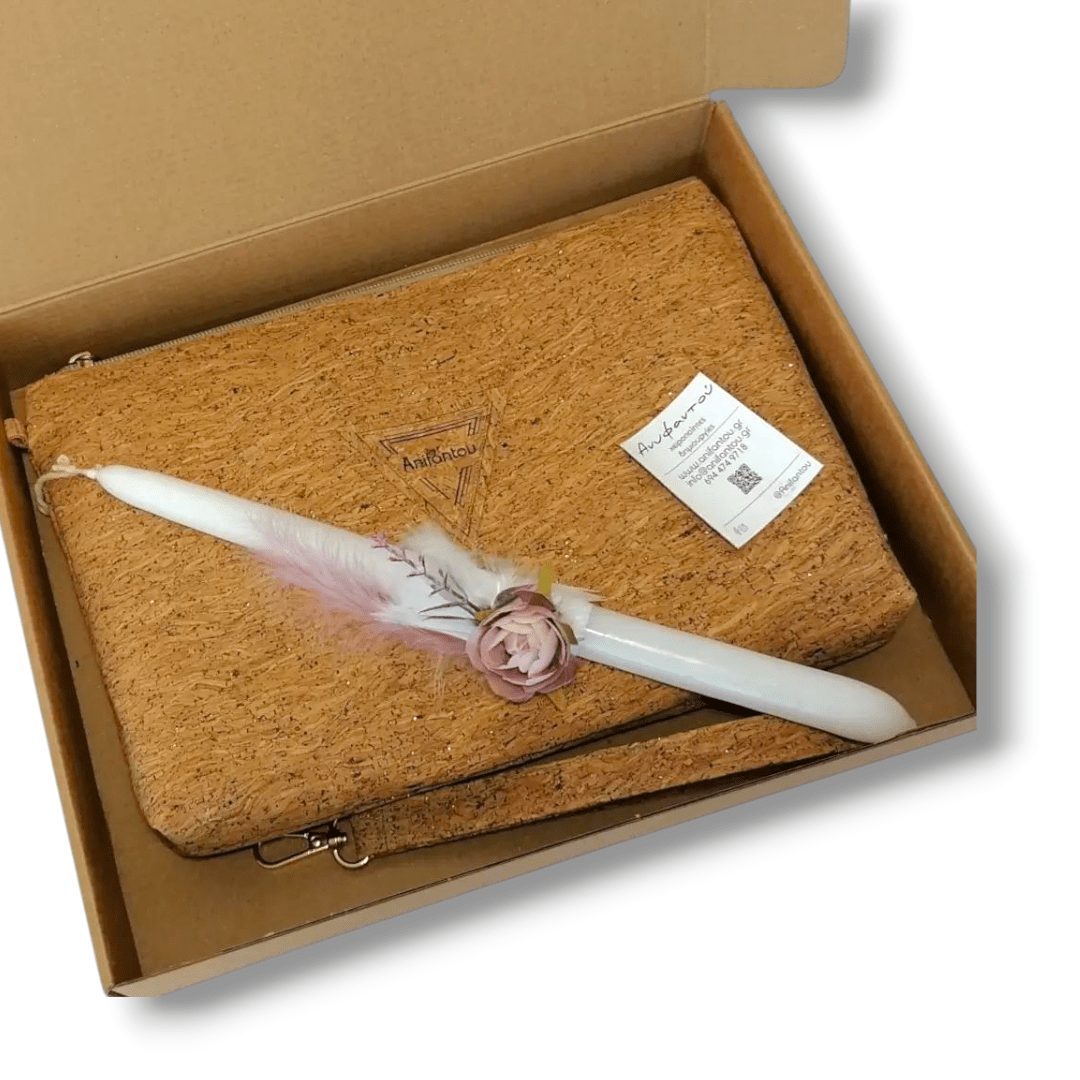 Χειροποίητο, σετ δώρου. Περιλαμβάνει μία λαμπάδα και μια χειροποίητη τσάντα χειρός. Η τσάντα είναι φτιαγμένη από ύφασμα φελλού και διαθέτει λουράκι καρπού. Κλείσιμο με φερμουάρ.