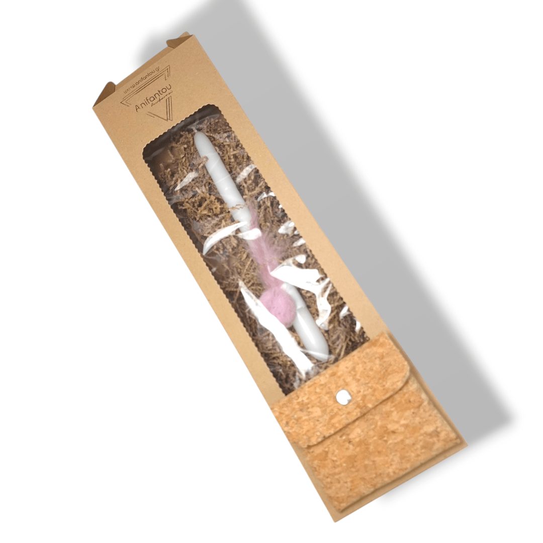 Χειροποίητο, σετ δώρου. Περιλαμβάνει μία λαμπάδα με ένα πορτοφολάκι. Το πορτοφολάκι είναι από ύφασμα φελλού. Κλείσιμο με κουμπί.