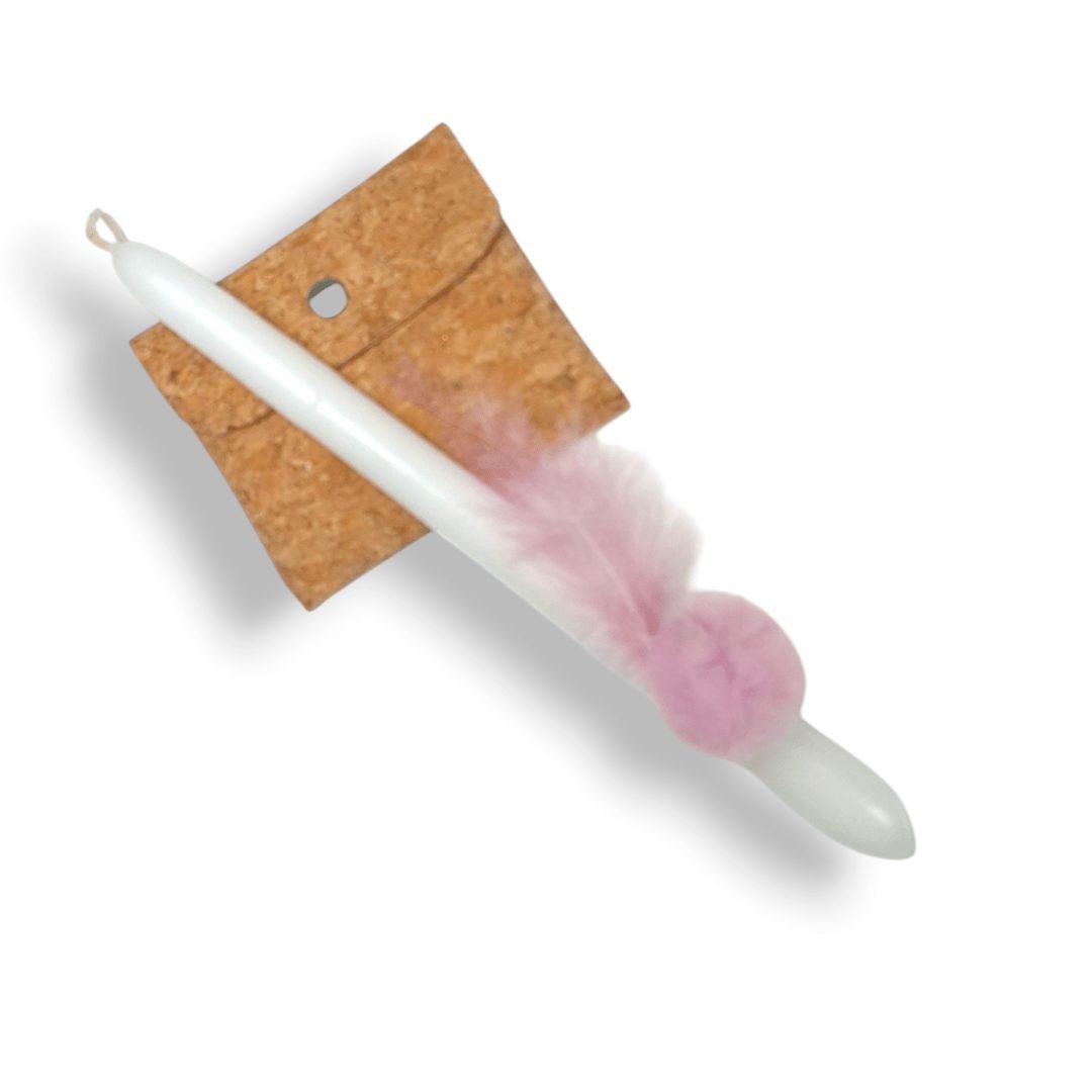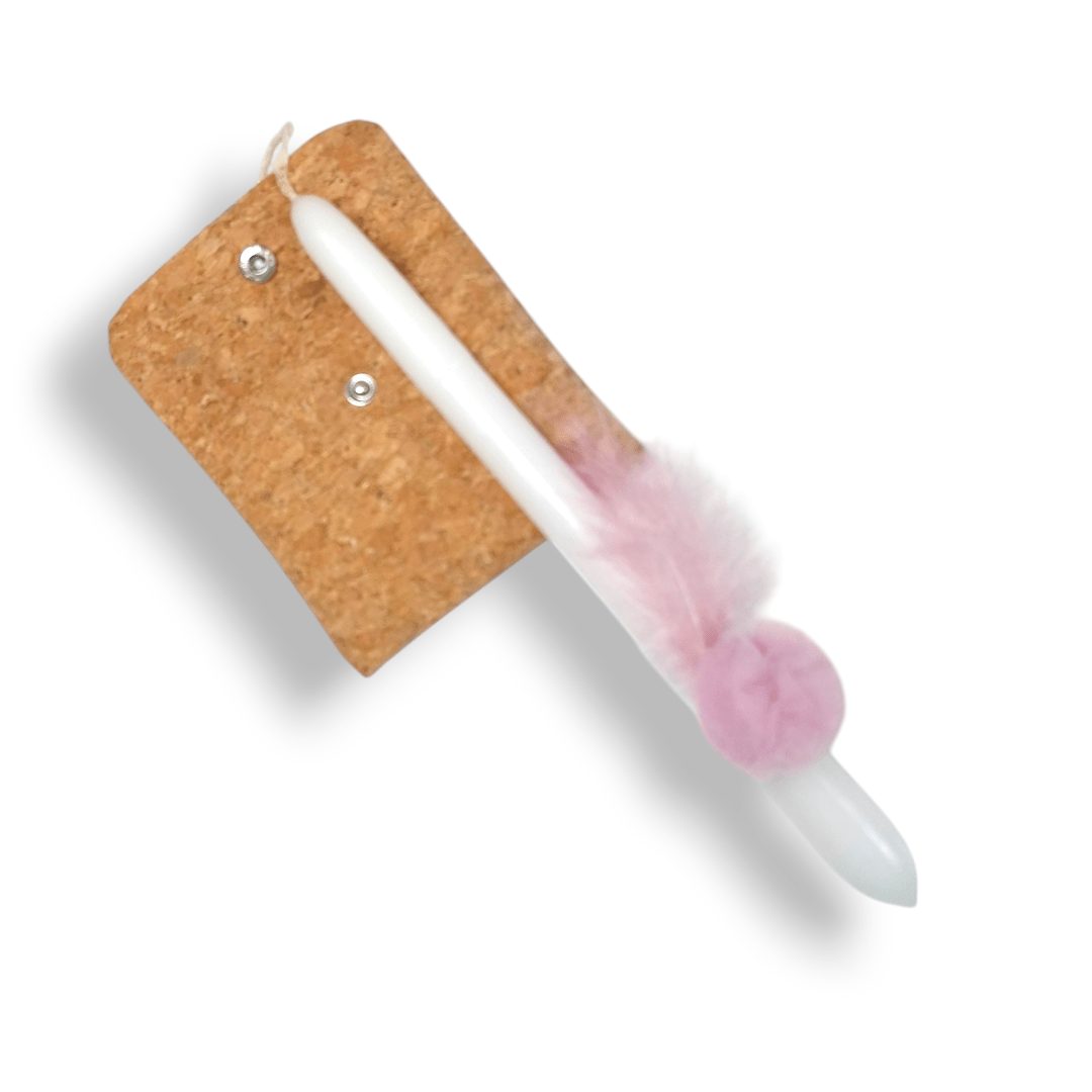 - Λευκό κερί διακοσμημένο με πούπουλο και μπάλα από τούλι.