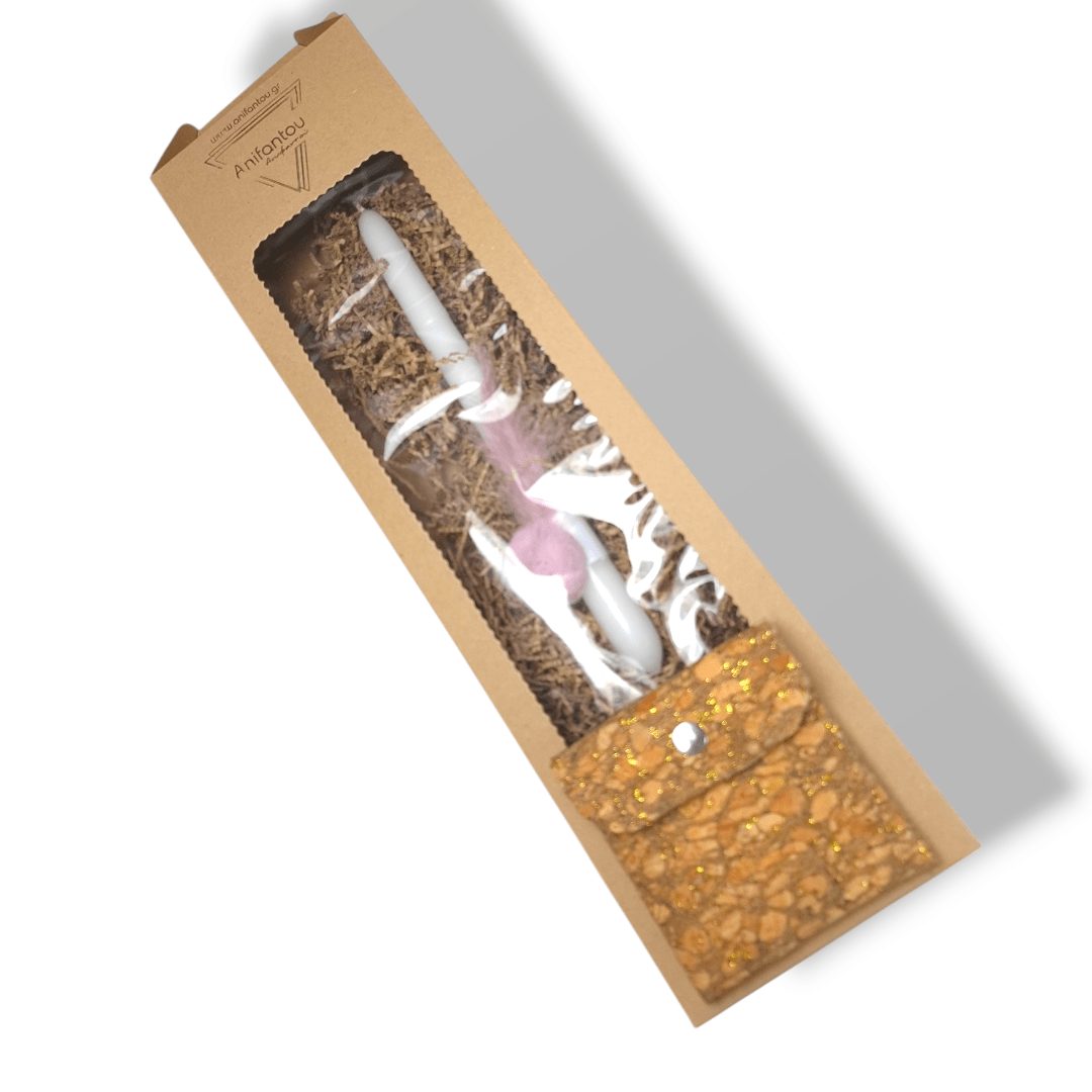 Χειροποίητο, σετ δώρου. Περιλαμβάνει μία λαμπάδα με ένα πορτοφολάκι. Το πορτοφολάκι είναι από ύφασμα φελλού με χρυσαλλίδες. Κλείσιμο με κουμπί.