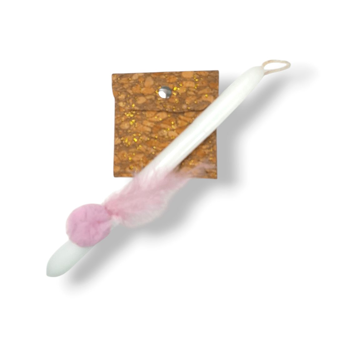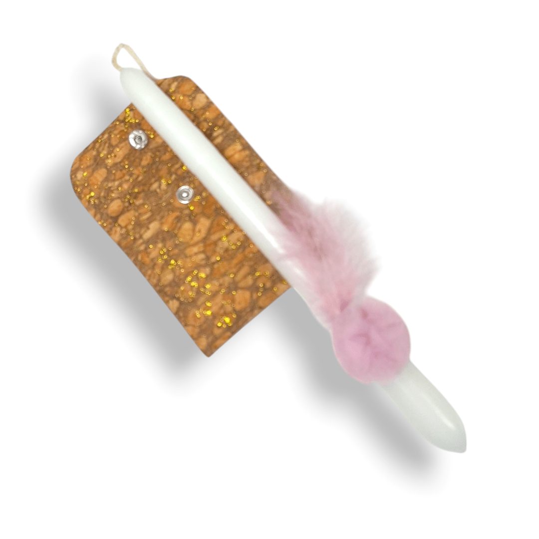 - Λευκό κερί διακοσμημένο με πούπουλο και μπάλα από τούλι.