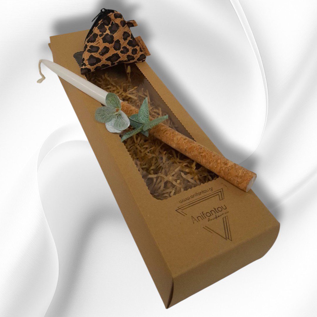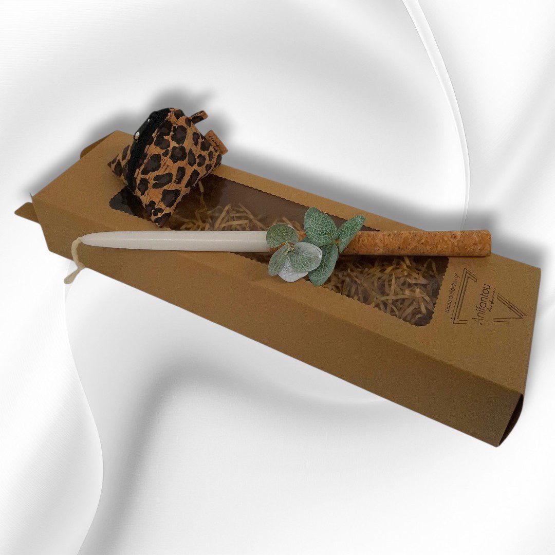 Χειροποίητο Πασχαλινό σετ δώρου. Περιλαμβάνει μία λαμπάδα και ένα πορτοφολάκι από φελλό σε σχήμα πυραμίδας. Το πορτοφολάκι είναι από ύφασμα φελλού Leopard. Κλείσιμο με φερμουάρ.