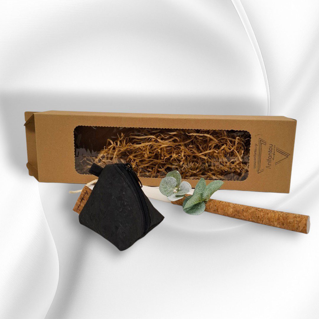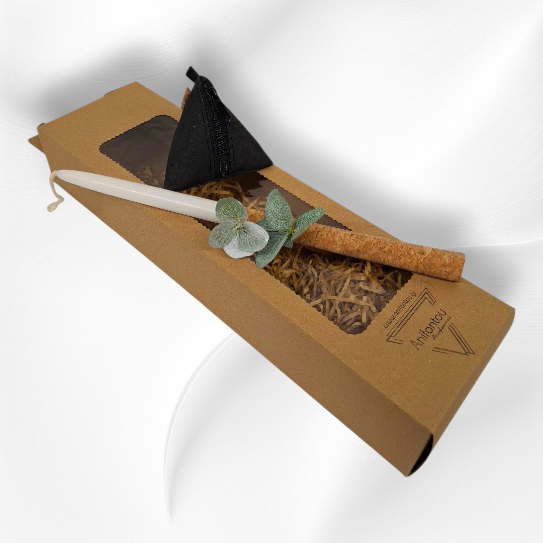 Χειροποίητο Πασχαλινό σετ δώρου. Περιλαμβάνει μία λαμπάδα και ένα πορτοφολάκι από φελλό σε σχήμα πυραμίδας. Το πορτοφολάκι είναι από ύφασμα μαύρου φελλού. Κλείσιμο με φερμουάρ.