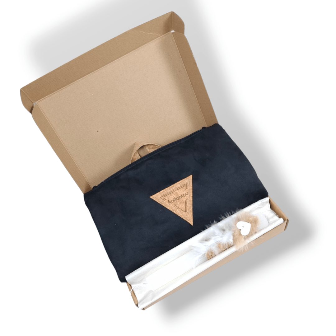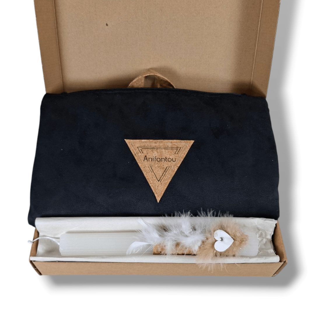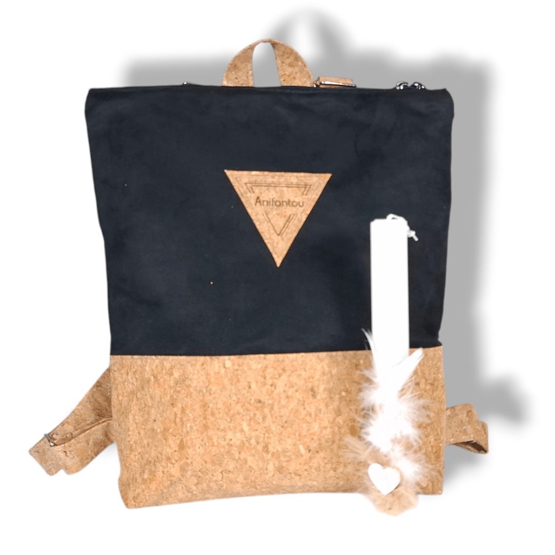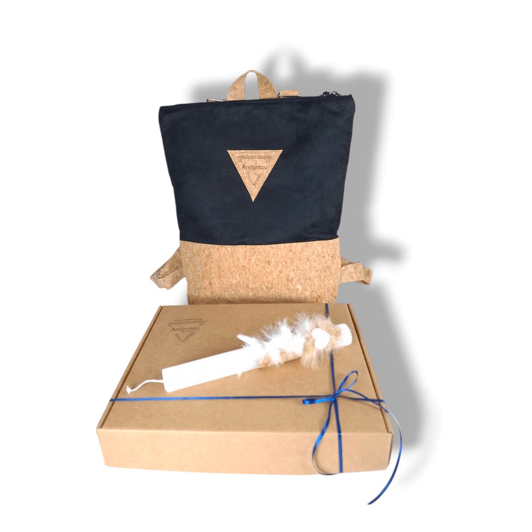 Χειροποίητο, σετ δώρου. Περιλαμβάνει μία λαμπάδα και μια χειροποίητη τσάντα πλάτης. Η τσάντα είναι κατασκευασμένη από ύφασμα φελλού και μαύρο σουέτ ύφασμα. Διαθέτει ρυθμιζόμενους ιμάντες από φελλό. Κλείσιμο με φερμουάρ.