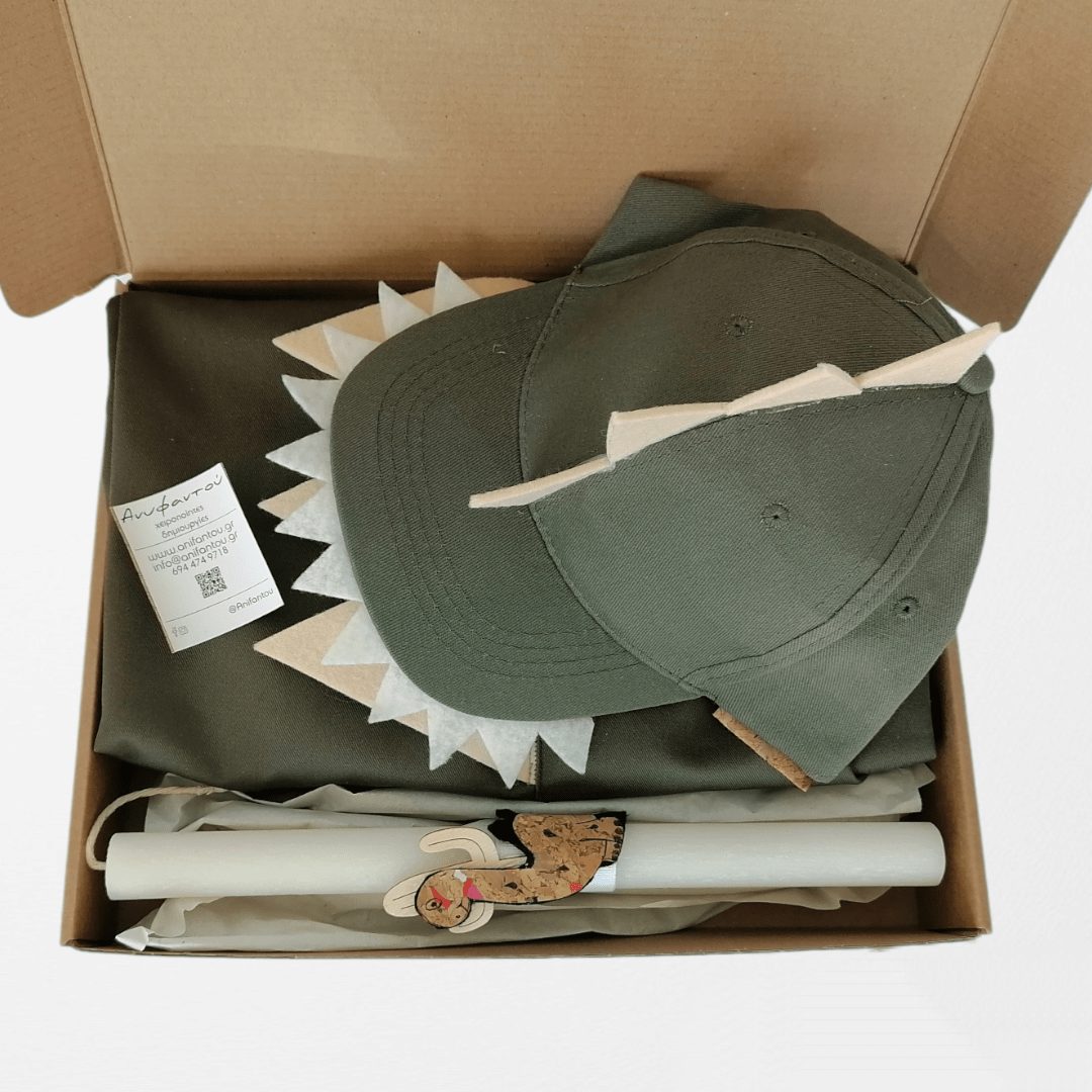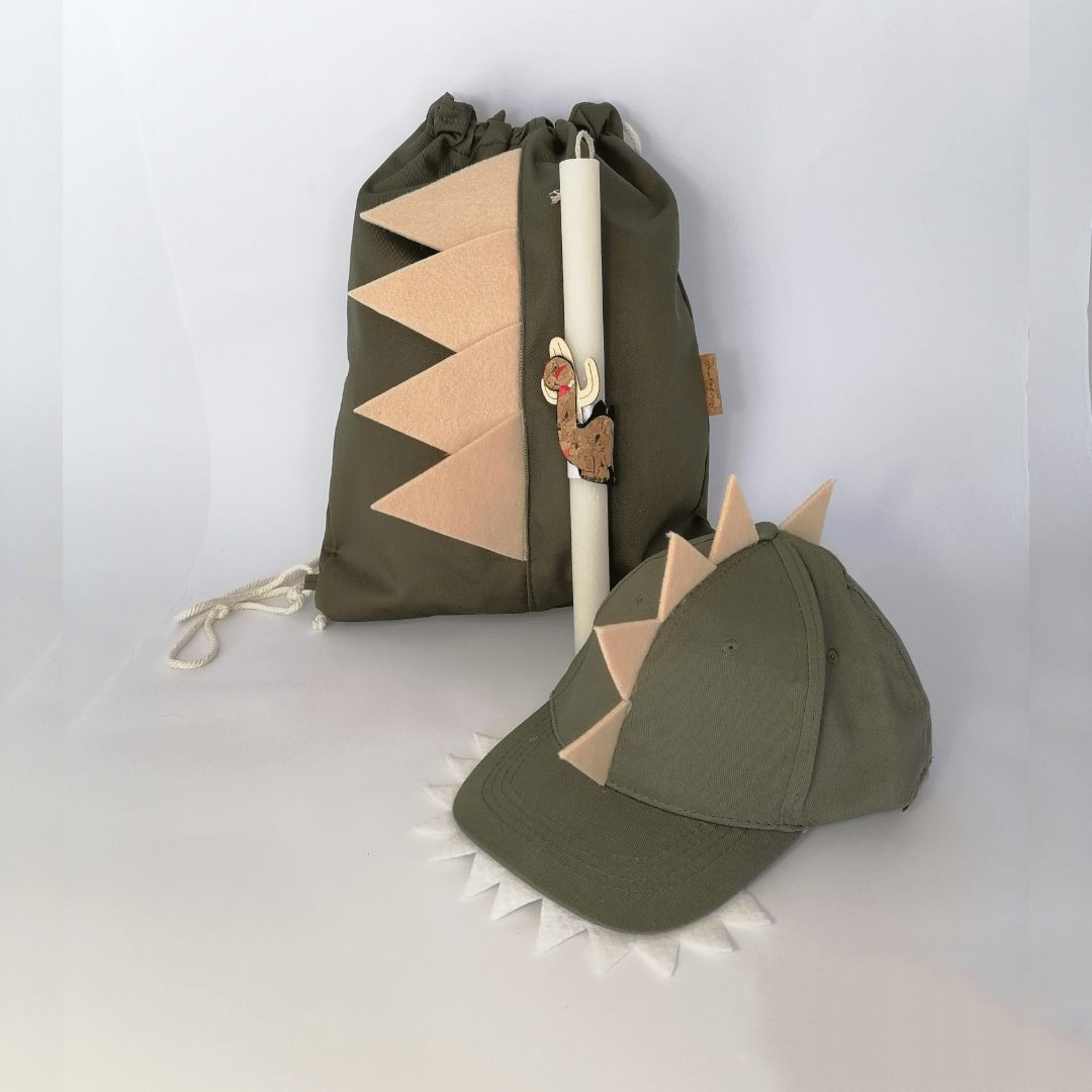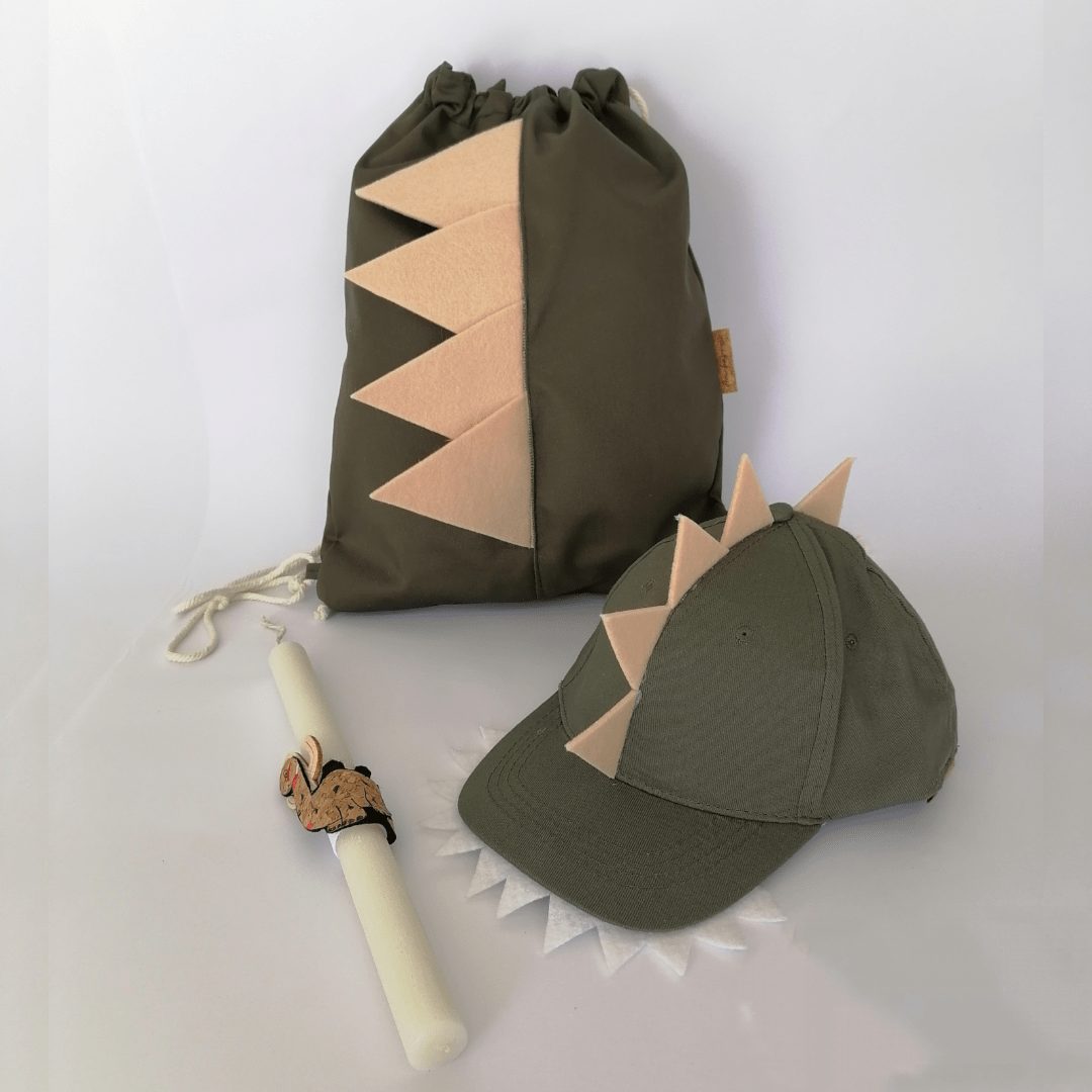 Χειροποίητο, σετ δώρου. Περιλαμβάνει μία λαμπάδα, ένα σακίδιο πλάτης με κορδόνια και ένα καπέλο Jockey. Με ξεχωριστό σχέδιο, εμπνευσμένα από το δεινόσαυρο. Το σακίδιο είναι από βαμβακερό χακί ύφασμα. Διαθέτει κορδόνια τα οποία κλείνουν την τσάντα αλλά και καταλήγουν στους ώμους του παιδιού για κράτημα στην πλάτη.