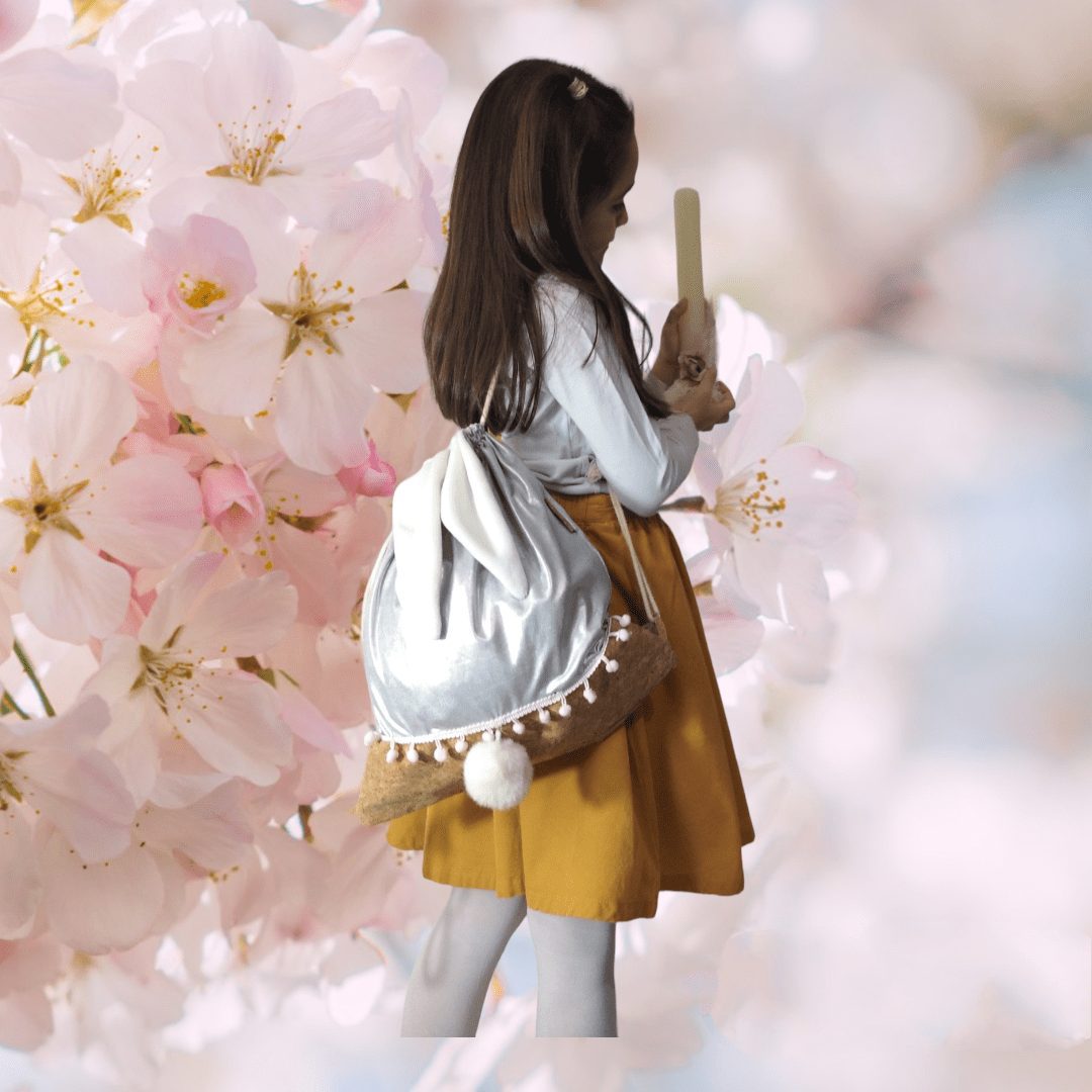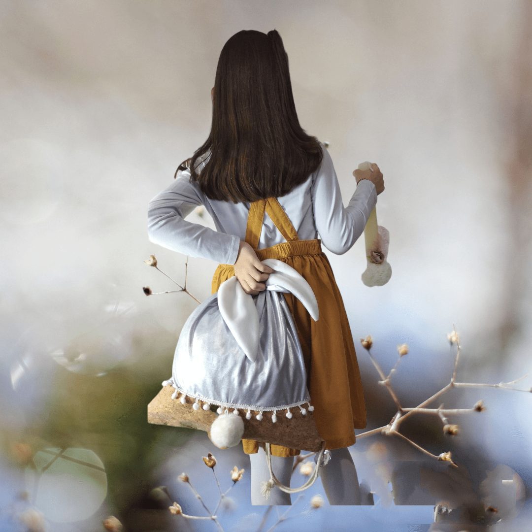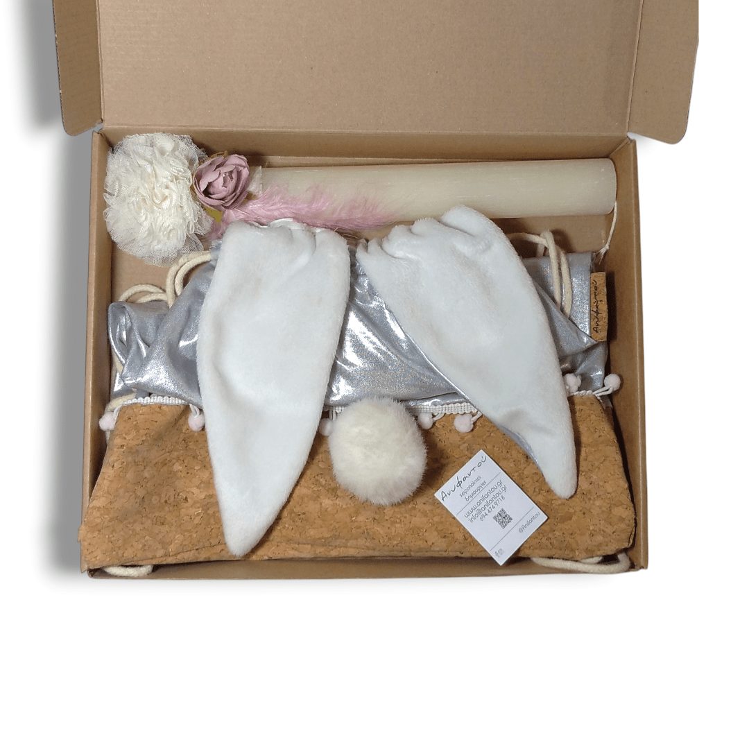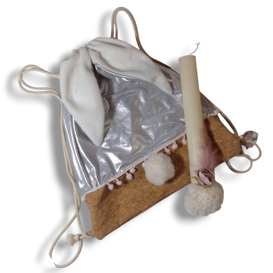 Χειροποίητο, σετ δώρου. Περιλαμβάνει μία λαμπάδα με ένα σακίδιο πλάτης με κορδόνια. Με ξεχωριστό σχέδιο, κουνελάκι. Το σακίδιο είναι από γυαλιστερό ασημί ύφασμα συνδυασμένο με ύφασμα φελλού.