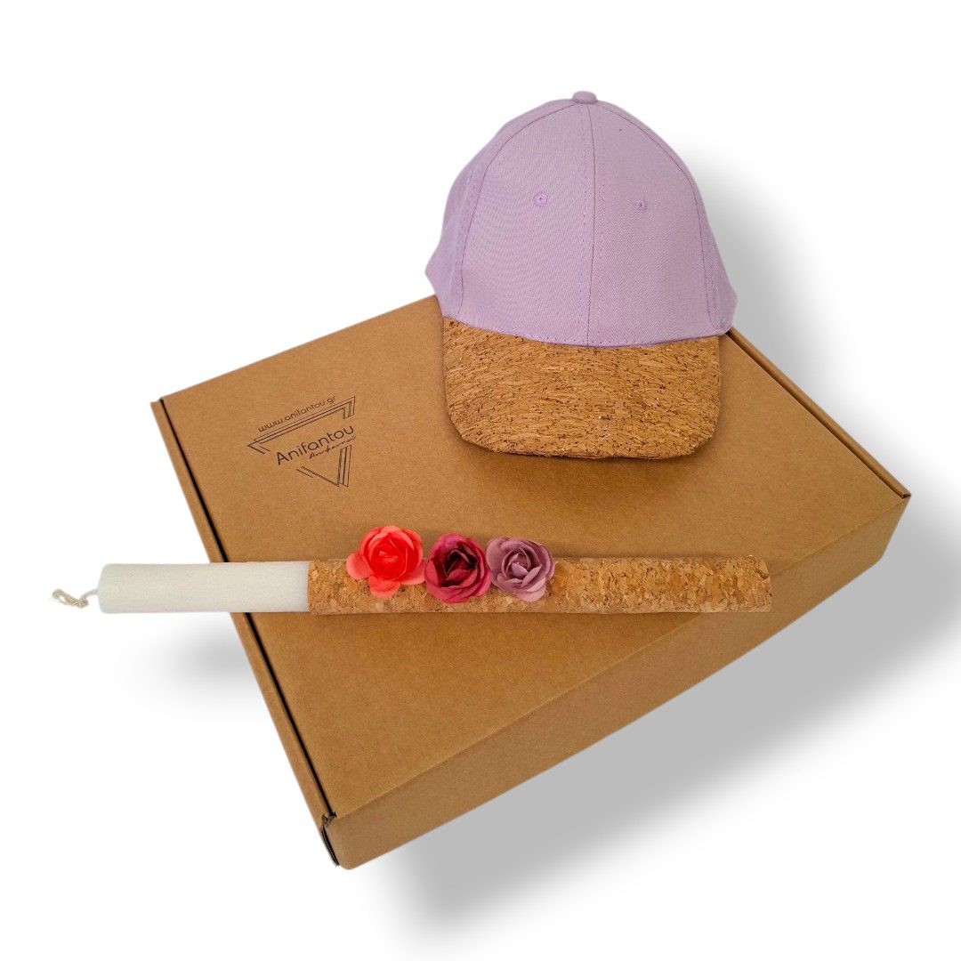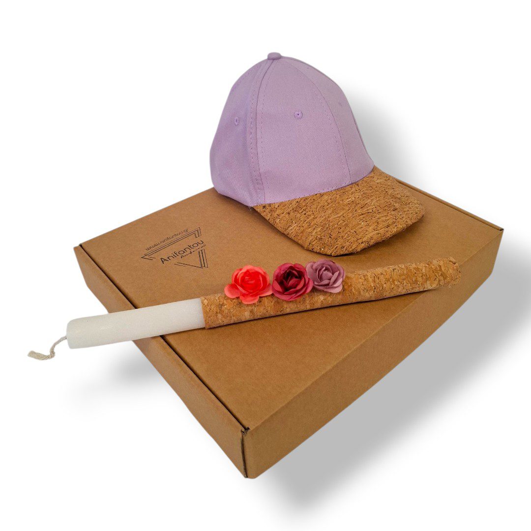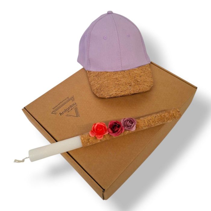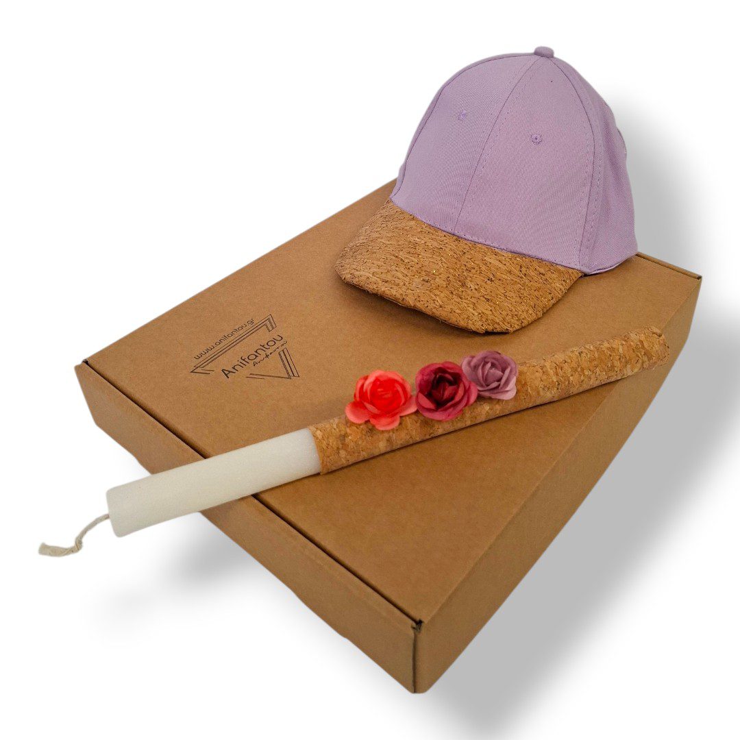 Χειροποίητο πασχαλινό σετ δώρου. Περιλαμβάνει μία λαμπάδα και ένα καπέλο. Το καπέλο είναι από λιλά βαμβακερό ύφασμα με γείσο από φελλό.