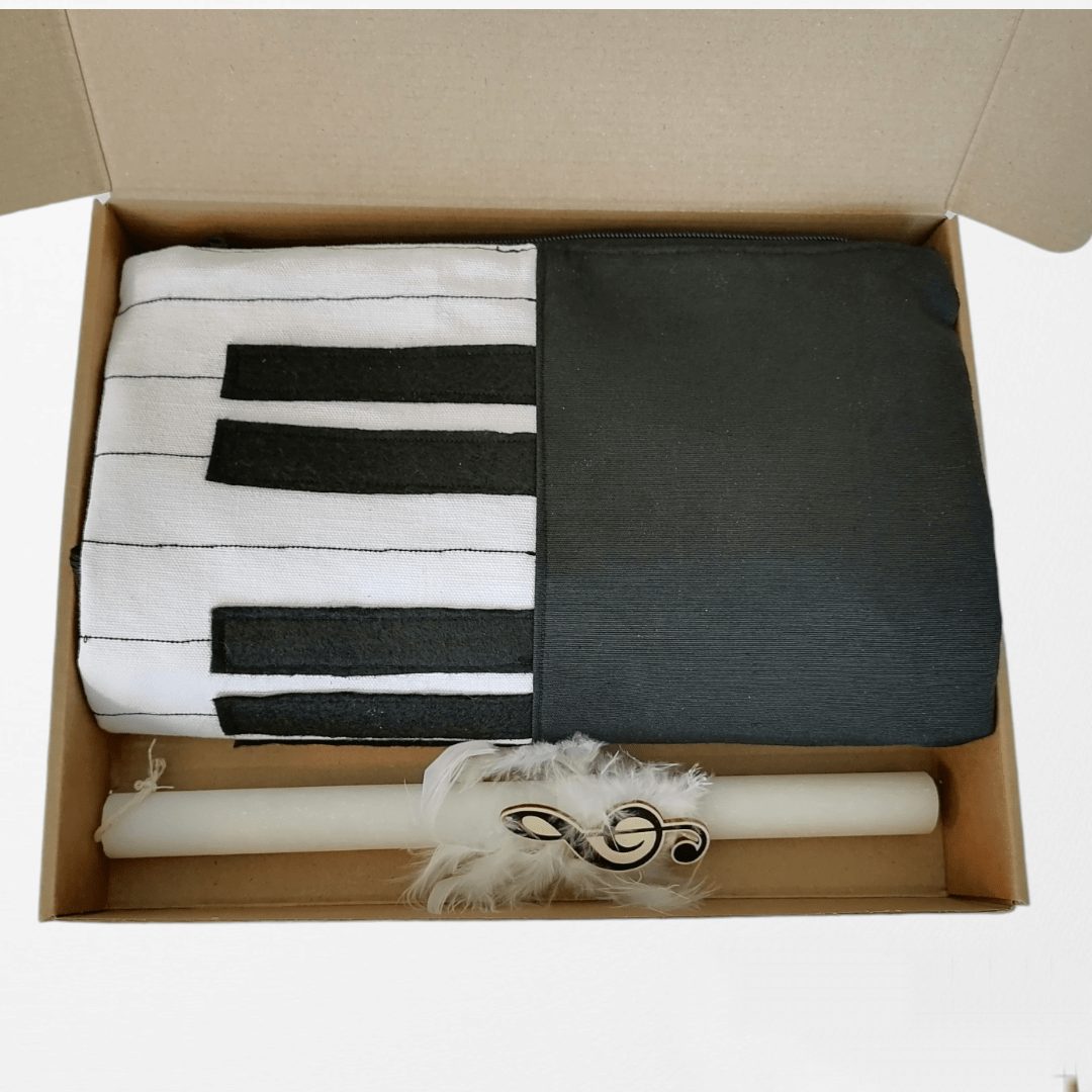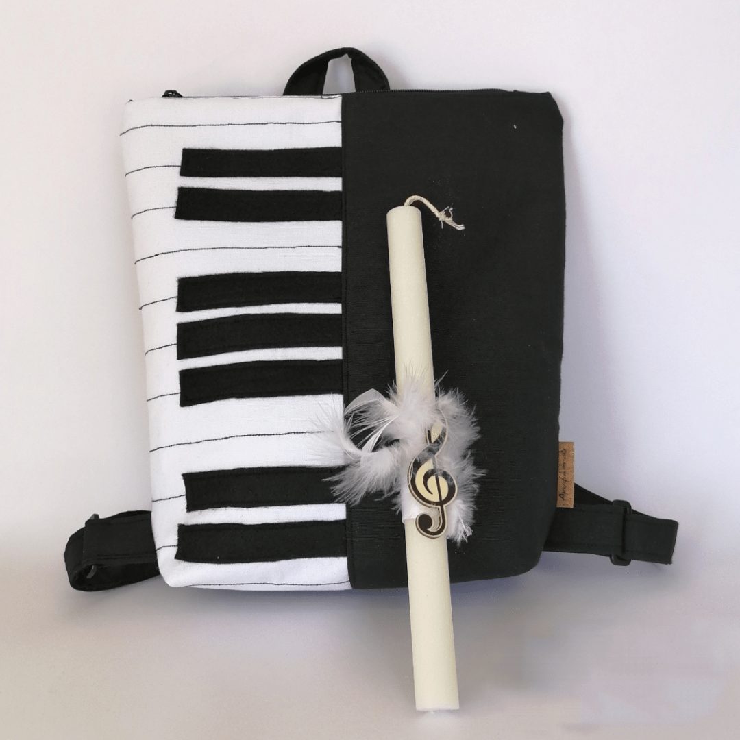 Χειροποίητο, σετ δώρου. Περιλαμβάνει μία λαμπάδα με ένα σακίδιο πλάτης. Με ξεχωριστό σχέδιο πιάνου. Το σακίδιο είναι από βαμβακερό μαύρο ύφασμα. Κλείσιμο με φερμουάρ, με διπλούς οδηγούς για μεγαλύτερη άνεση στο άνοιγμα της. Διαθέτει ρυθμιζόμενους ιμάντες από βαμβακερό ύφασμα. Ευρύχωρο εσωτερικό, με τσέπη που κλείνει με φερμουάρ και επιπλέον ανοιχτή τσέπη.