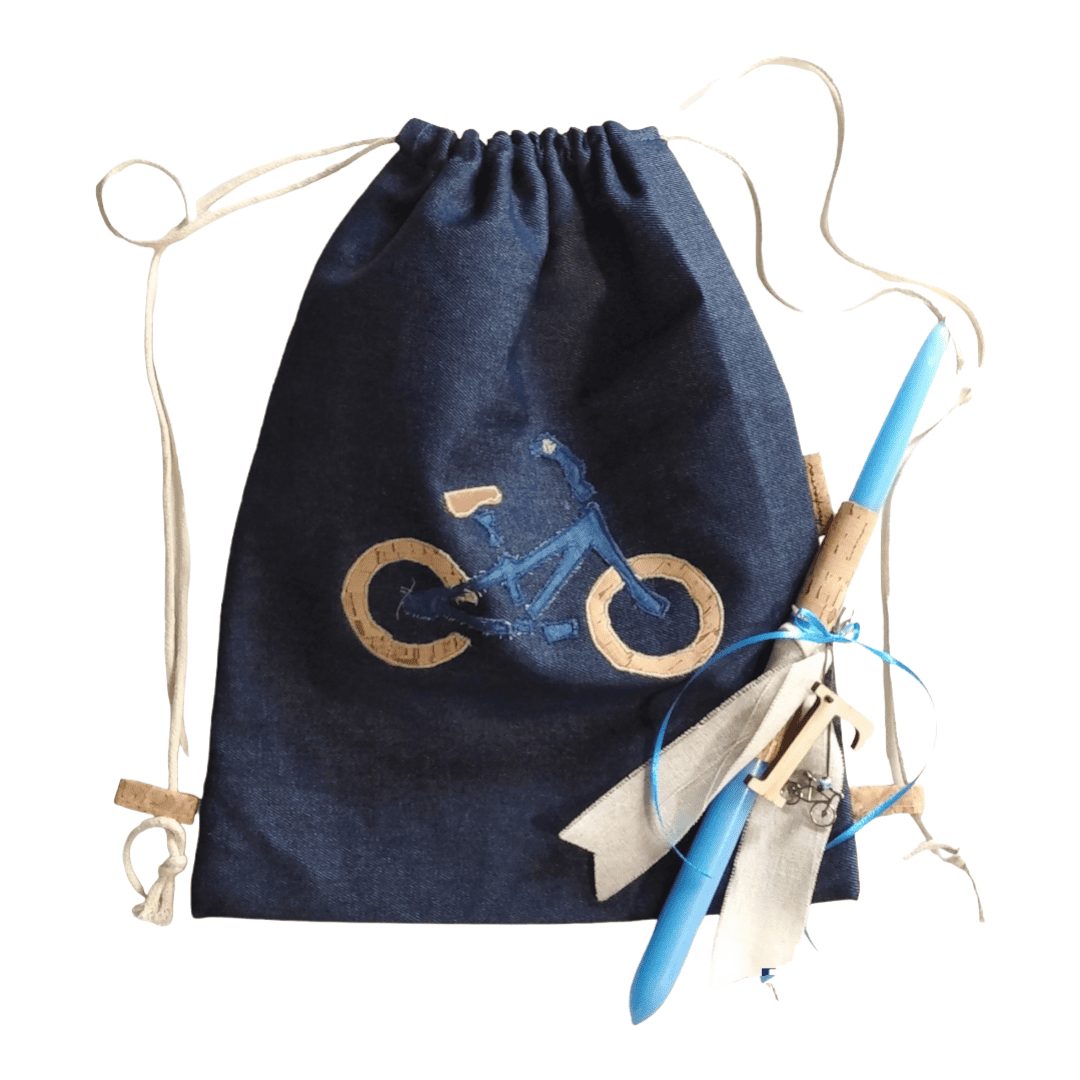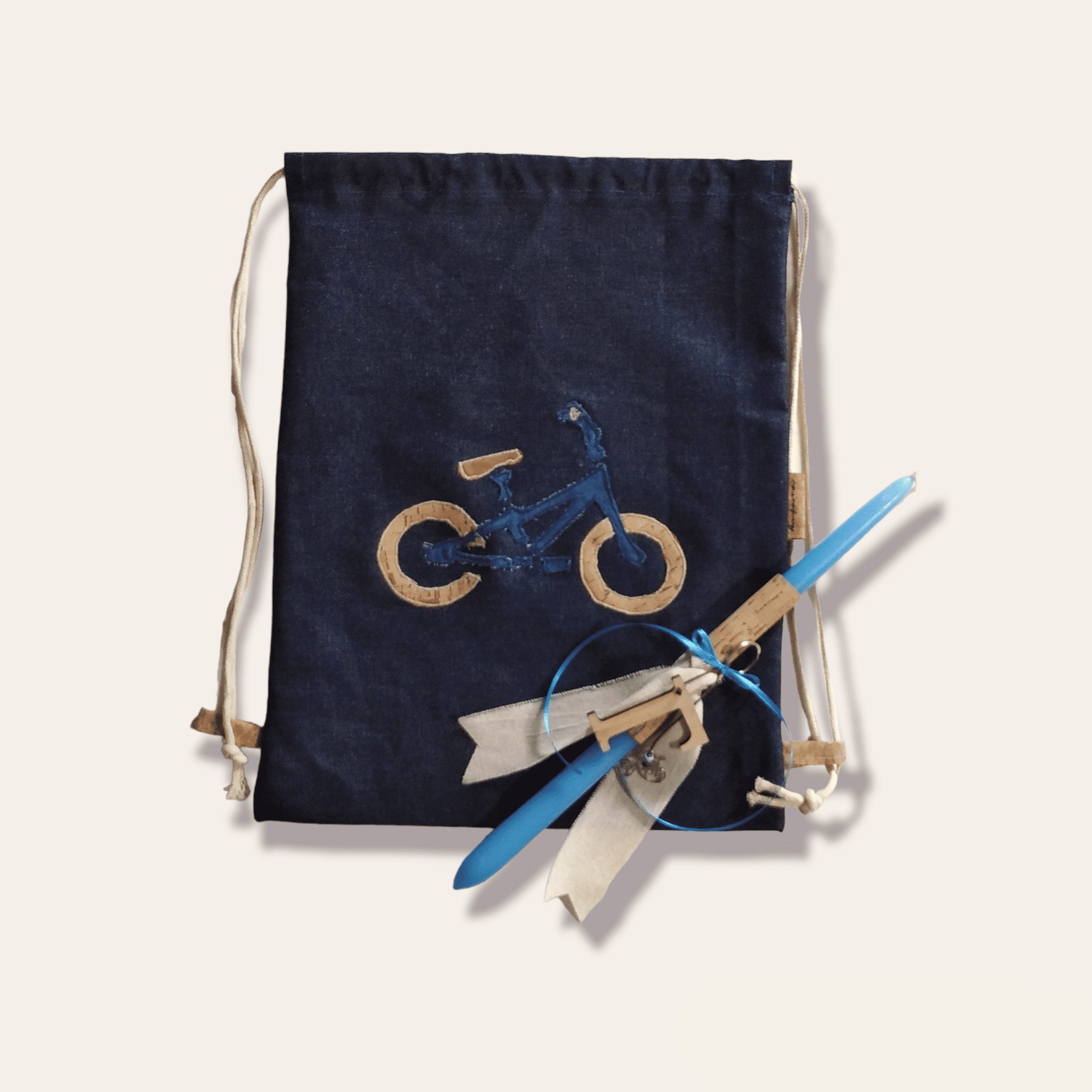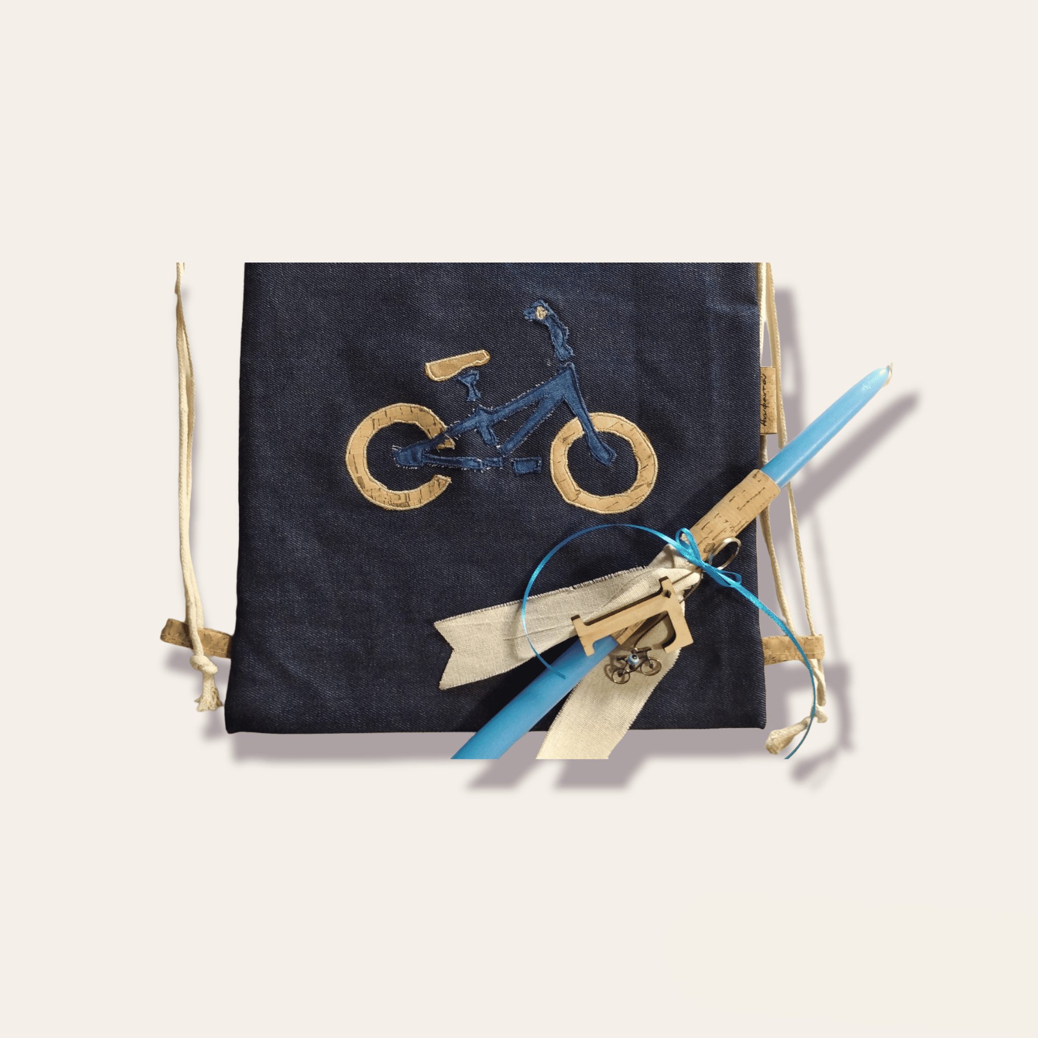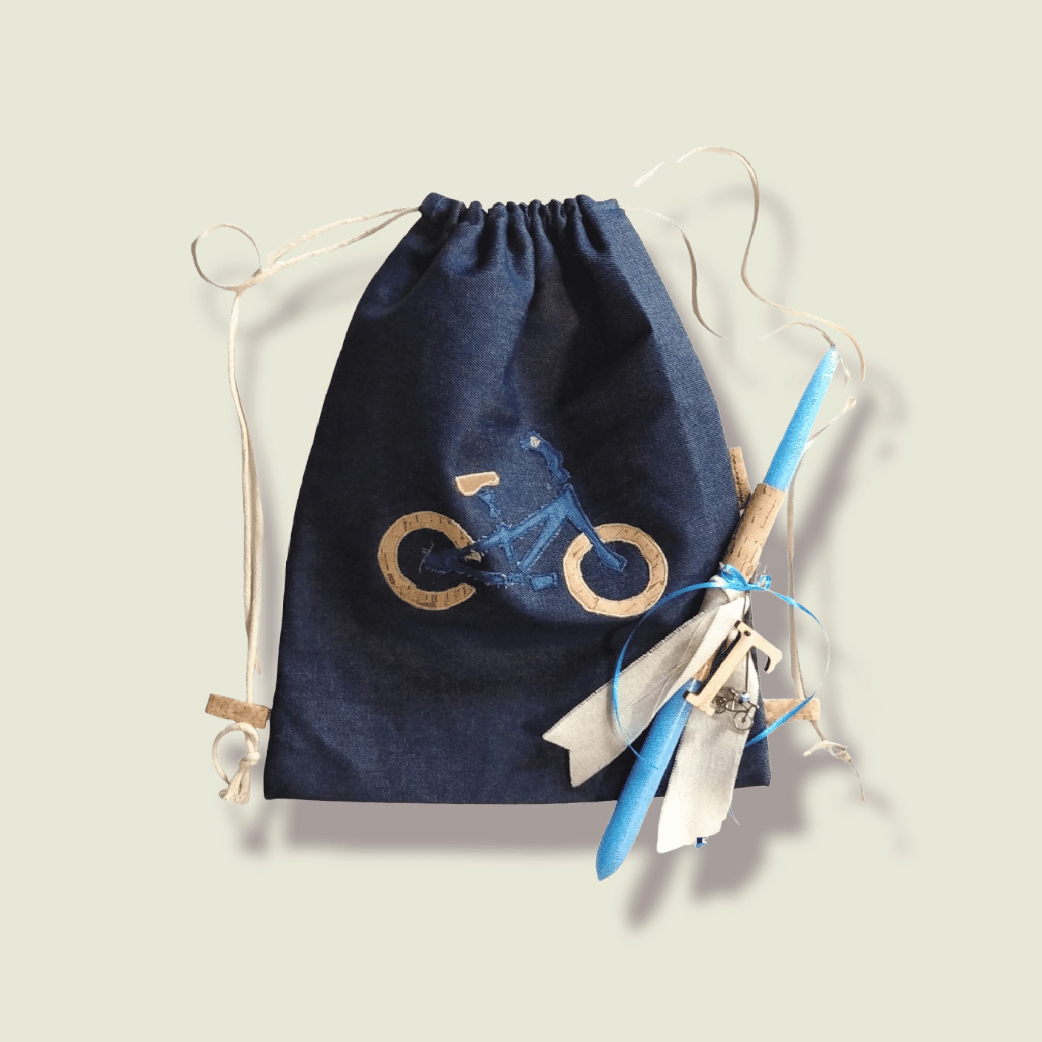 Χειροποίητο, σετ δώρου. Περιλαμβάνει μία λαμπάδα με ένα σακίδιο πλάτης με κορδόνια. Με ξεχωριστό σχέδιο, ποδήλατο. Το σακίδιο είναι από μπλε τζιν ύφασμα. Διαθέτει κορδόνια τα οποία κλείνουν την τσάντα αλλά και καταλήγουν στους ώμους του παιδιού για κράτημα στην πλάτη.