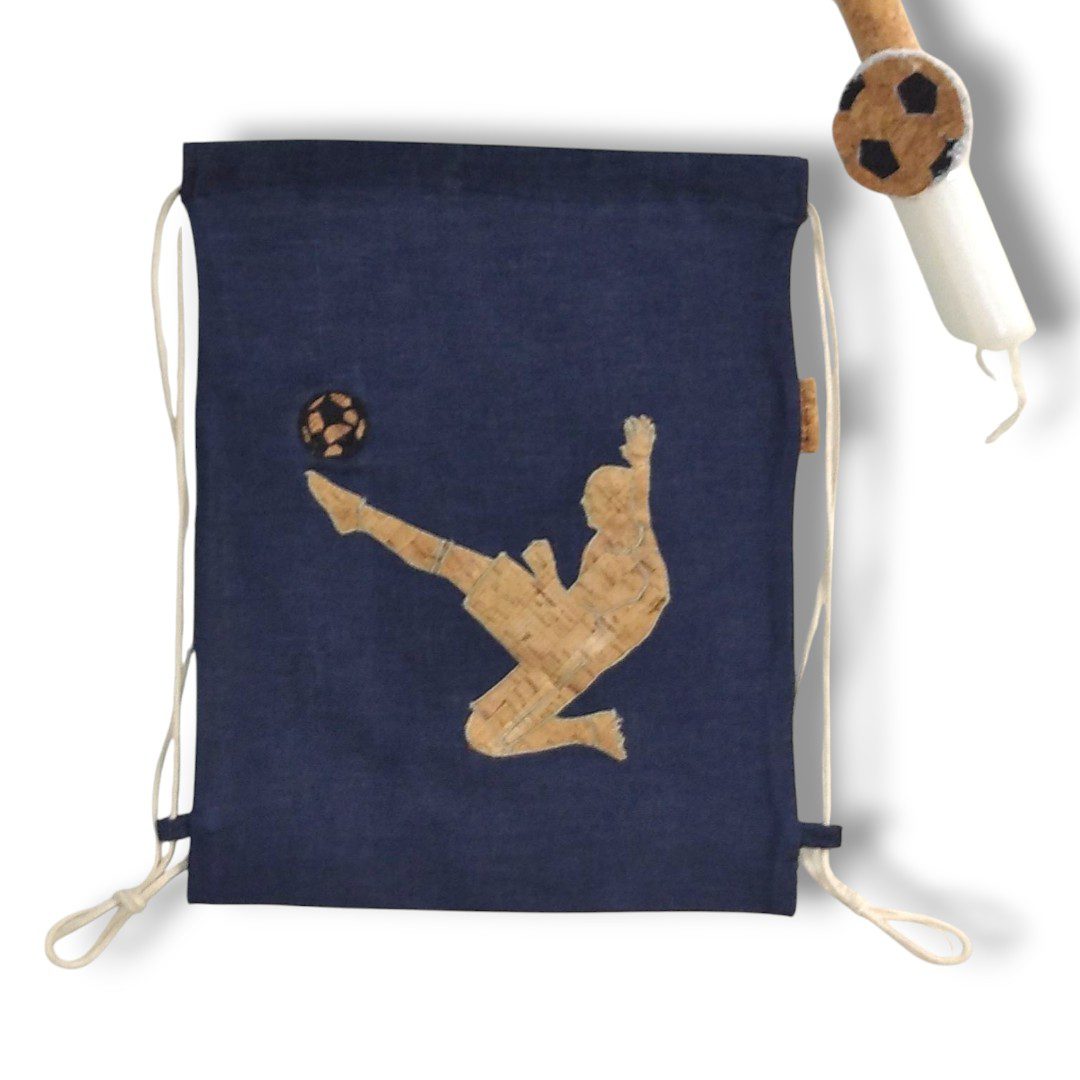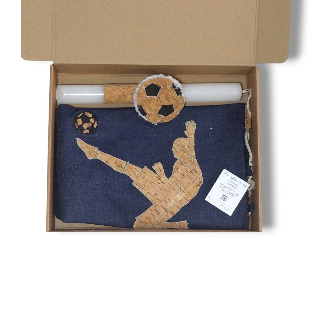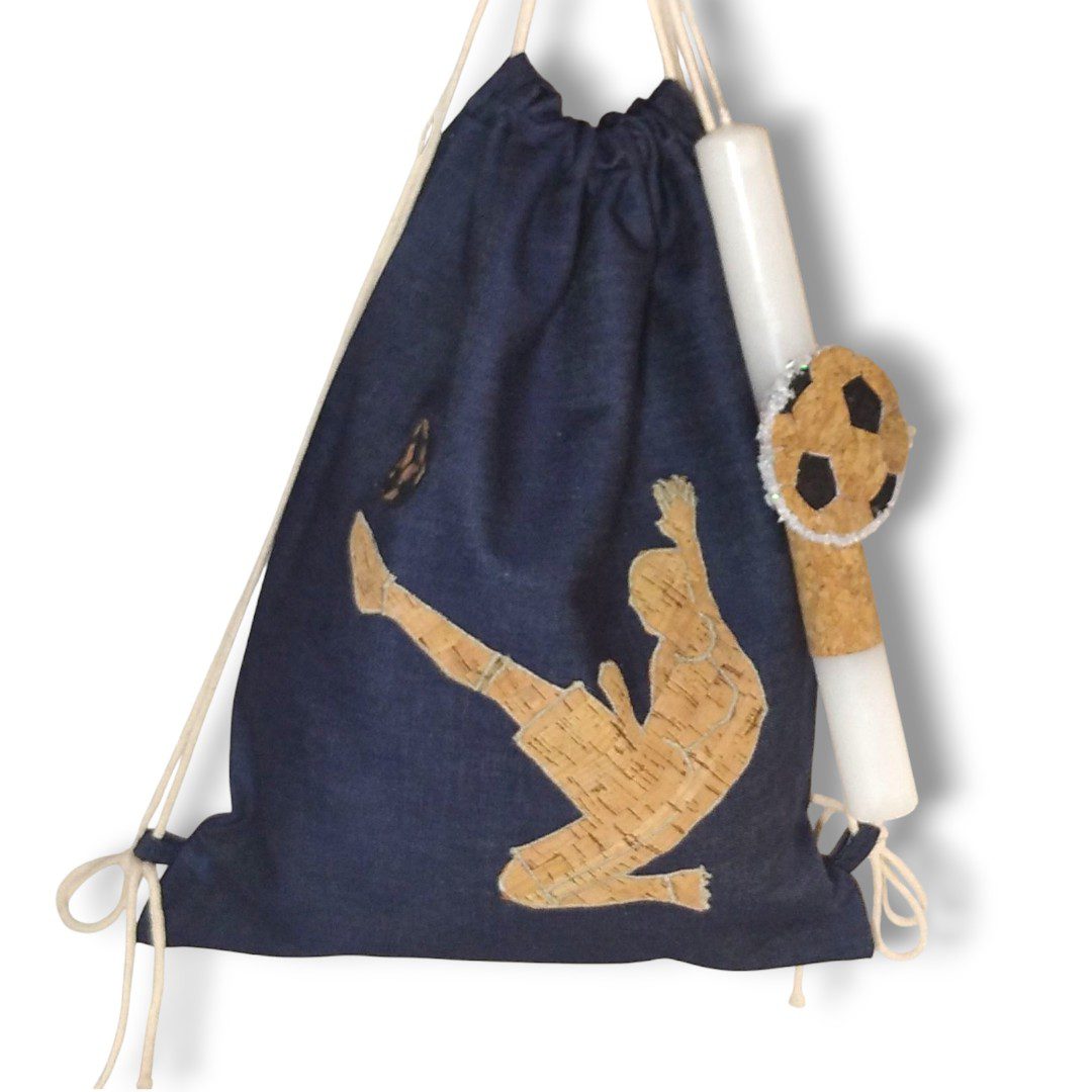 Χειροποίητο Πασχαλινό σετ δώρου. Περιλαμβάνει μία λαμπάδα με ένα σακίδιο πλάτης με κορδόνια. Με ξεχωριστό σχέδιο, ποδοσφαιριστή. Το σακίδιο είναι από μπλε τζιν ύφασμα. Διαθέτει κορδόνια τα οποία κλείνουν την τσάντα αλλά και καταλήγουν στους ώμους του παιδιού για κράτημα στην πλάτη.