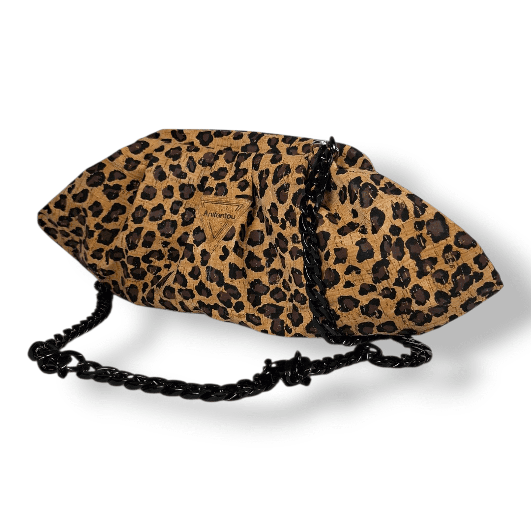Χειροποίητη χιαστή τσάντα (bucket bag) από φελλό leopard. Με αποσπώμενη μαύρη κοκάλινη αλυσίδα. Το πλαίσιο, της δίνει ένα άνετο και ευρύχωρο άνοιγμα – κλείσιμο.