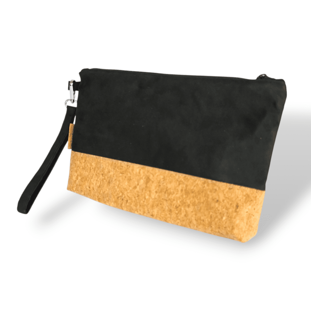 Χειροποίητο, τσαντάκι χειρός. Από ύφασμα φελλού στο φυσικό χρώμα και μαύρο σουέτ ύφασμα . Ευρύχωρο και πρακτικό, ιδανικό για όλα τη μέρα. Κλείσιμο με φερμουάρ και λουράκι καρπού. Ευρύχωρο εσωτερικό, με τσέπη που κλείνει με φερμουάρ και επιπλέον ανοιχτή τσέπη.