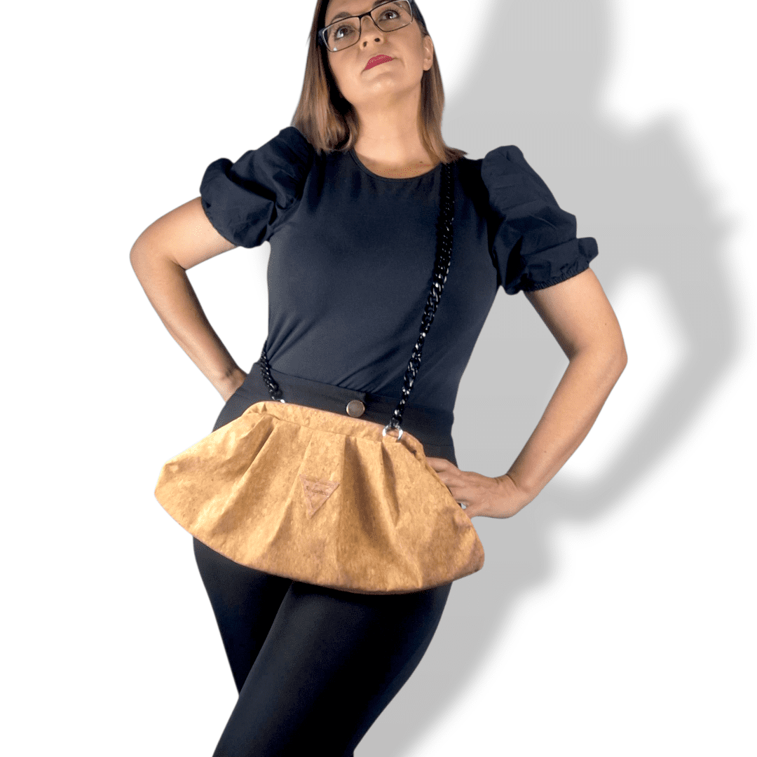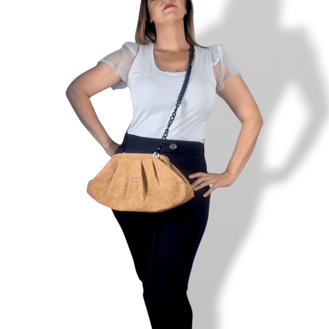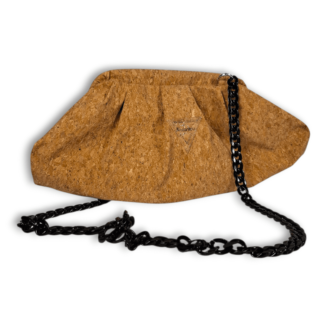 Χειροποίητη χιαστή τσάντα (bucket bag) από φελλό στο φυσικό χρώμα. Με αποσπώμενη μαύρη κοκάλινη αλυσίδα. Το πλαίσιο, της δίνει ένα άνετο και ευρύχωρο άνοιγμα – κλείσιμο.