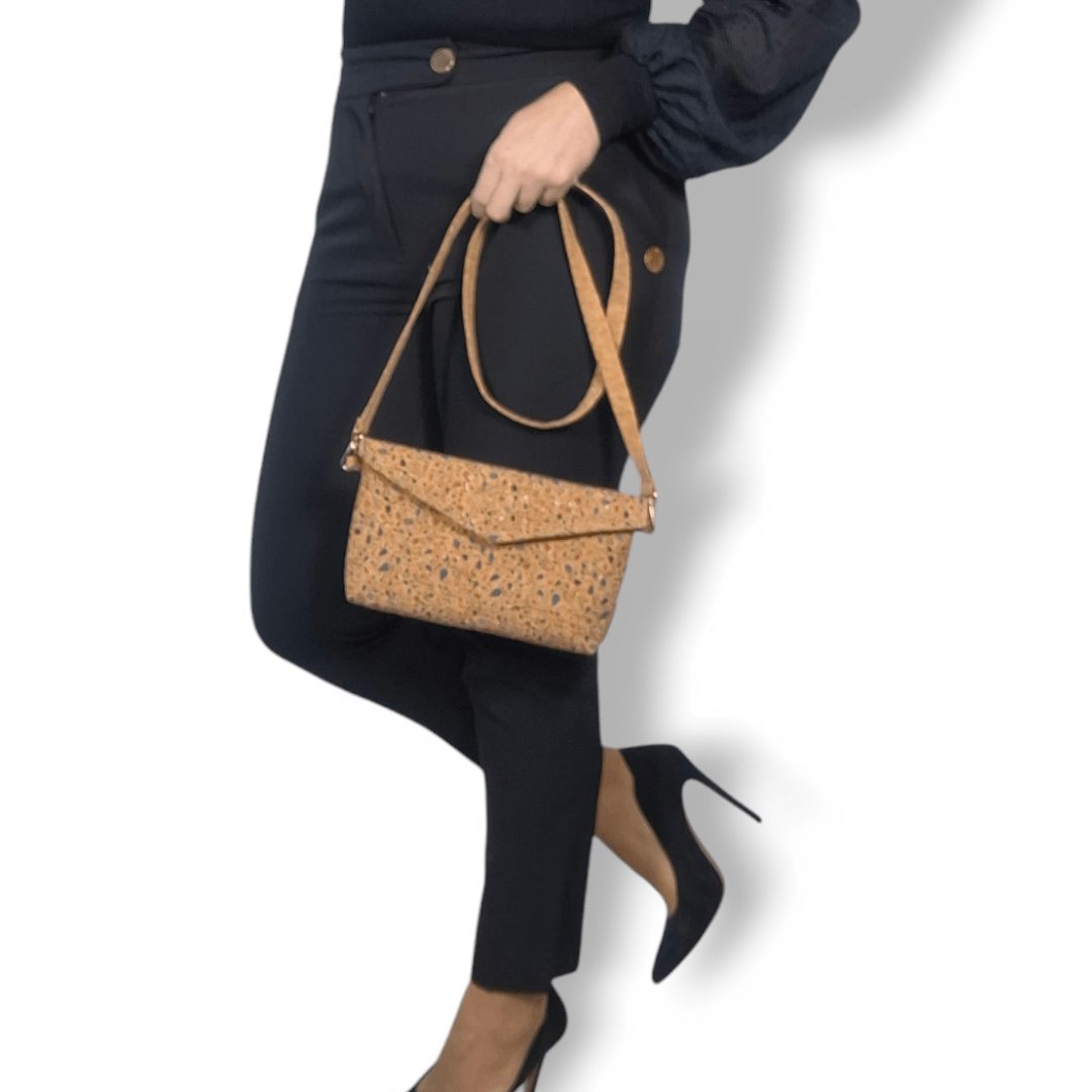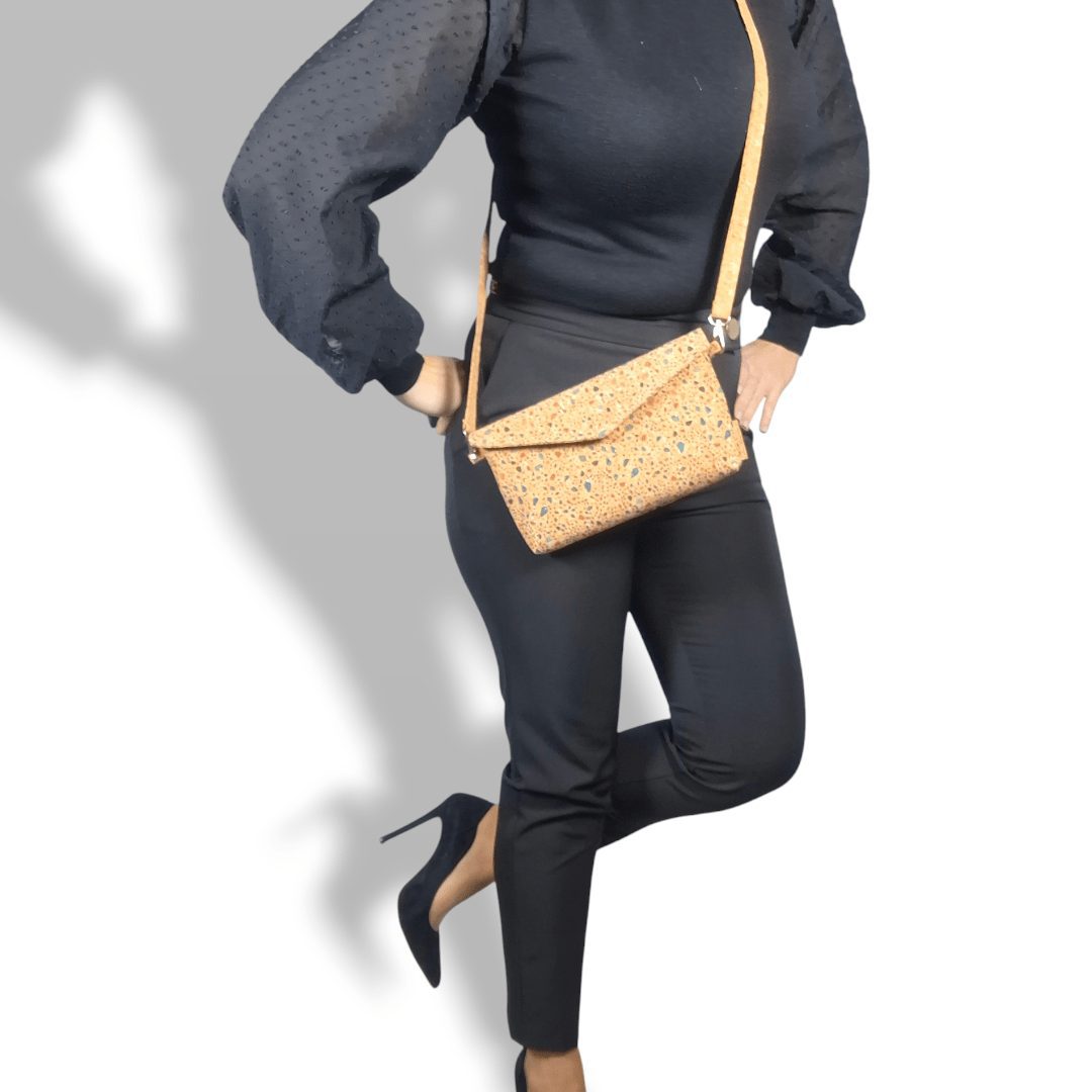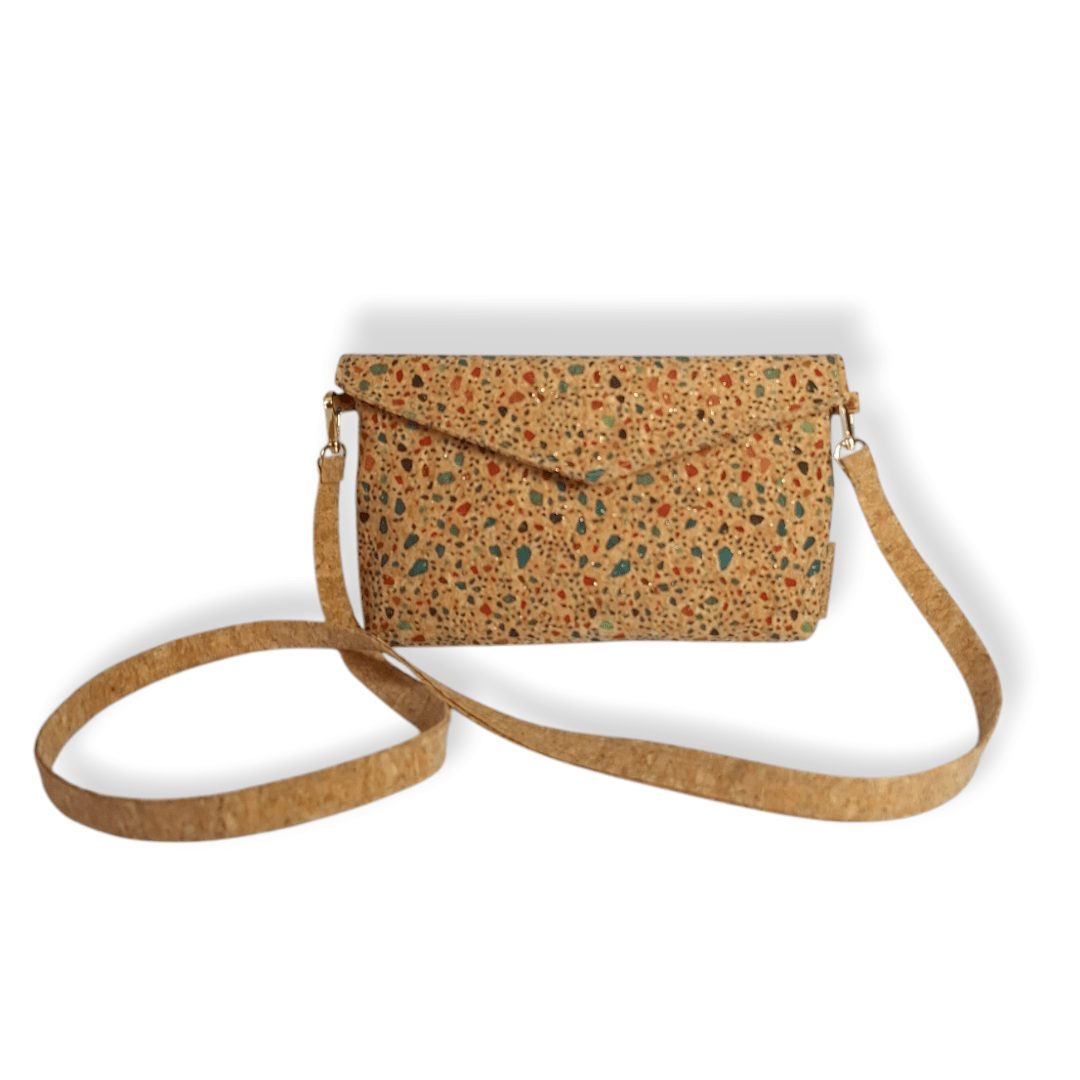 Χειροποίητη χιαστί τσάντα από φελλό με χρώμα και χρυσό glitter, με ιμάντα πλάτους 1,5εκ. από φελλό στο φυσικό χρώμα. Κλείσιμο με μαγνητικό κούμπωμα. Ο ιμάντας είναι αποσπώμενος από την τσάντα, δίνοντας την δυνατότητα να τον αλλάξετε εύκολα δίνοντας διαφορετικό στιλ στην τσάντα σας. Ευρύχωρο εσωτερικό, με τσέπη που κλείνει με φερμουάρ και επιπλέον ανοιχτή τσέπη.