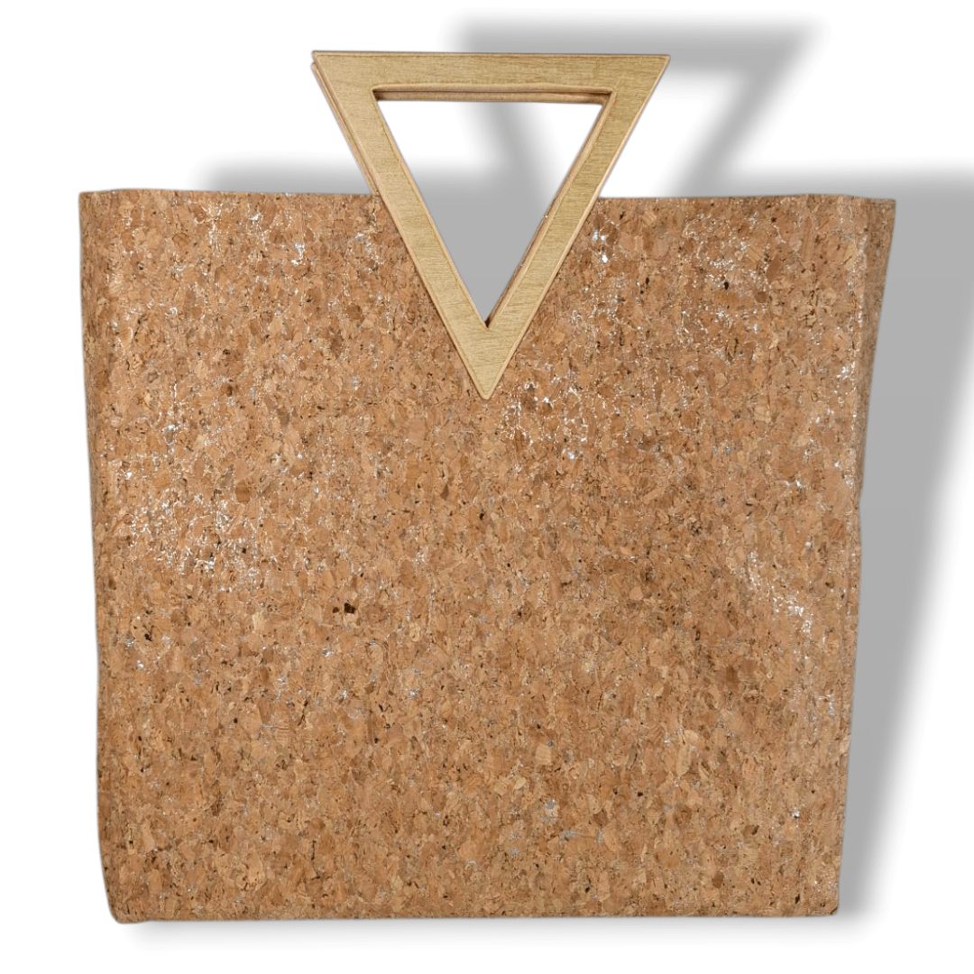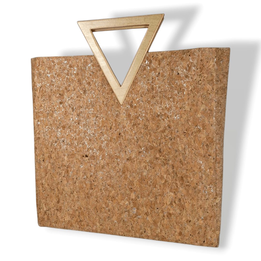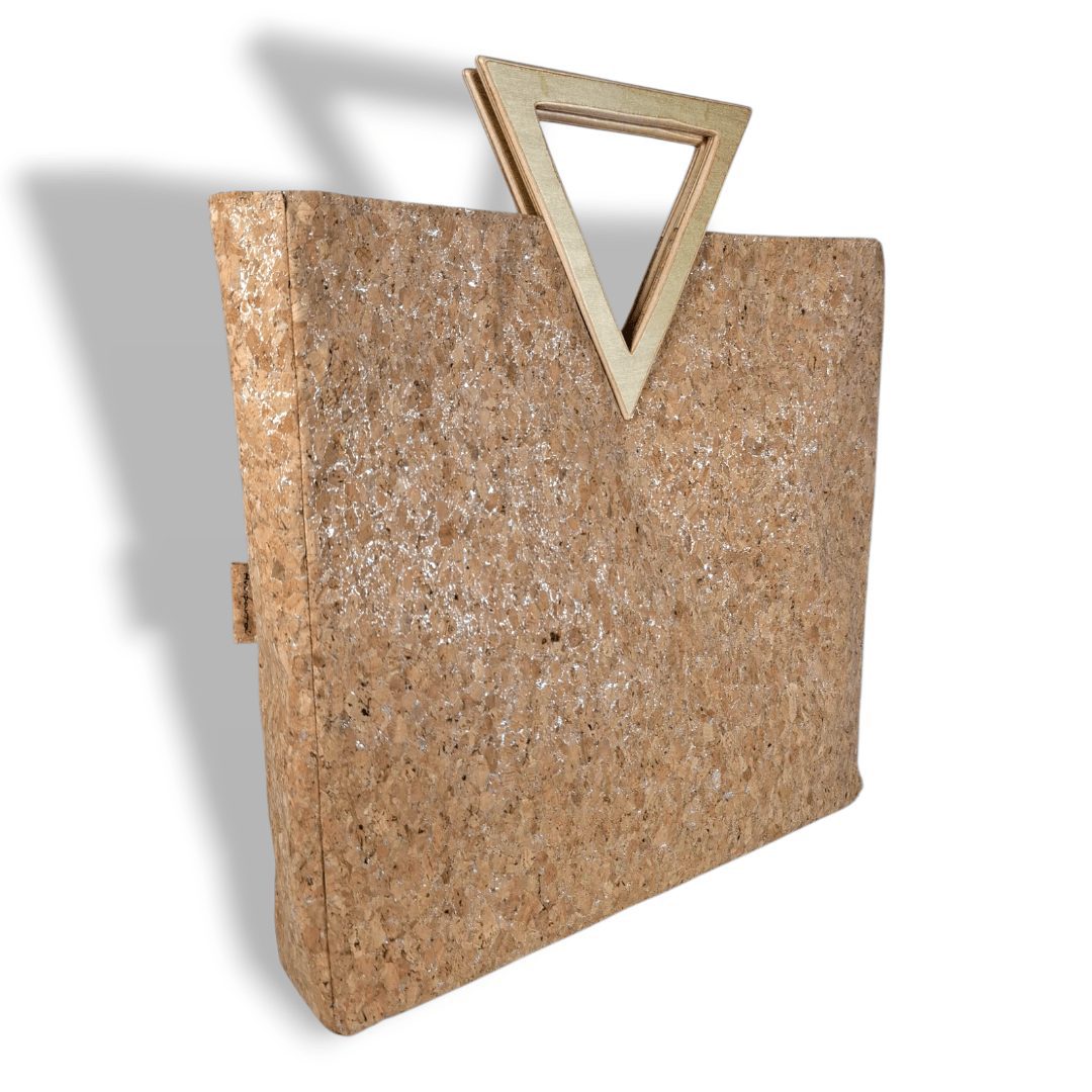 Χειροποίητη προσωποποιημένη μεγάλη τσάντα χειρός με χειροποίητη ξύλινη λαβή. Από την μία πλευρά θα έχει κεντημένο το όνομα που θα μας ζητήσετε. Είναι κατασκευασμένη από υψηλής ποιότητας υλικά με προσεγμένο σχέδιο που την κάνει να ξεχωρίζει. Έχει ευρύχωρο εσωτερικό με τσέπη που κλείνει με φερμουάρ και επιπλέον ανοιχτή τσέπη. Ο φελλός με ασημί glitter είναι εξαιρετικά μαλακό υλικό και η ξύλινη λαβή έχει βελούδινο άγγιγμα.