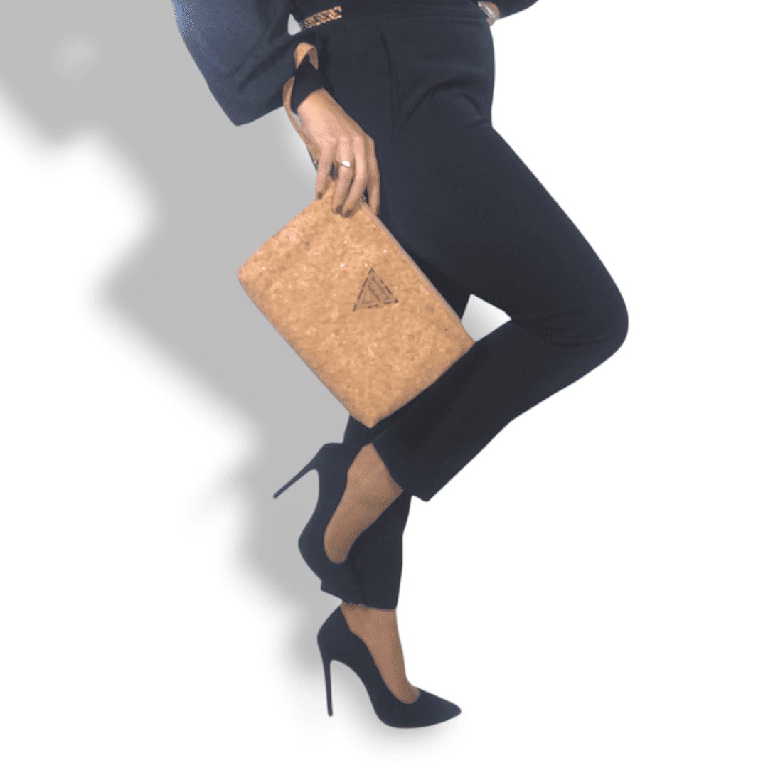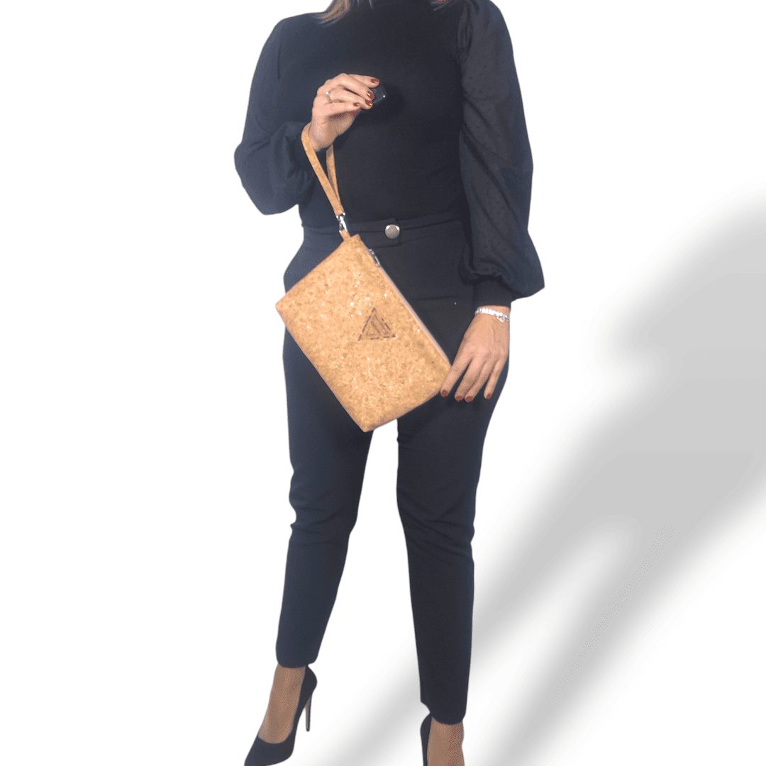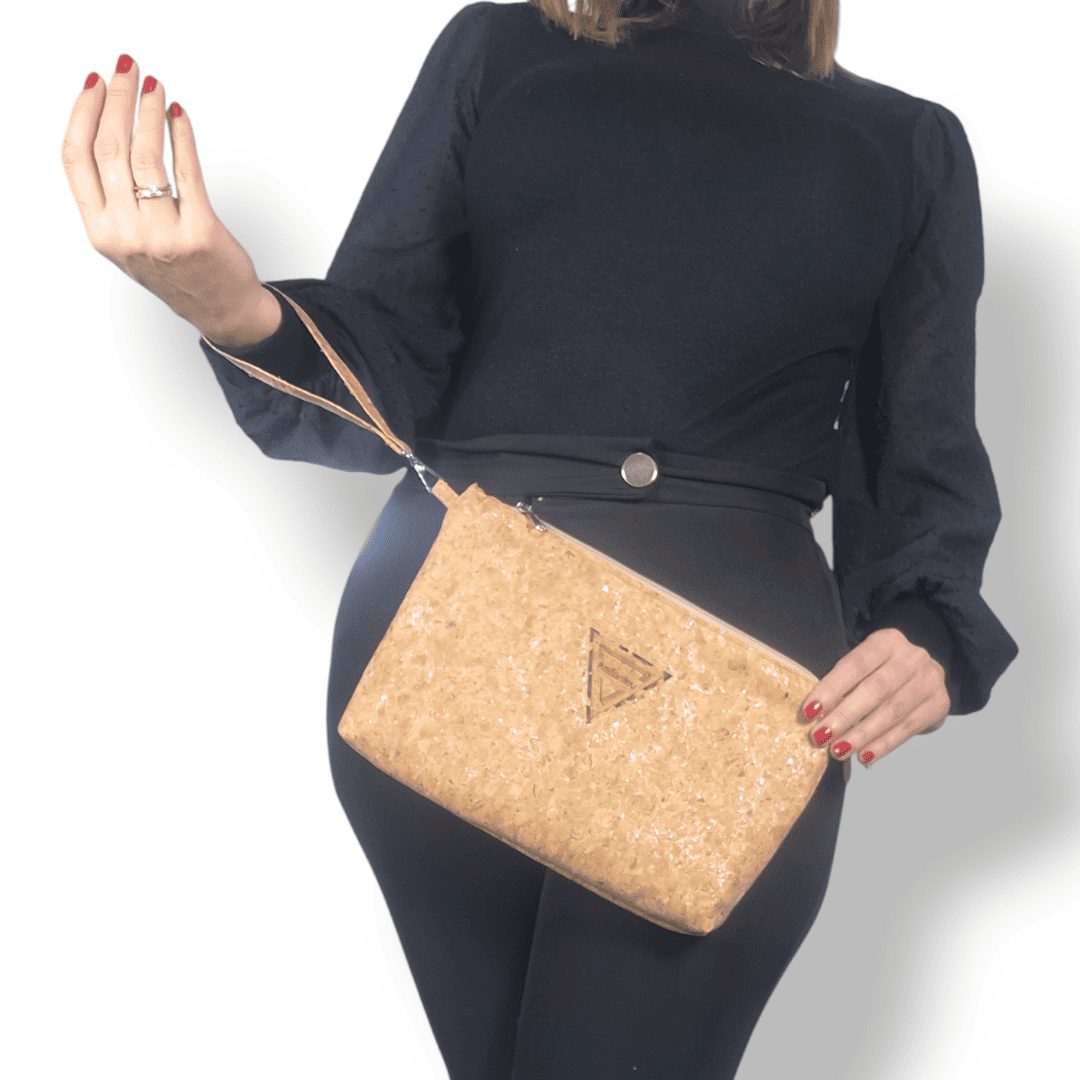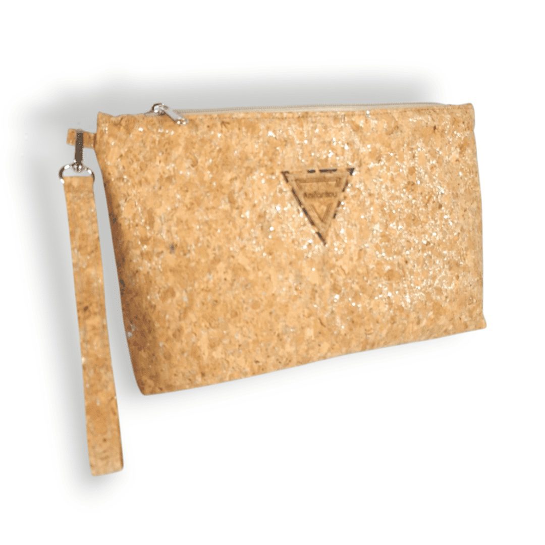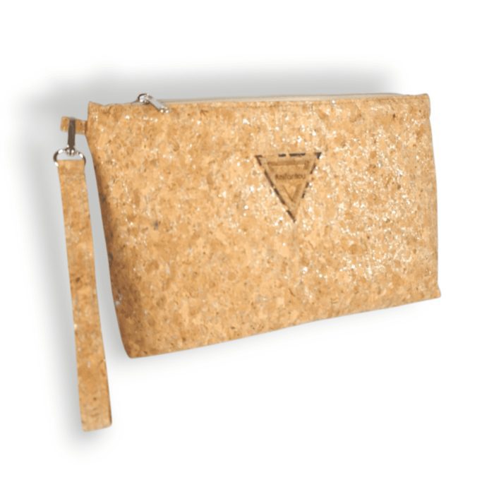 Χειροποίητο, τσαντάκι χειρός. Από ύφασμα φελλού με ασημί glitter. Ευρύχωρο και πρακτικό, ιδανικό για όλα τη μέρα. Κλείσιμο με φερμουάρ και λουράκι καρπού. Ευρύχωρο εσωτερικό, με τσέπη που κλείνει με φερμουάρ και επιπλέον ανοιχτή τσέπη.