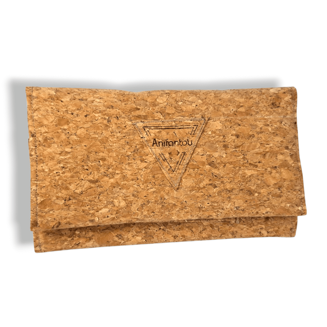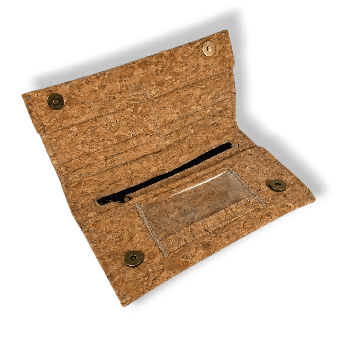 Χειροποίητο πορτοφόλι. Είναι κατασκευασμένο από ύφασμα φελλού. Διαθέτει επτά θήκες για κάρτες και μία επιπλέων θήκη διάφανη για φωτογραφία ή κάρτα. Έχει μία μεγάλη θήκη για προσωπικά έγγραφα (ταυτότητα, δίπλωμα οδήγησης κ.λ.π.) Μία θήκη για χαρτονομίσματα και μια θήκη με φερμουάρ για τα κέρματα.