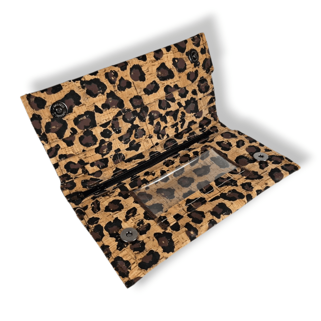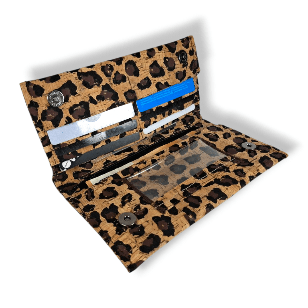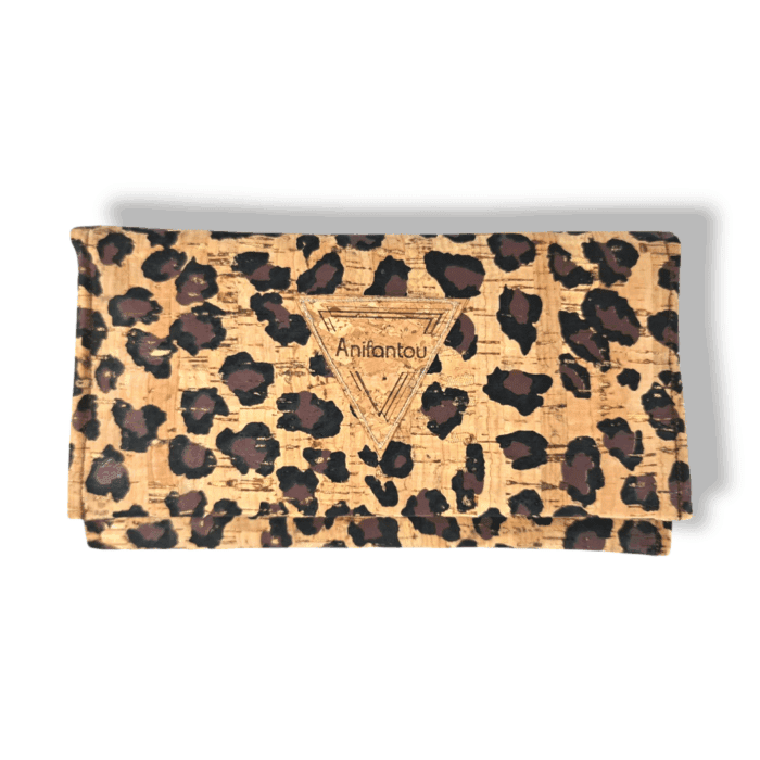 Χειροποίητο πορτοφόλι. Είναι κατασκευασμένο από ύφασμα φελλού Leopard. Διαθέτει επτά θήκες για κάρτες και μία επιπλέων θήκη διάφανη για φωτογραφία ή κάρτα. Έχει μία μεγάλη θήκη για προσωπικά έγγραφα (ταυτότητα, δίπλωμα οδήγησης κ.λ.π.) Μία θήκη για χαρτονομίσματα και μια θήκη με φερμουάρ για τα κέρματα.