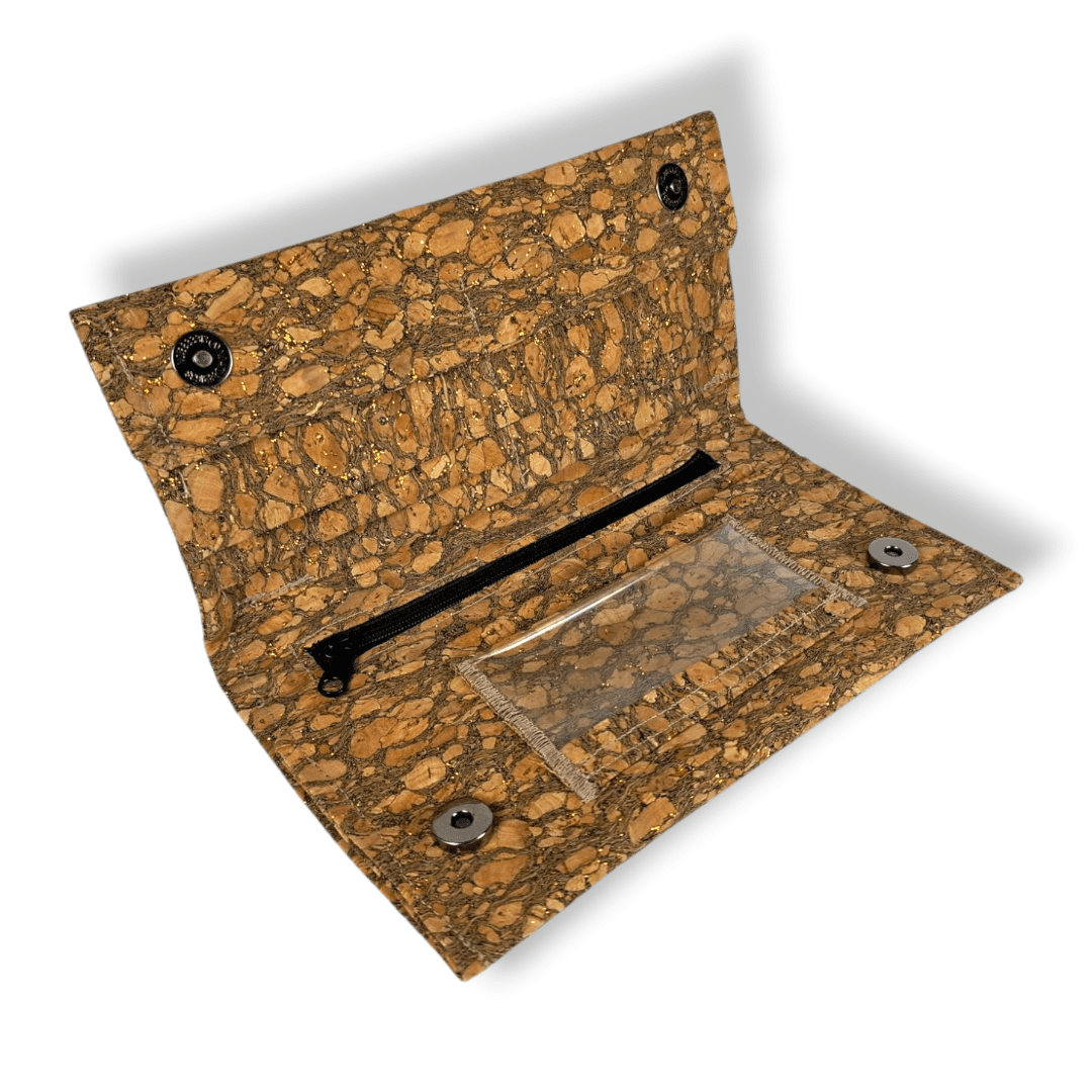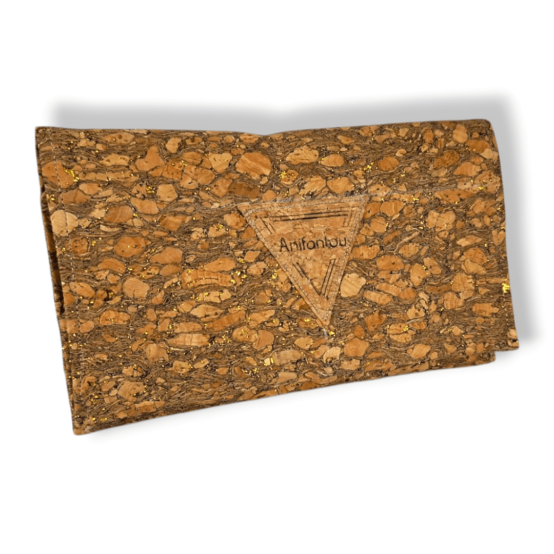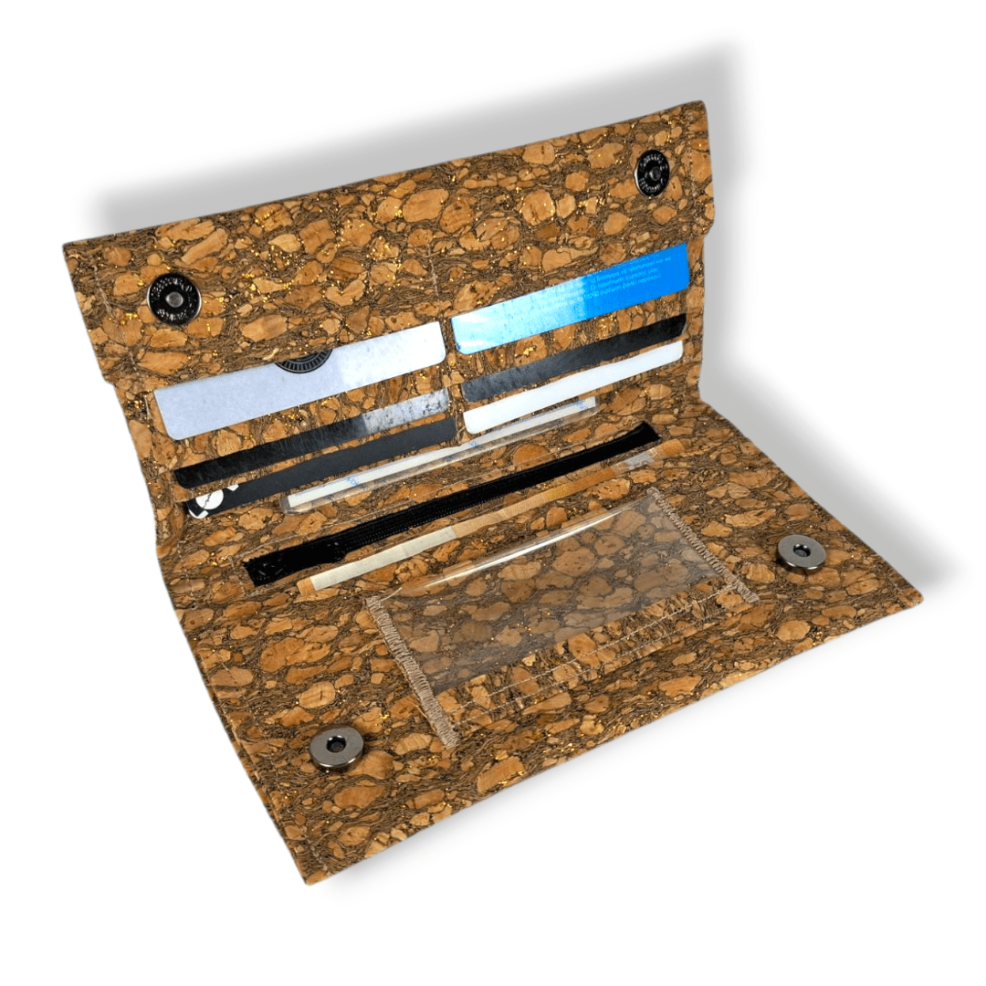 Χειροποίητο πορτοφόλι. Είναι κατασκευασμένο από φελλό με χρώμα και χρυσό glitter. Διαθέτει επτά θήκες για κάρτες και μία επιπλέων θήκη διάφανη για φωτογραφία ή κάρτα. Έχει μία μεγάλη θήκη για προσωπικά έγγραφα (ταυτότητα, δίπλωμα οδήγησης κ.λ.π.) Μία θήκη για χαρτονομίσματα και μια θήκη με φερμουάρ για τα κέρματα.
