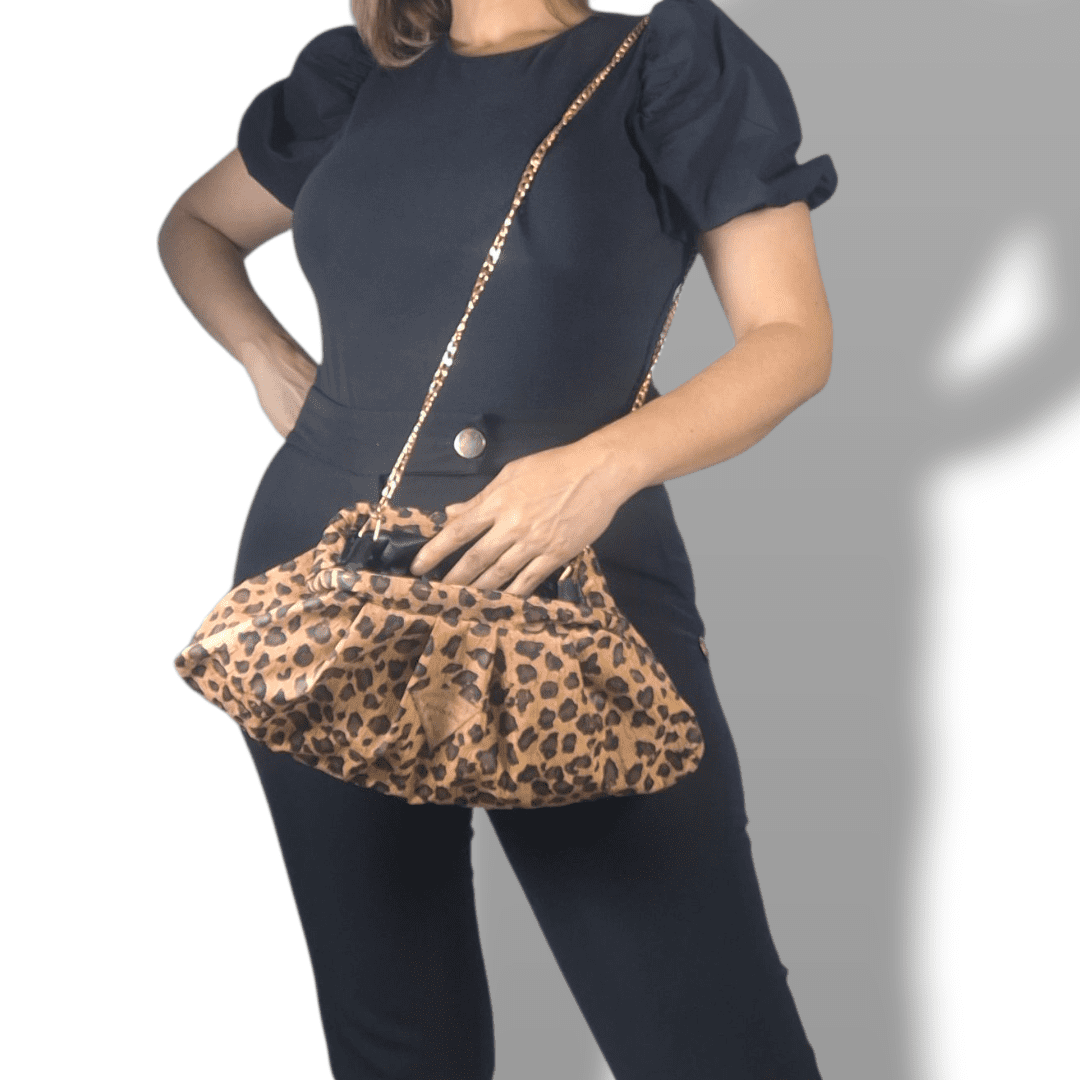 Χειροποίητη τσάντα ώμου (bucket bag) από Φελλό leopard. Με αποσπώμενη μεταλλική χρυσή αλυσίδα. Το πλαίσιο, της δίνει ένα άνετο και ευρύχωρο άνοιγμα – κλείσιμο.