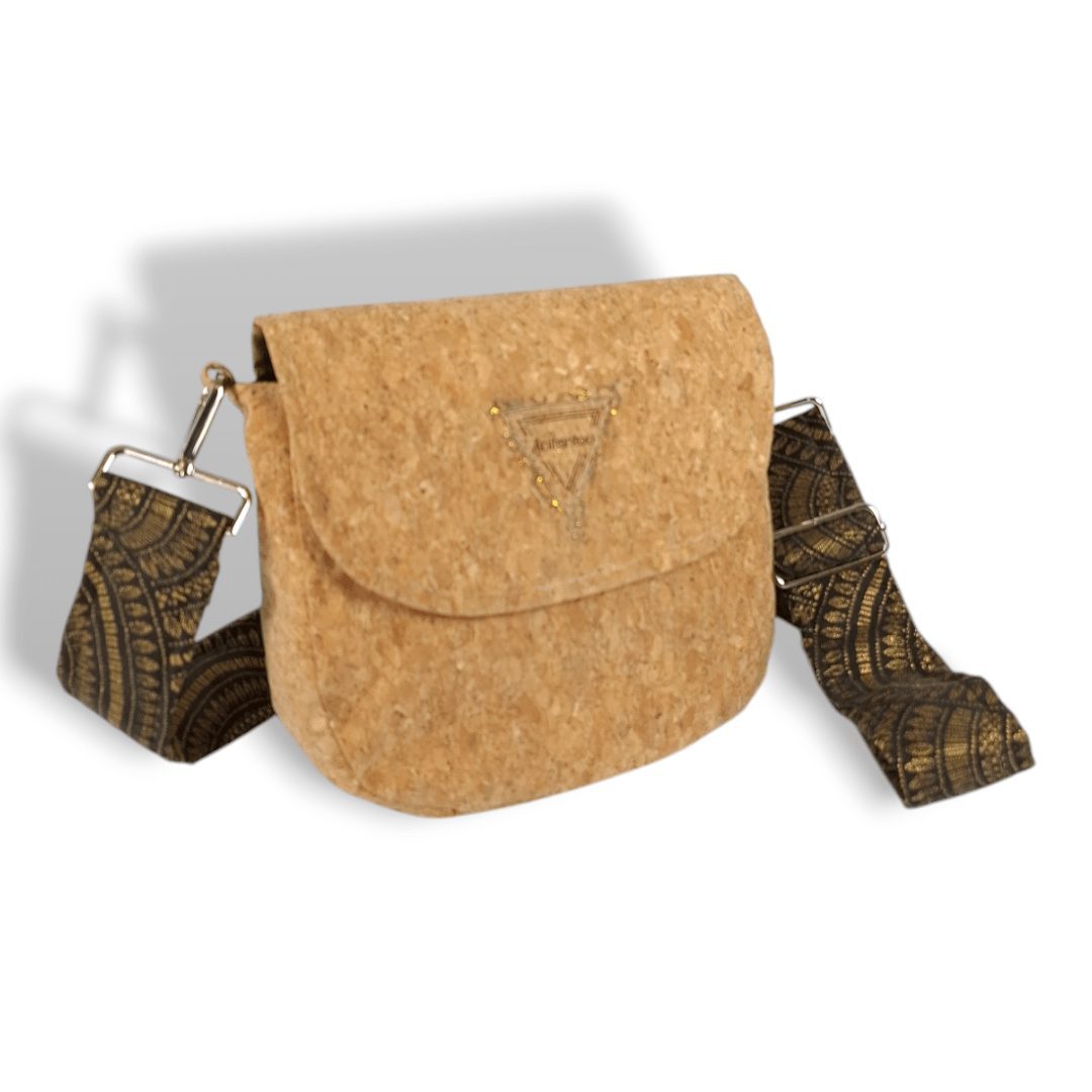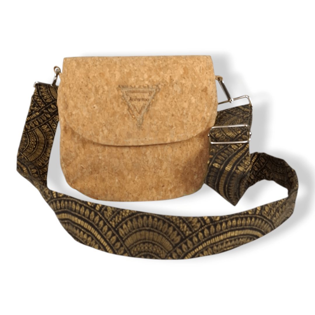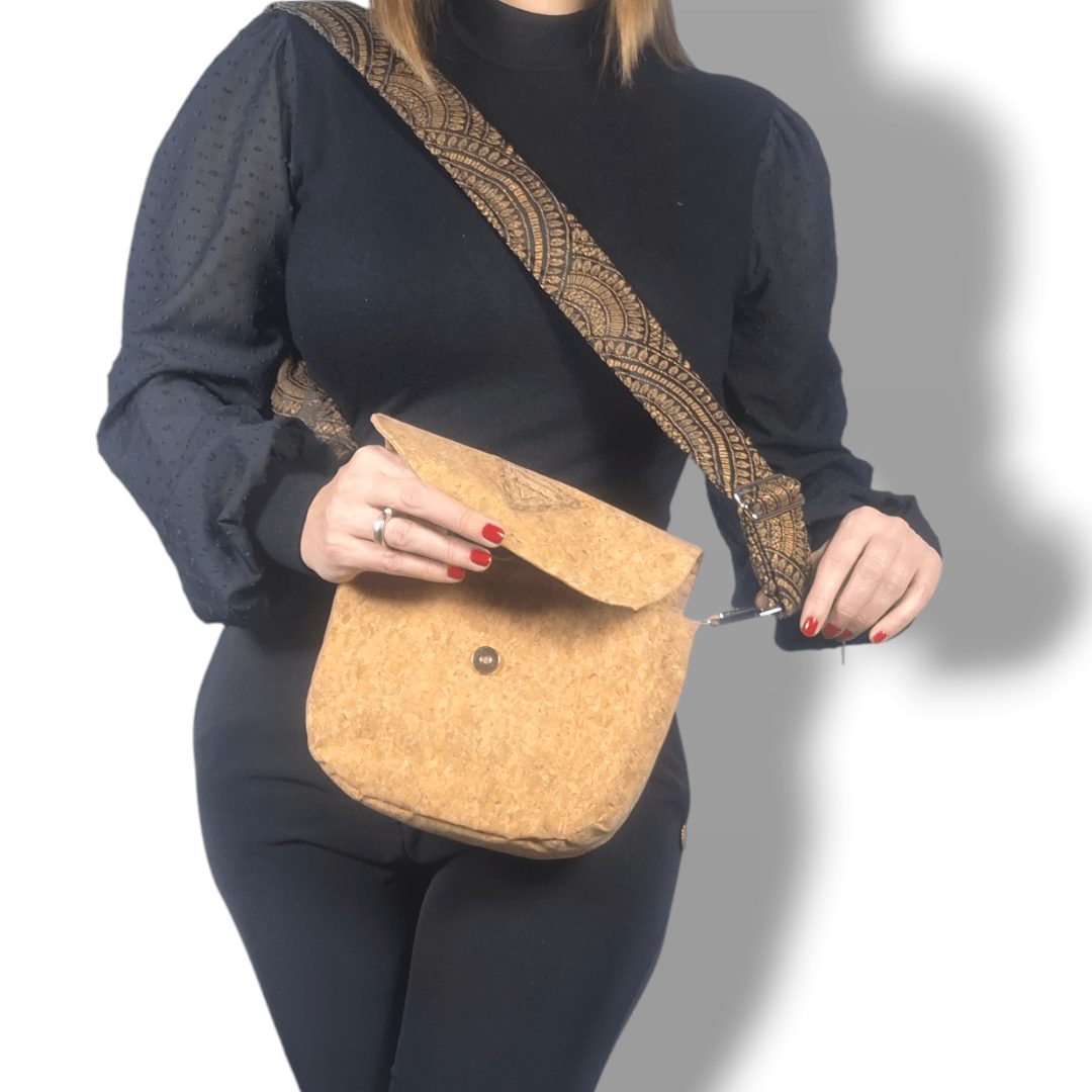 Χειροποίητη χιαστί τσάντα από φελλό στο φυσικό χρώμα του, με ιμάντα από υφαντό μαύρο ύφασμα με χρυσή κλωστή. Ευρύχωρη και πρακτική, ιδανική για όλα τη μέρα. Κλείσιμο με μαγνητικό κούμπωμα. Ο ιμάντας είναι αποσπώμενος από την τσάντα, δίνοντας την δυνατότητα να τον αλλάξετε εύκολα δίνοντας διαφορετικό στιλ στην τσάντα σας. Ευρύχωρο εσωτερικό, με τσέπη που κλείνει με φερμουάρ και επιπλέον ανοιχτή τσέπη.