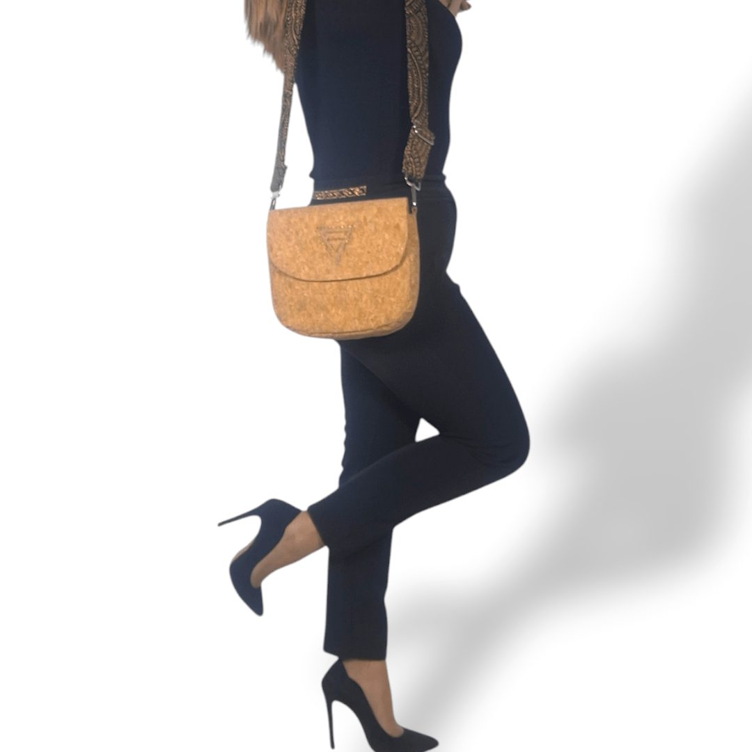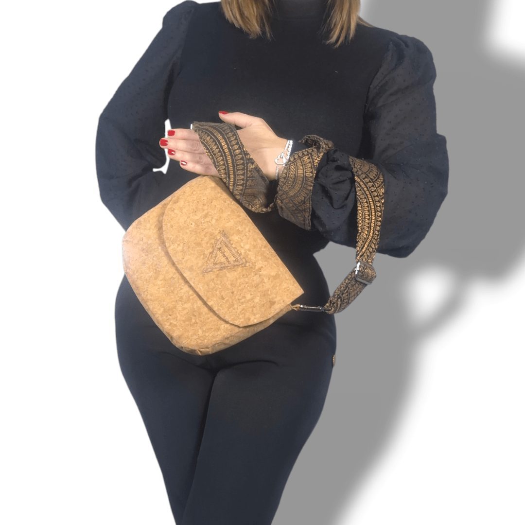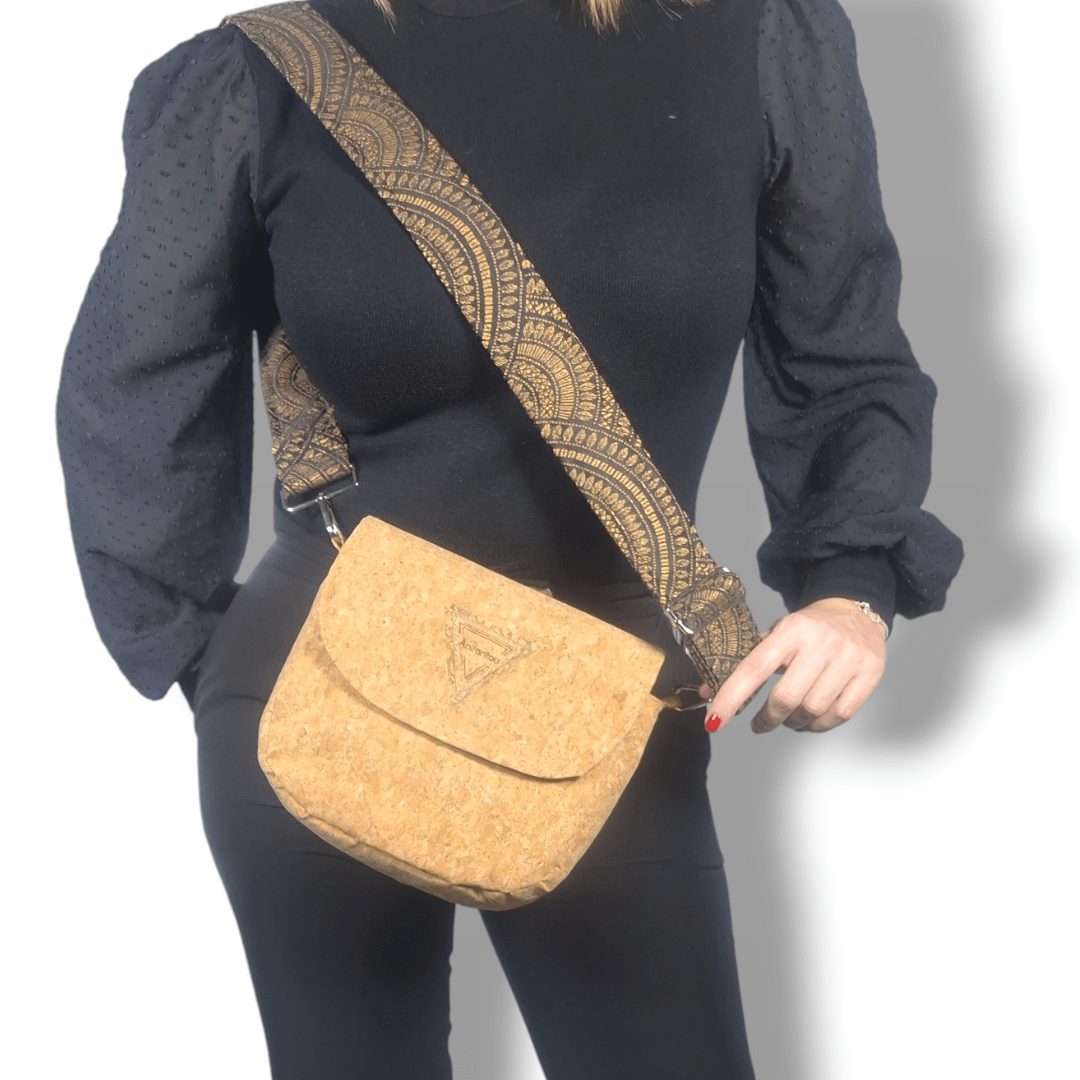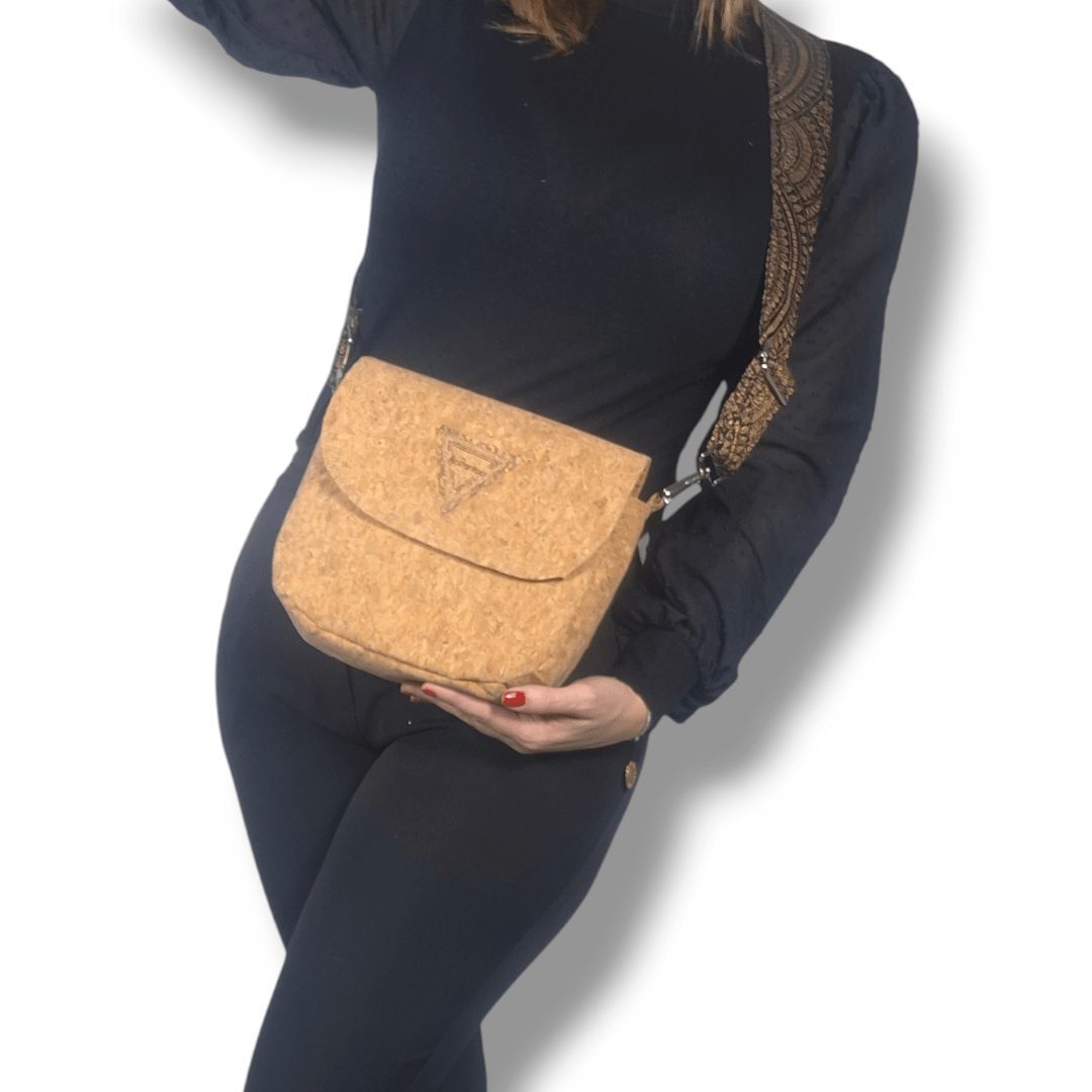 Χειροποίητη χιαστί τσάντα από φελλό στο φυσικό χρώμα του, με ιμάντα από υφαντό μαύρο ύφασμα με χρυσή κλωστή. Ευρύχωρη και πρακτική, ιδανική για όλα τη μέρα. Κλείσιμο με μαγνητικό κούμπωμα. Ο ιμάντας είναι αποσπώμενος από την τσάντα, δίνοντας την δυνατότητα να τον αλλάξετε εύκολα δίνοντας διαφορετικό στιλ στην τσάντα σας. Ευρύχωρο εσωτερικό, με τσέπη που κλείνει με φερμουάρ και επιπλέον ανοιχτή τσέπη.