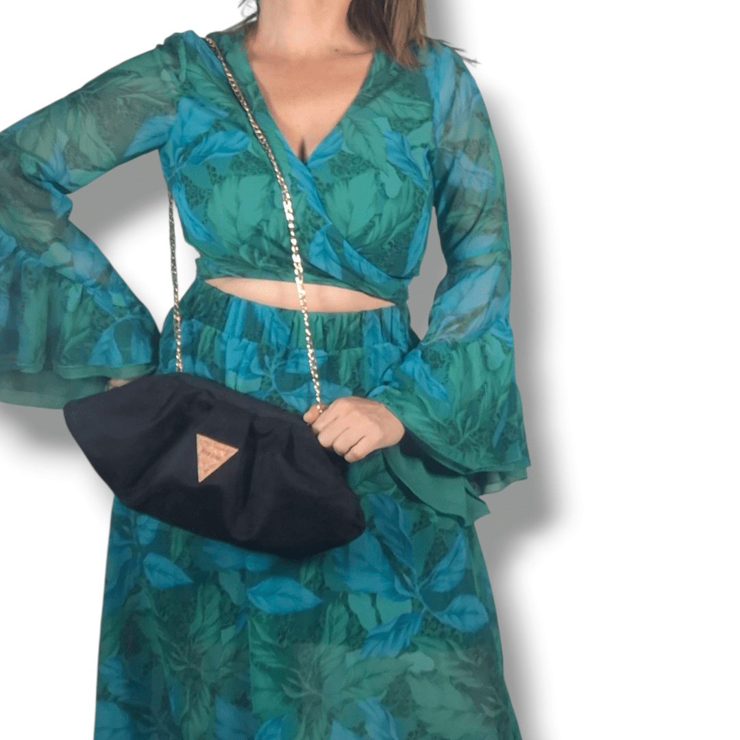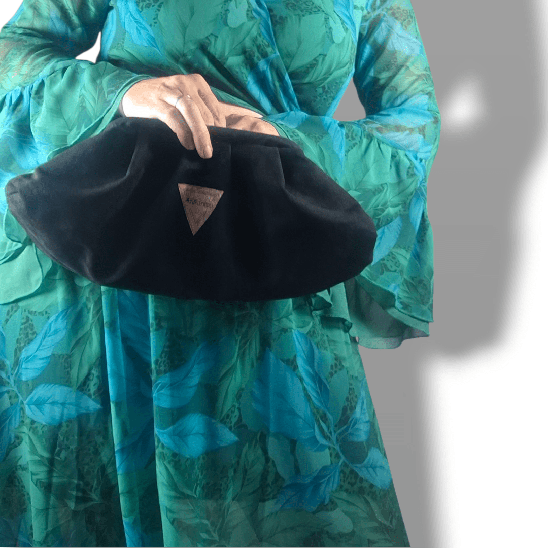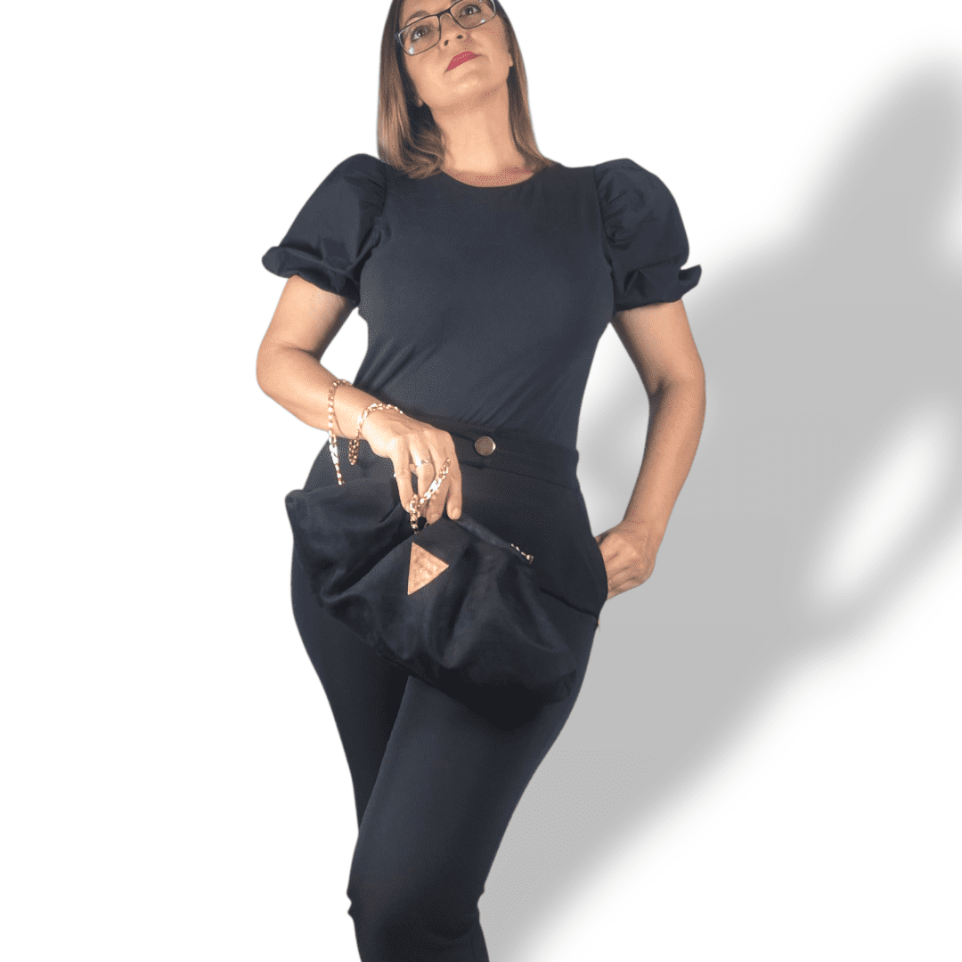 Χειροποίητη τσάντα ώμου (bucket bag) από μαύρο σουέτ ύφασμα. Με αποσπώμενη μεταλλική χρυσή αλυσίδα. Το πλαίσιο, της δίνει ένα άνετο και ευρύχωρο άνοιγμα – κλείσιμο.