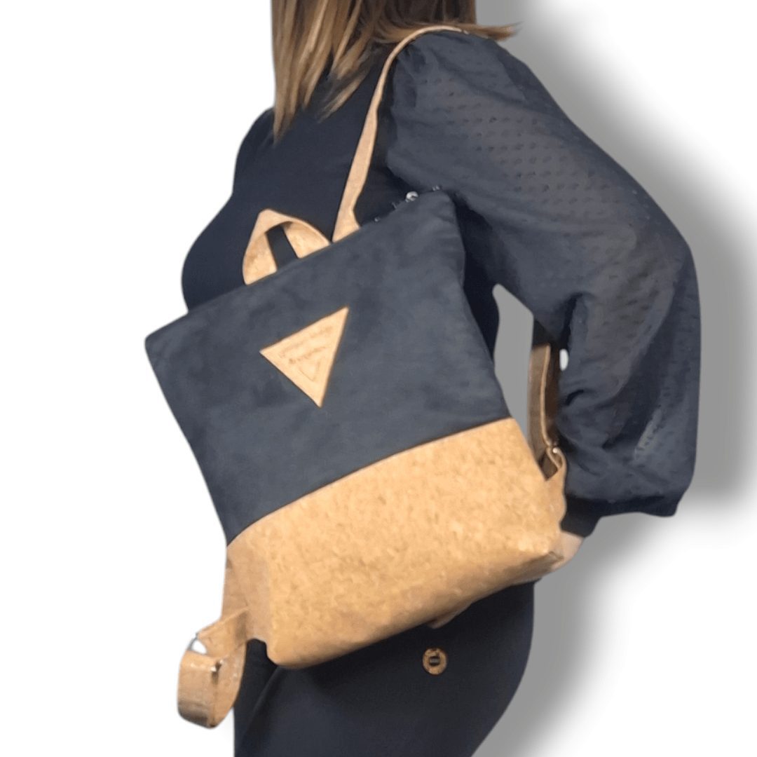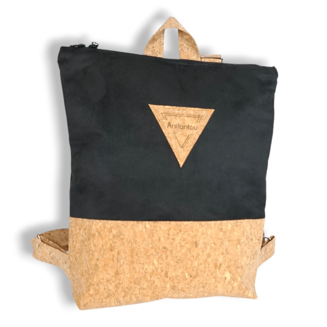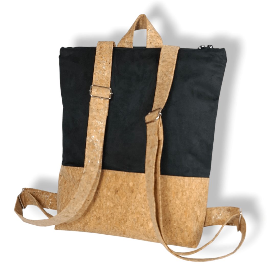 Χειροποίητο, σακίδιο πλάτης με συνδυασμό υφασμάτων, από ύφασμα φυσικού φελλού και μαύρο σουέτ ύφασμα. Ευρύχωρο και πρακτικό, ιδανικό για όλα τη μέρα. Κλείσιμο με φερμουάρ, με διπλούς οδηγούς για μεγαλύτερη άνεση στο άνοιγμα της. Διαθέτει ρυθμιζόμενους ιμάντες από φυσικό φελλό. Ευρύχωρο εσωτερικό, με τσέπη που κλείνει με φερμουάρ και επιπλέον ανοιχτή τσέπη.