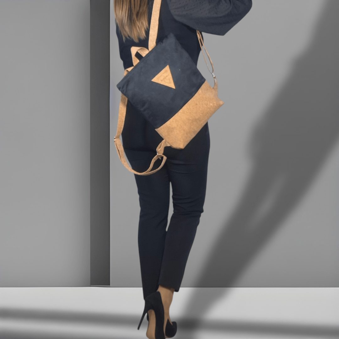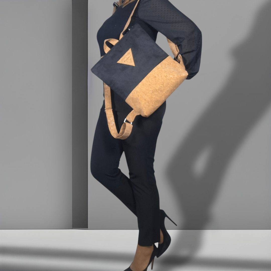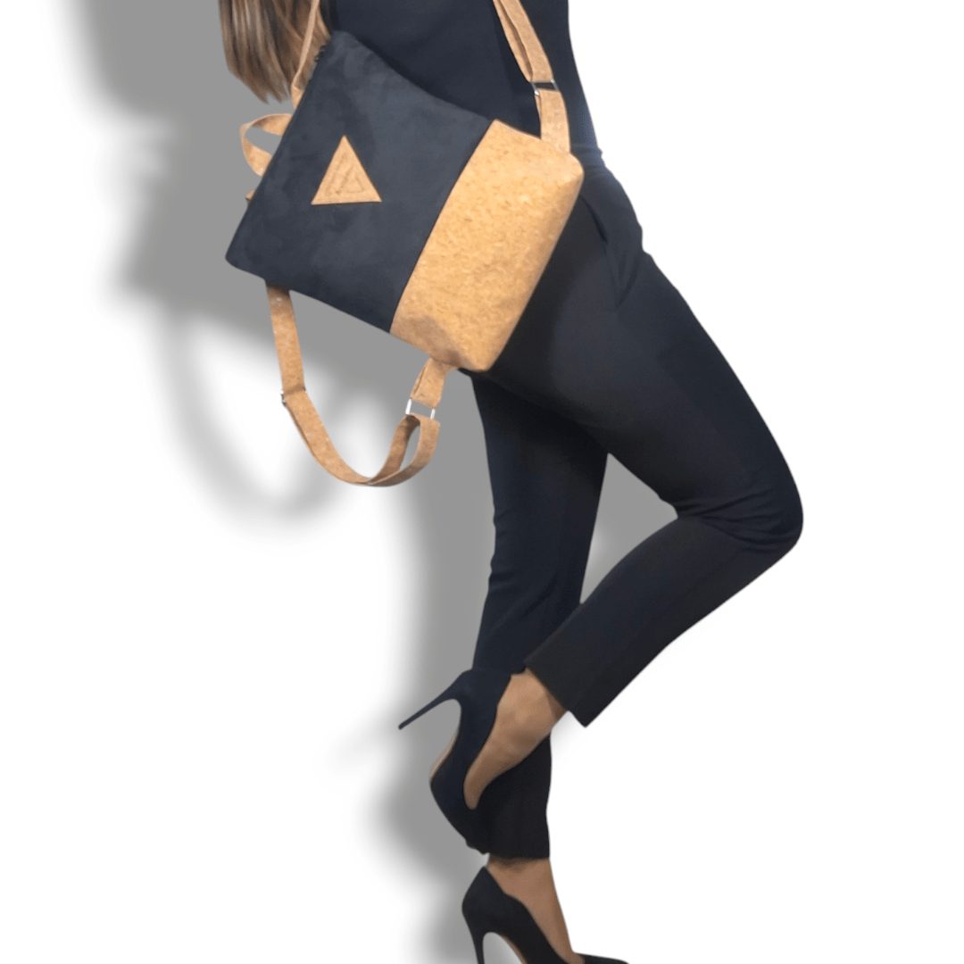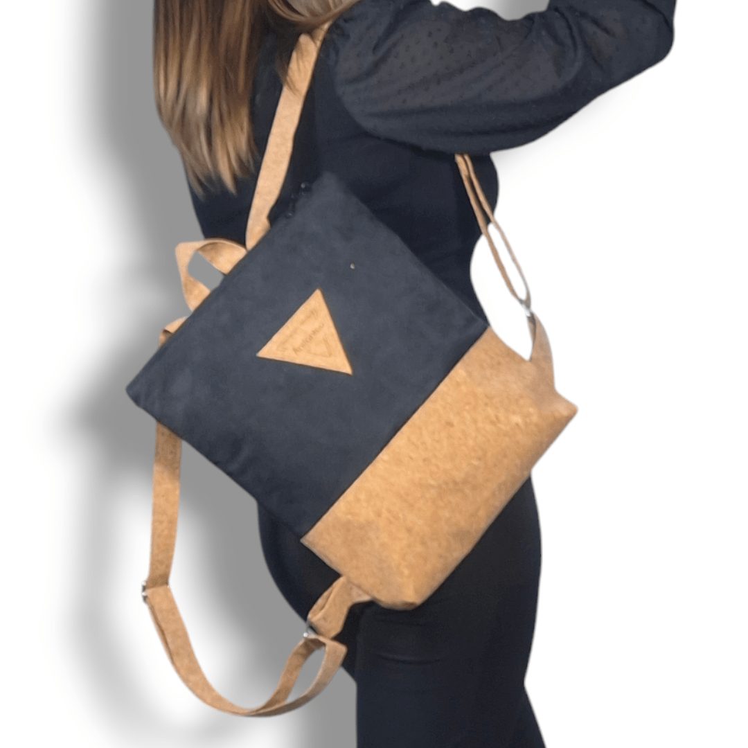 Χειροποίητο, σακίδιο πλάτης με συνδυασμό υφασμάτων, από ύφασμα φυσικού φελλού και μαύρο σουέτ ύφασμα. Ευρύχωρο και πρακτικό, ιδανικό για όλα τη μέρα. Κλείσιμο με φερμουάρ, με διπλούς οδηγούς για μεγαλύτερη άνεση στο άνοιγμα της. Διαθέτει ρυθμιζόμενους ιμάντες από φυσικό φελλό. Ευρύχωρο εσωτερικό, με τσέπη που κλείνει με φερμουάρ και επιπλέον ανοιχτή τσέπη.