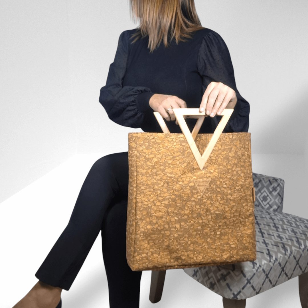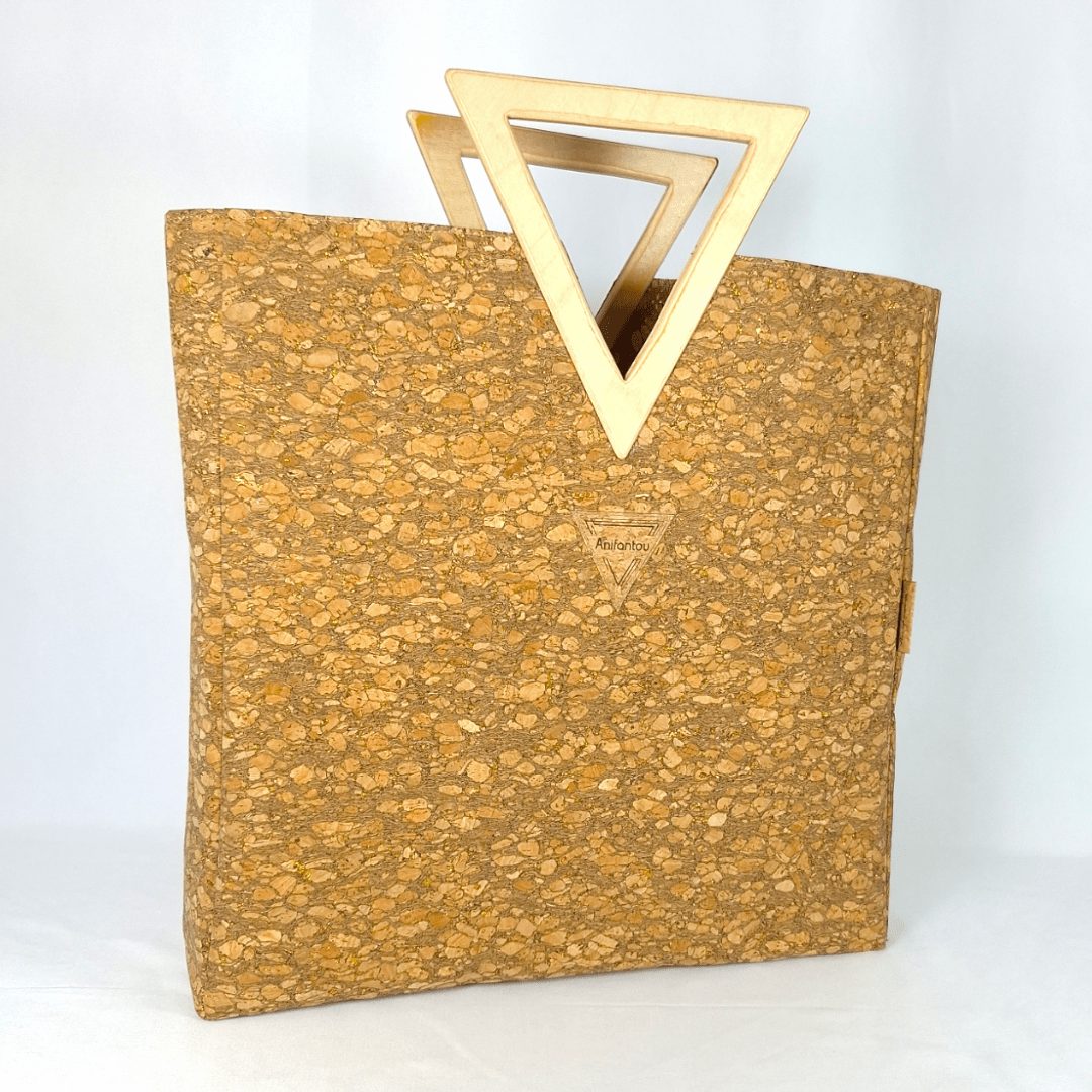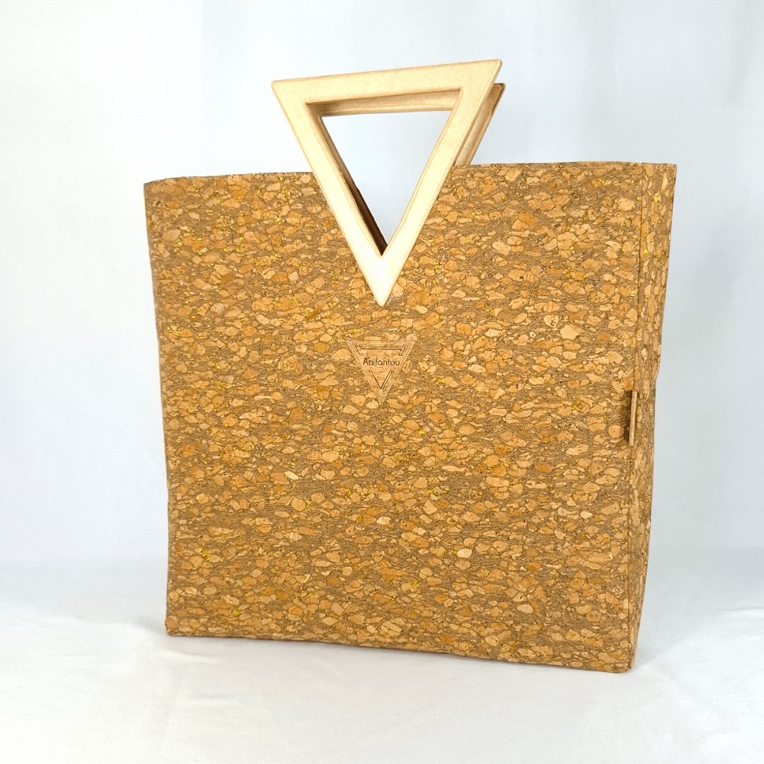 Χειροποίητη μεγάλη τσάντα χειρός με ξύλινη λαβή. Είναι κατασκευασμένη από υψηλής ποιότητας υλικά με προσεγμένο σχέδιο που την κάνει να ξεχωρίζει. Η ξύλινη λαβή σε σχήμα τριγώνου είναι χειροποίητη και το εσωτερικό άνοιγμα της, δίνει την δυνατότητα να περνάει άνετα το χέρι μίας γυναίκας έως και τον αγγόνα της. Έτσι εξασφαλίζουμε τρείς διαφορετικούς τρόπους κρατήματος της τσάντας, ανάλογα την περίσταση. Έχει ευρύχωρο εσωτερικό με τσέπη που κλείνει με φερμουάρ και επιπλέον ανοιχτή τσέπη. Ο φελλός με χρυσαλλίδες είναι εξαιρετικά μαλακό υλικό και η ξύλινη λαβή έχει βελούδινο άγγιγμα.