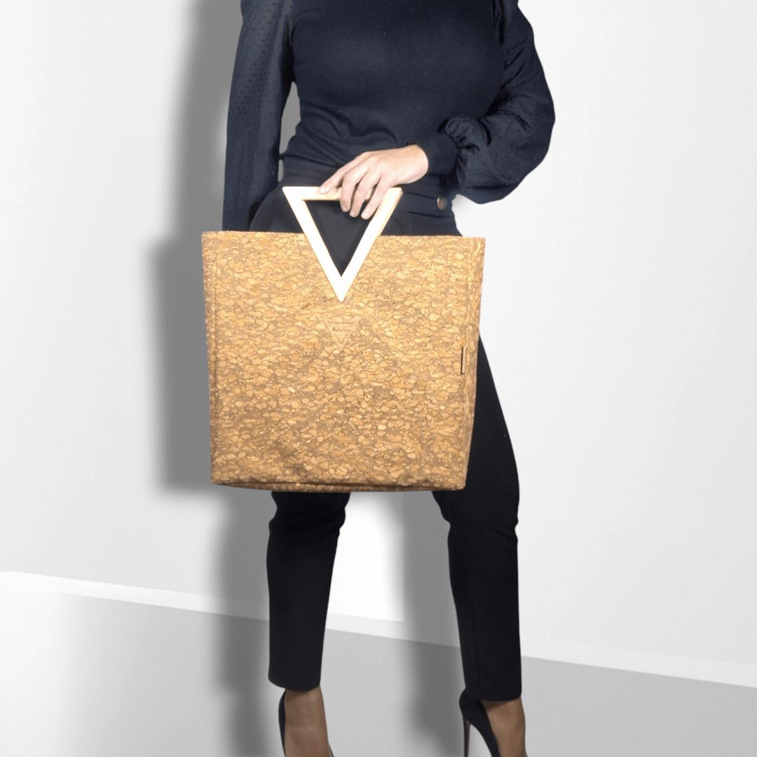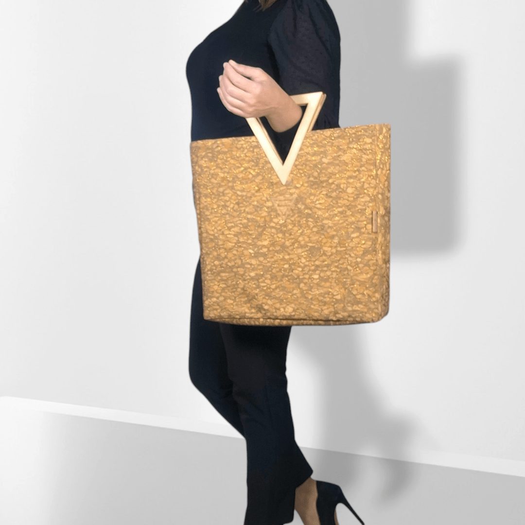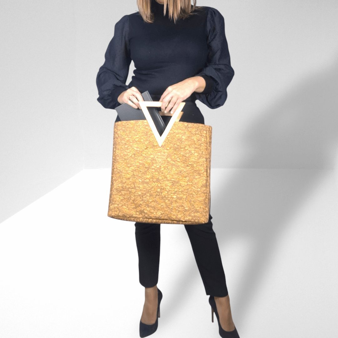 Χειροποίητη μεγάλη τσάντα χειρός με ξύλινη λαβή. Είναι κατασκευασμένη από υψηλής ποιότητας υλικά με προσεγμένο σχέδιο που την κάνει να ξεχωρίζει. Η ξύλινη λαβή σε σχήμα τριγώνου είναι χειροποίητη και το εσωτερικό άνοιγμα της, δίνει την δυνατότητα να περνάει άνετα το χέρι μίας γυναίκας έως και τον αγγόνα της. Έτσι εξασφαλίζουμε τρείς διαφορετικούς τρόπους κρατήματος της τσάντας, ανάλογα την περίσταση. Έχει ευρύχωρο εσωτερικό με τσέπη που κλείνει με φερμουάρ και επιπλέον ανοιχτή τσέπη. Ο φελλός με χρυσαλλίδες είναι εξαιρετικά μαλακό υλικό και η ξύλινη λαβή έχει βελούδινο άγγιγμα.
