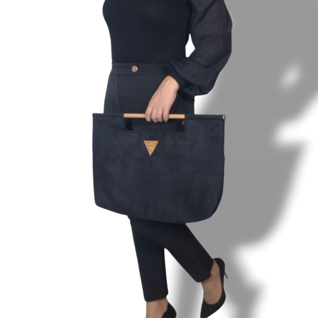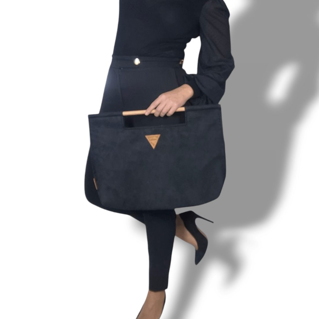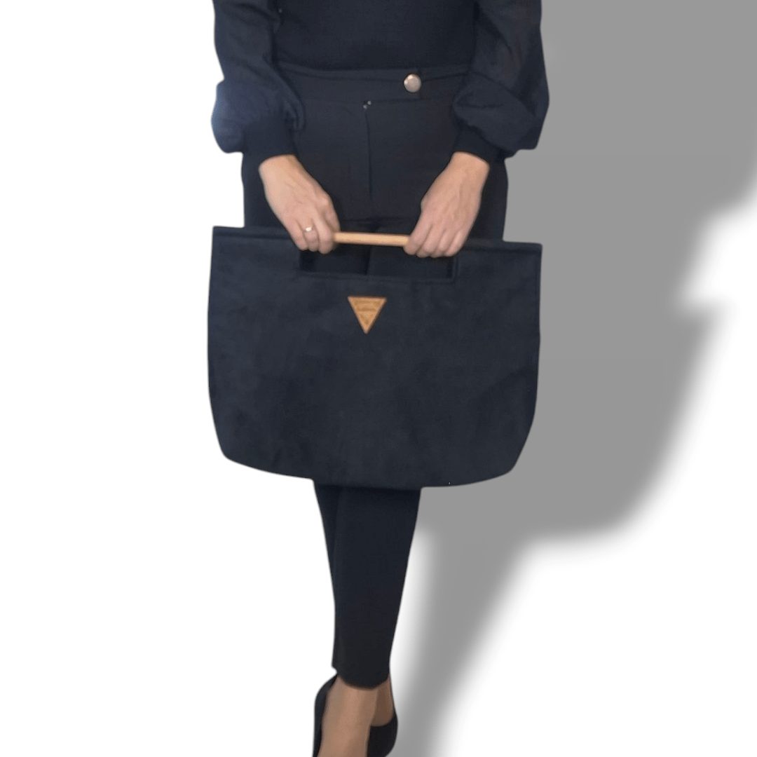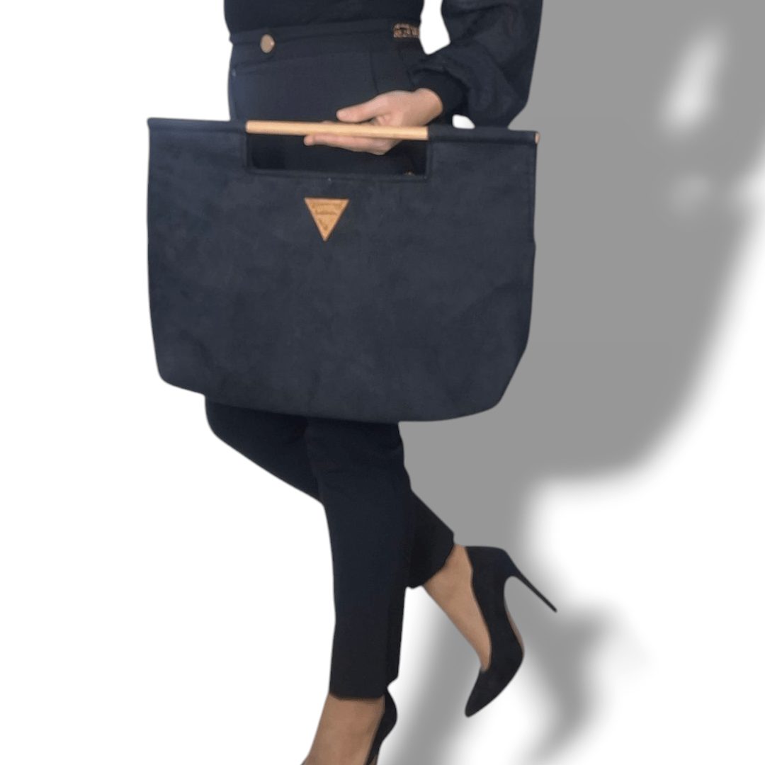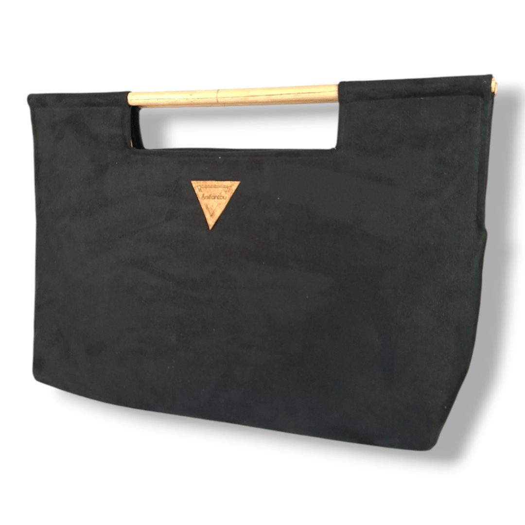 Χειροποίητη τσάντα χειρός με ξύλινη ράβδο για λαβή. Είναι κατασκευασμένη από υψηλής ποιότητας υλικά με προσεγμένο σχέδιο που την κάνει να ξεχωρίζει. Έχει ευρύχωρο εσωτερικό με τσέπη που κλείνει με φερμουάρ και επιπλέον ανοιχτή τσέπη. Το σουέτ μαύρο ύφασμα της είναι εξαιρετικά μαλακό υλικό και η ξύλινη λαβή έχει βελούδινο άγγιγμα.