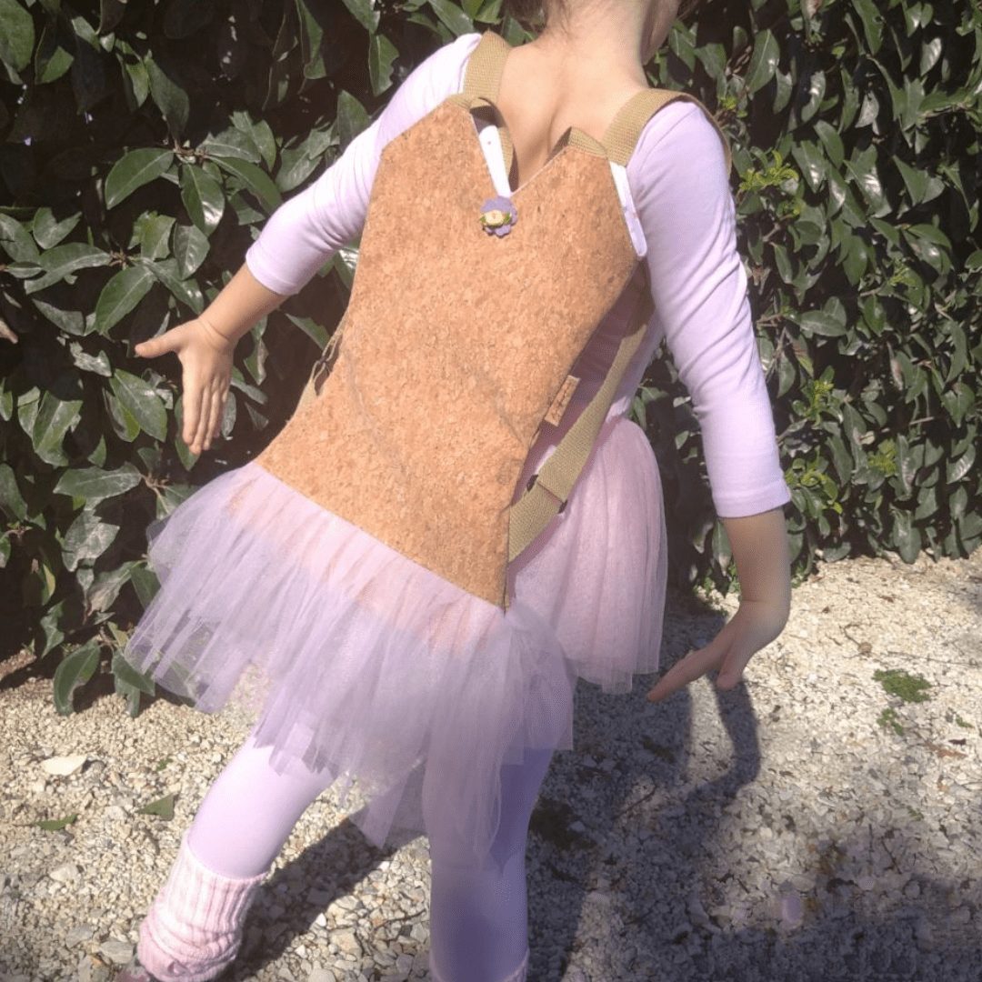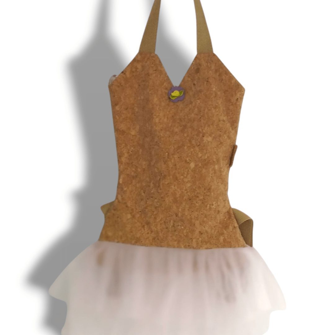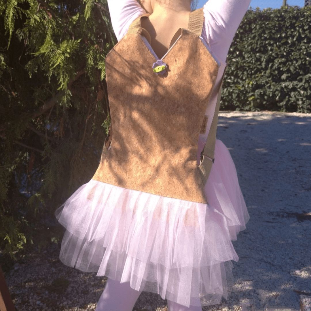 Χειροποίητη τσάντα μπαλέτου. Με ξεχωριστό σχέδιο σώμα μπαλαρίνας. Από ύφασμα φελλού και τούλι. Διαθέτει ρυθμιζόμενους συνθετικούς ιμάντες. Ευρύχωρο εσωτερικό, με τσέπη που κλείνει με φερμουάρ και επιπλέον ανοιχτή τσέπη.