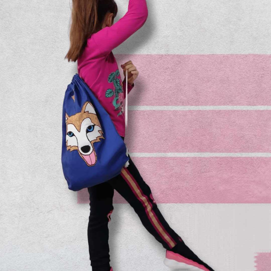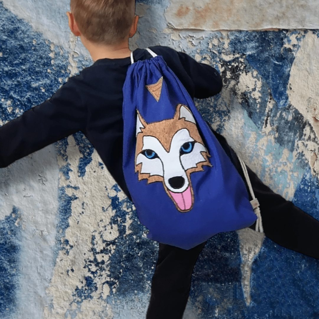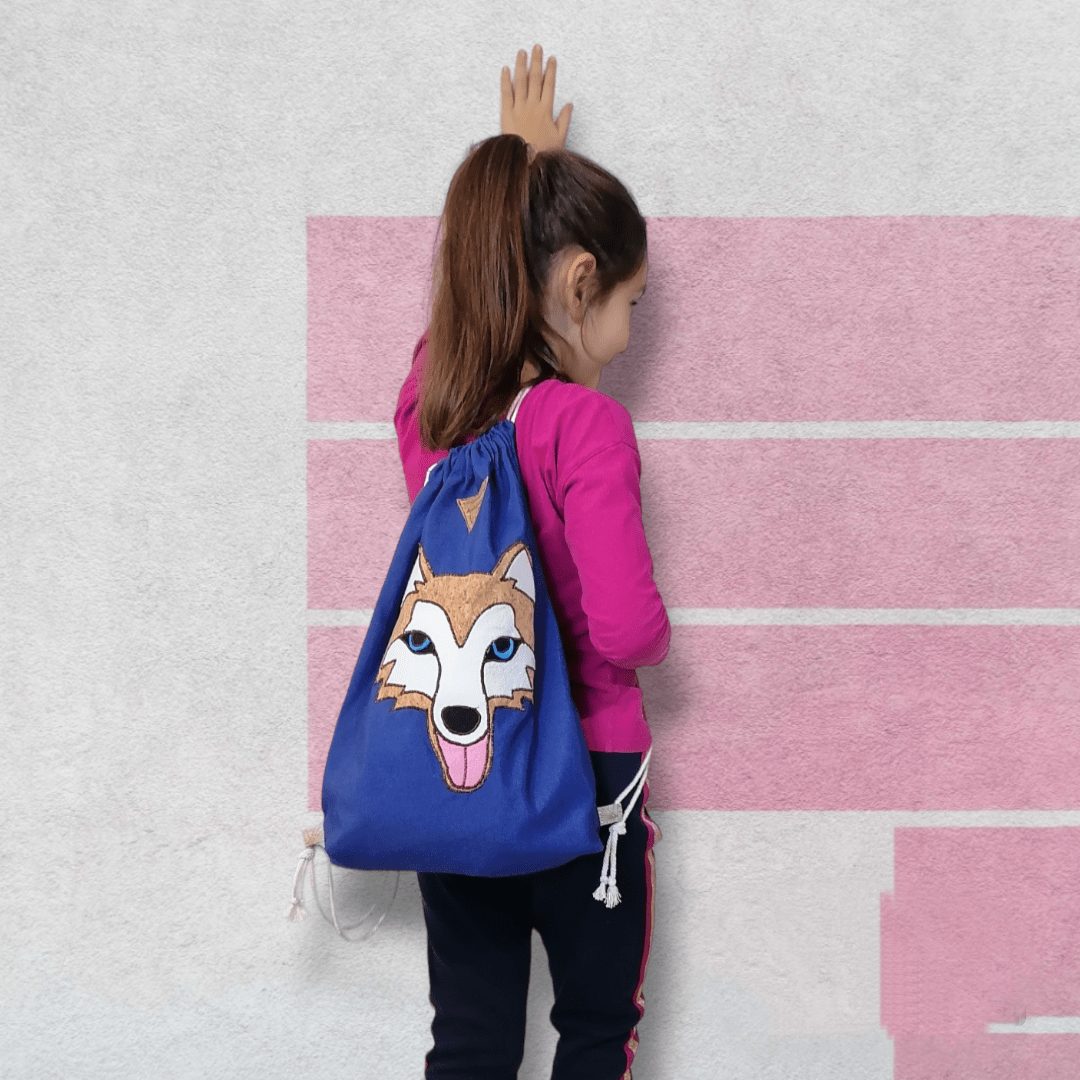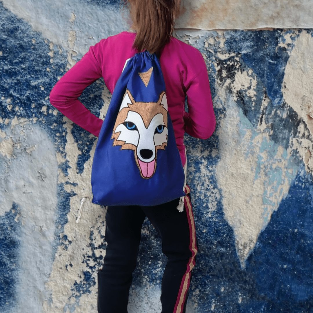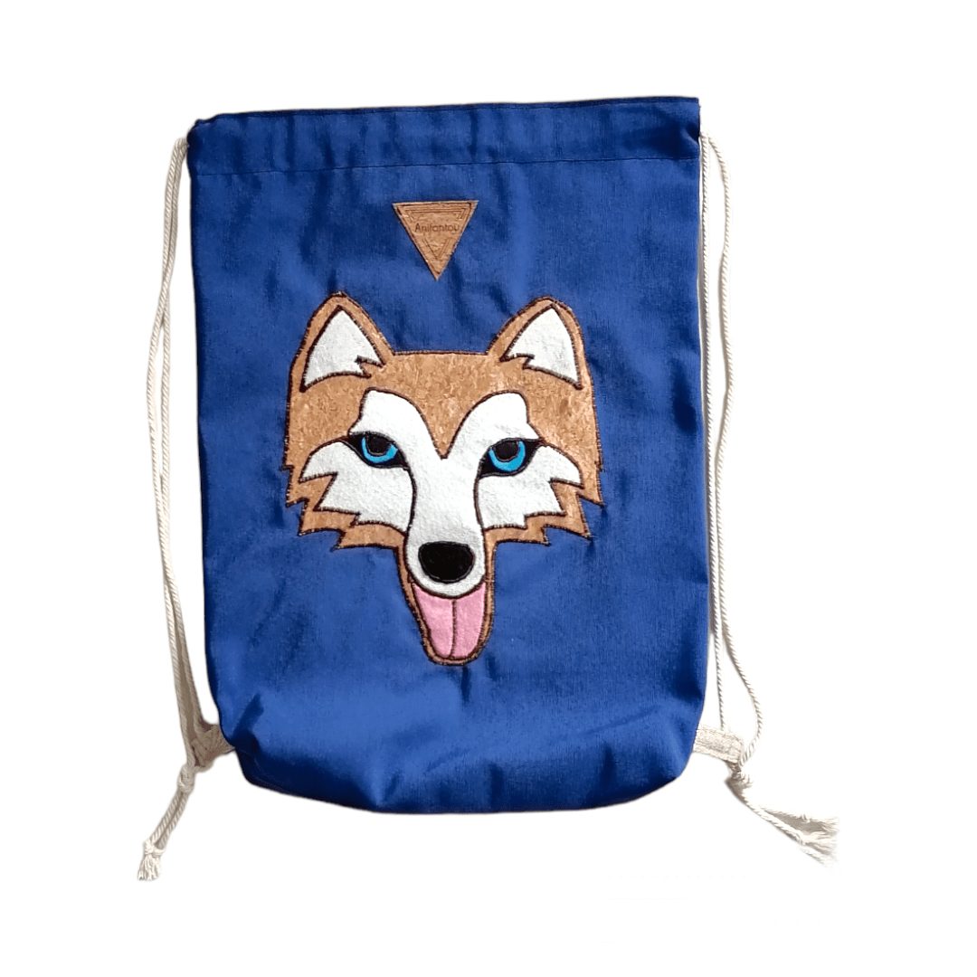 Χειροποίητο, σακίδιο πλάτης με κορδόνια βαμβακερά. Με ξεχωριστό σχέδιο Χάσκη. Κατασκευασμένο από μπλε βαμβακερό ύφασμα. Ευρύχωρο εσωτερικό, με μία ανοιχτή τσέπη.