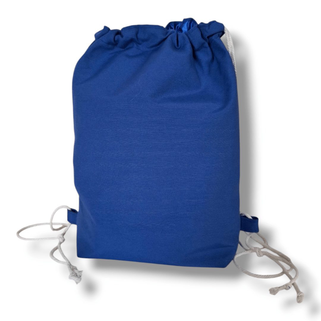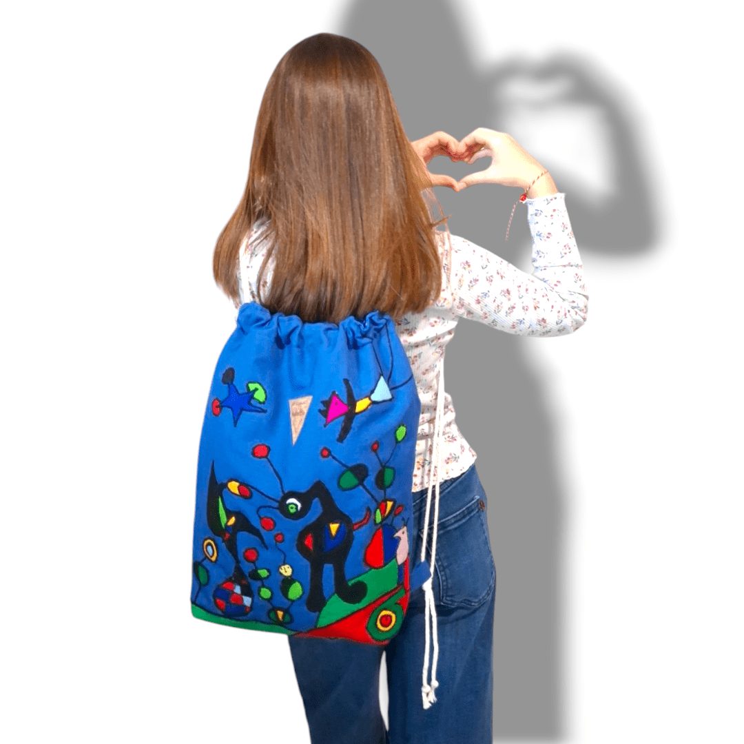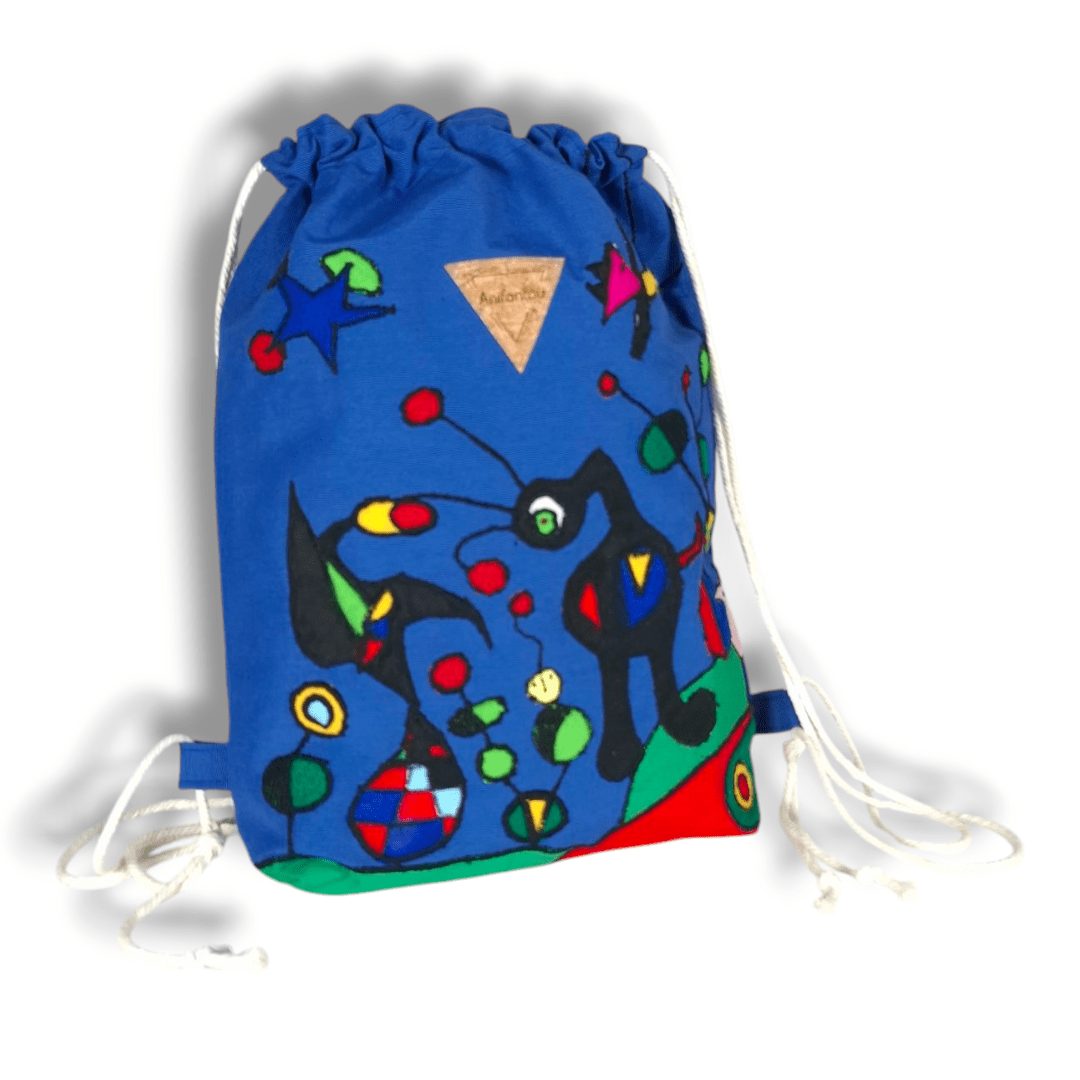 Χειροποίητο, σακίδιο πλάτης με κορδόνια βαμβακερά. Με ξεχωριστό σχέδιο εμπνευσμένο από την τέχνη του Joan Miro. Κατασκευασμένο από μπλέ βαμβακερό ύφασμα. Ευρύχωρο εσωτερικό, με μία ανοιχτή τσέπη.