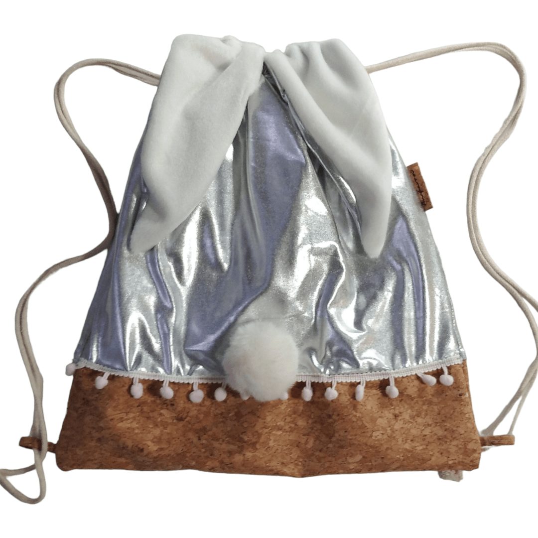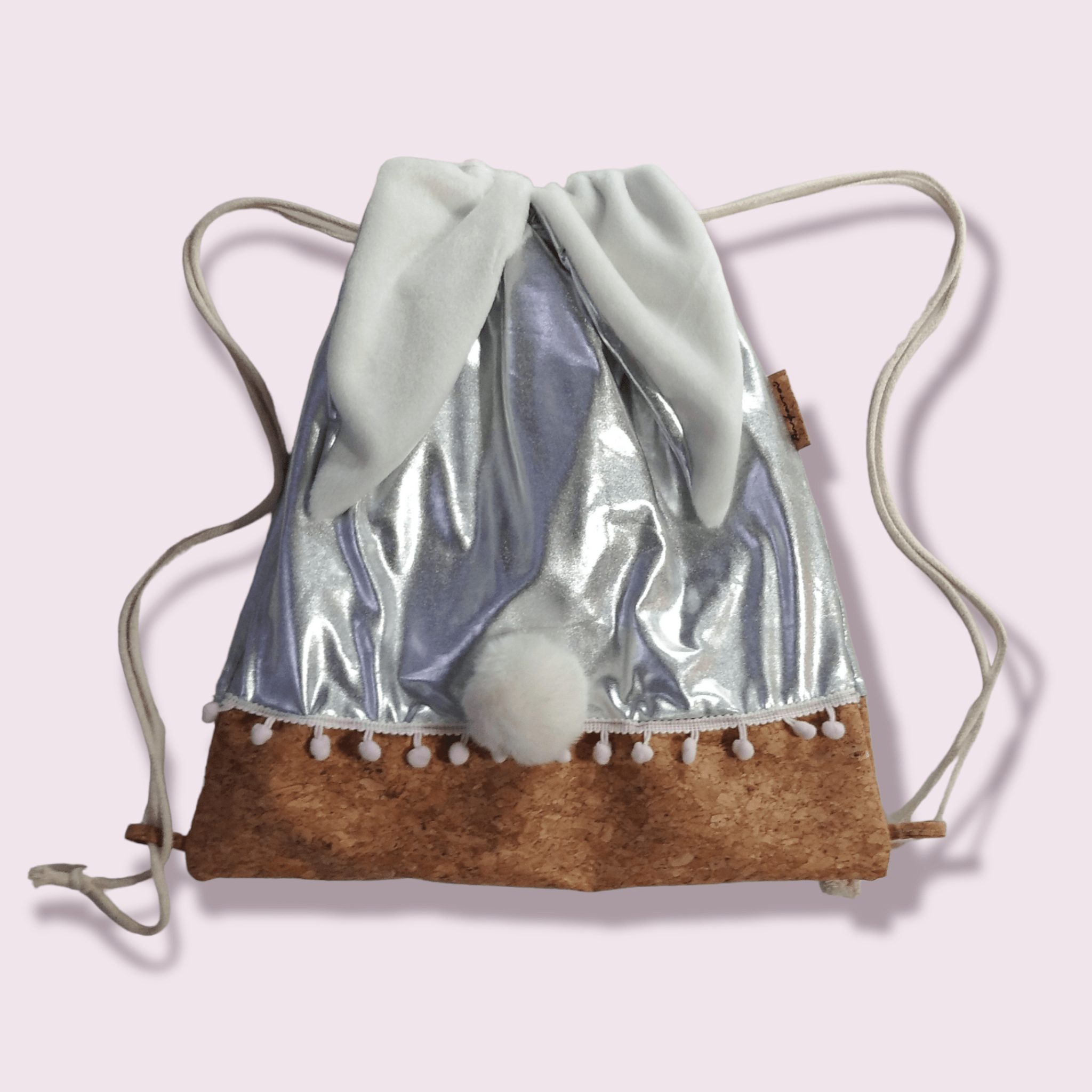 Χειροποίητο, σακίδιο πλάτης με κορδόνια βαμβακερά. Με ξεχωριστό σχέδιο λαγού. Κατασκευασμένο από γυαλιστερό ασημί ύφασμα και ύφασμα φελλού. Ευρύχωρο εσωτερικό, με μία ανοιχτή τσέπη.