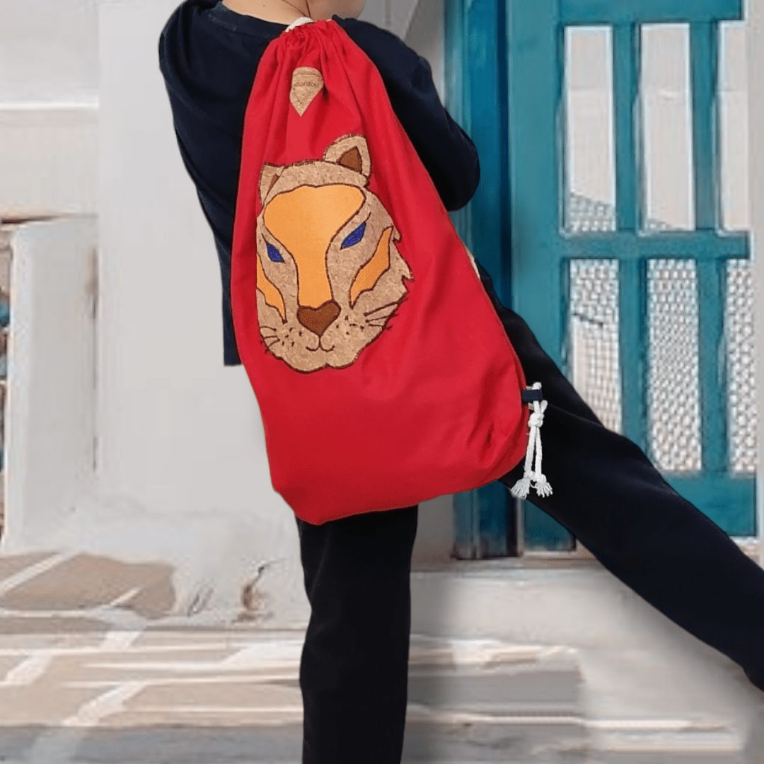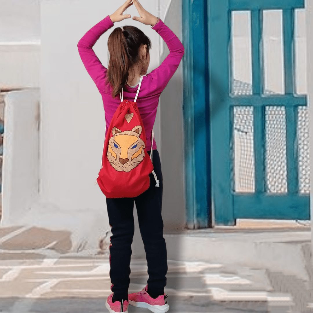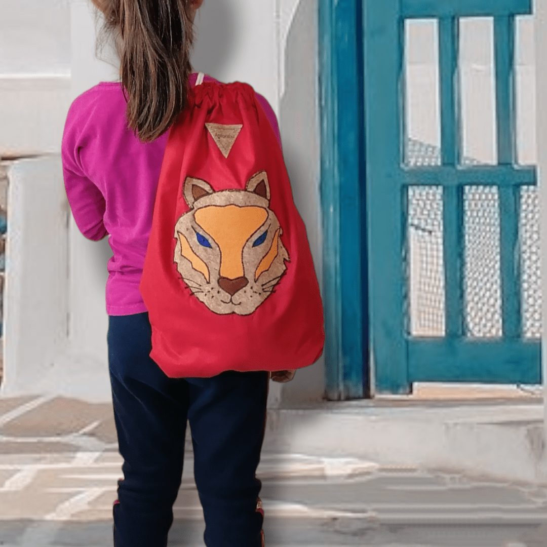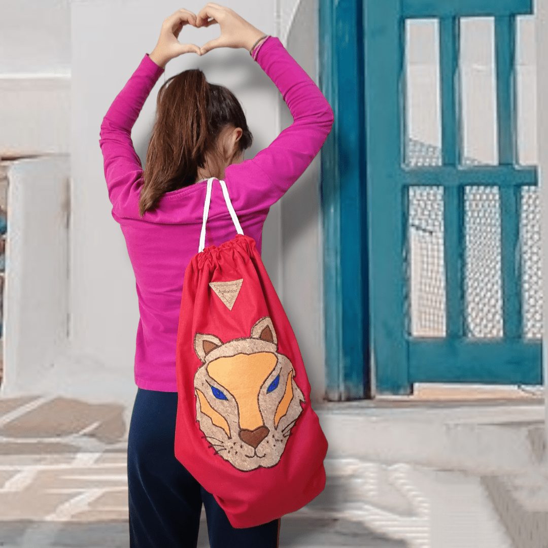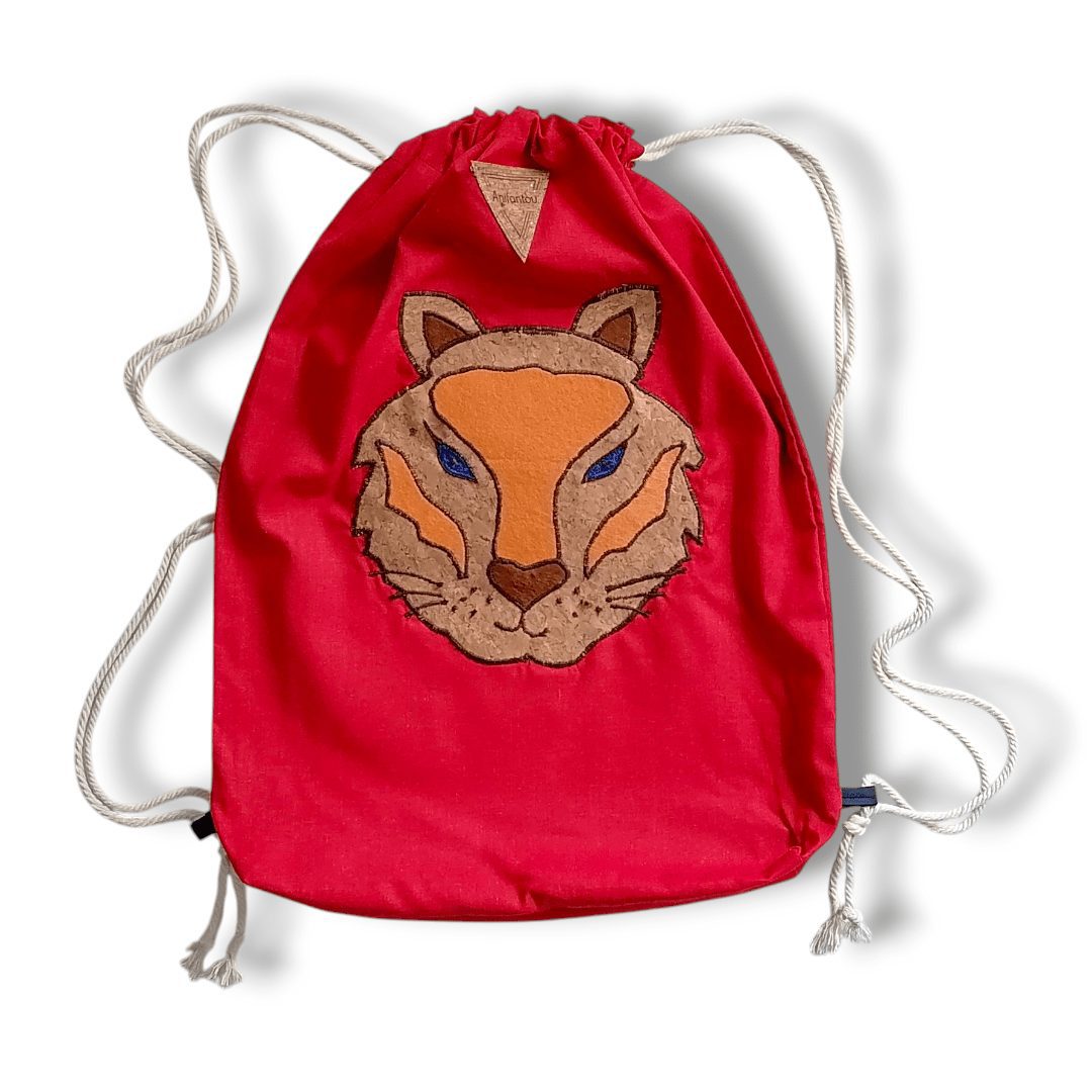 Χειροποίητο, σακίδιο πλάτης με κορδόνια βαμβακερά. Με ξεχωριστό σχέδιο τίγρης. Κατασκευασμένο από κόκκινο βαμβακερό ύφασμα. Ευρύχωρο εσωτερικό, με μία ανοιχτή τσέπη.