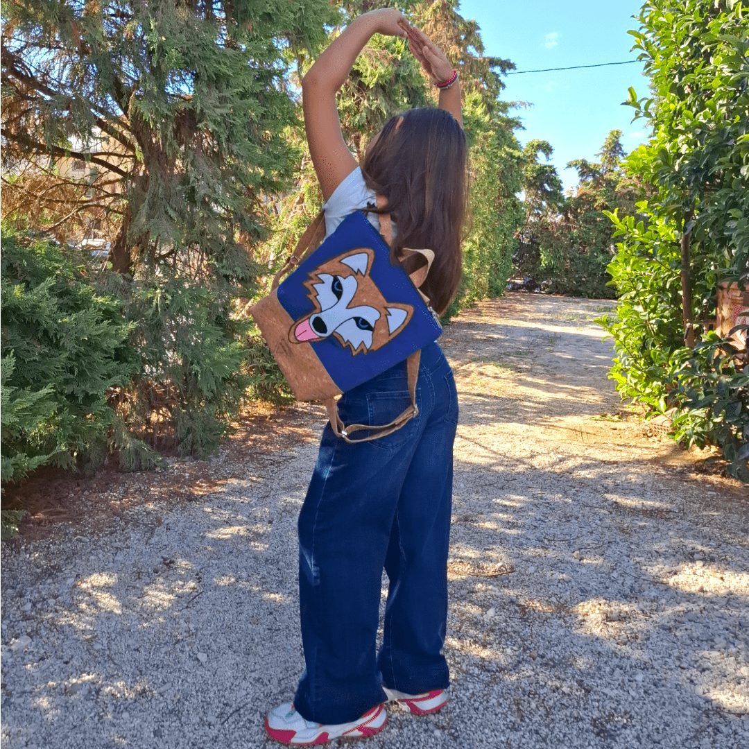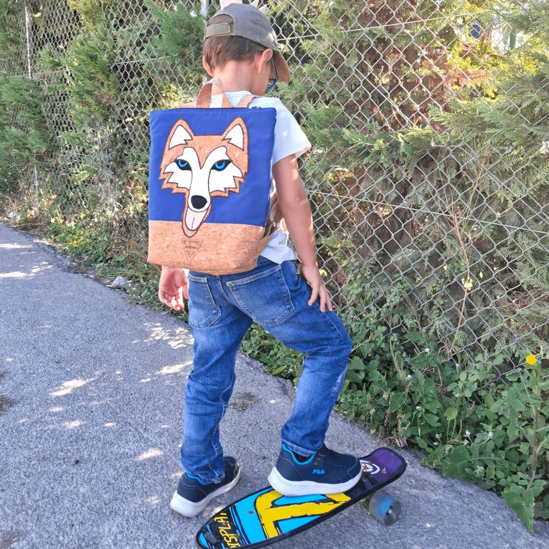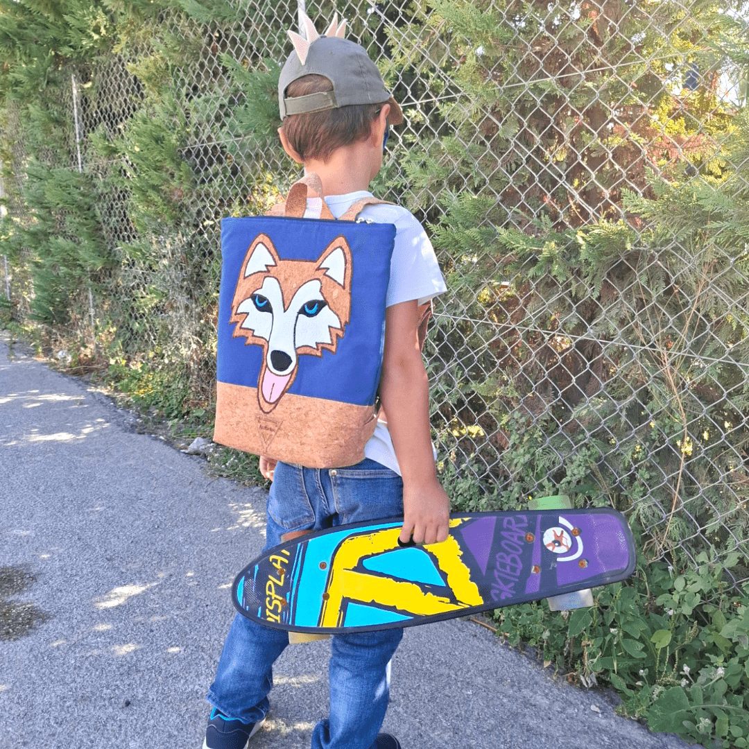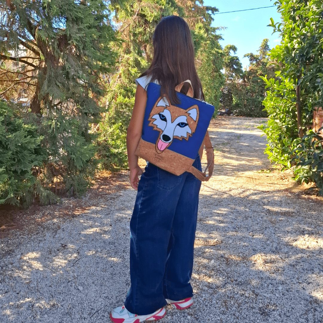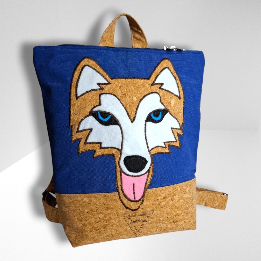 Χειροποίητο, παιδικό σακίδιο πλάτης. Με ξεχωριστό σχέδιο Χάσκυ. Από ύφασμα φελλού και μπλε βαμβακερό ύφασμα. Κλείσιμο με φερμουάρ, με διπλούς οδηγούς για μεγαλύτερη άνεση στο άνοιγμα της. Διαθέτει ρυθμιζόμενους ιμάντες από ύφασμα φελλού. Ευρύχωρο εσωτερικό, με τσέπη που κλείνει με φερμουάρ και επιπλέον ανοιχτή τσέπη.