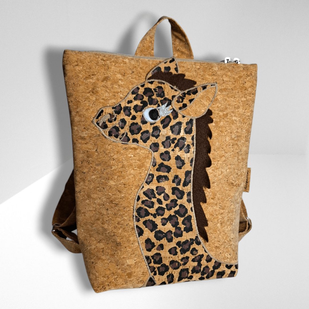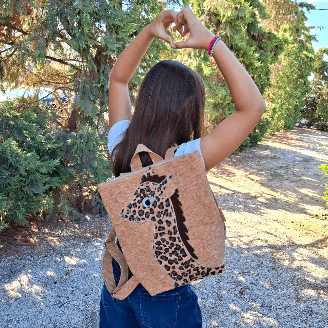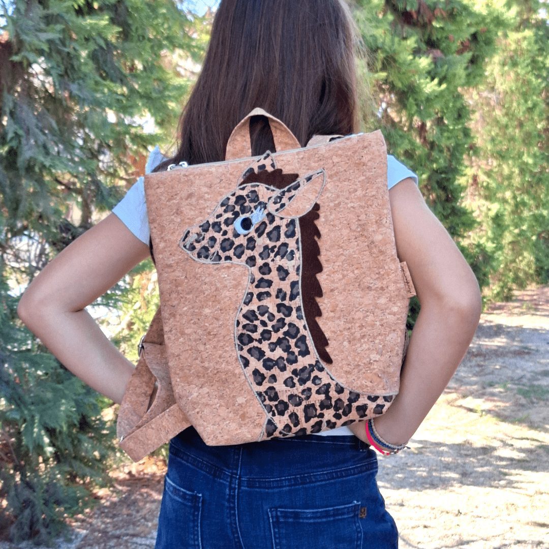 Χειροποίητο, παιδικό σακίδιο πλάτης. Με ξεχωριστό σχέδιο Καμηλοπάρδαλης. Από ύφασμα φελλού. Κλείσιμο με φερμουάρ, με διπλούς οδηγούς για μεγαλύτερη άνεση στο άνοιγμα της. Διαθέτει ρυθμιζόμενους ιμάντες από ύφασμα φελλού. Ευρύχωρο εσωτερικό, με τσέπη που κλείνει με φερμουάρ και επιπλέον ανοιχτή τσέπη.